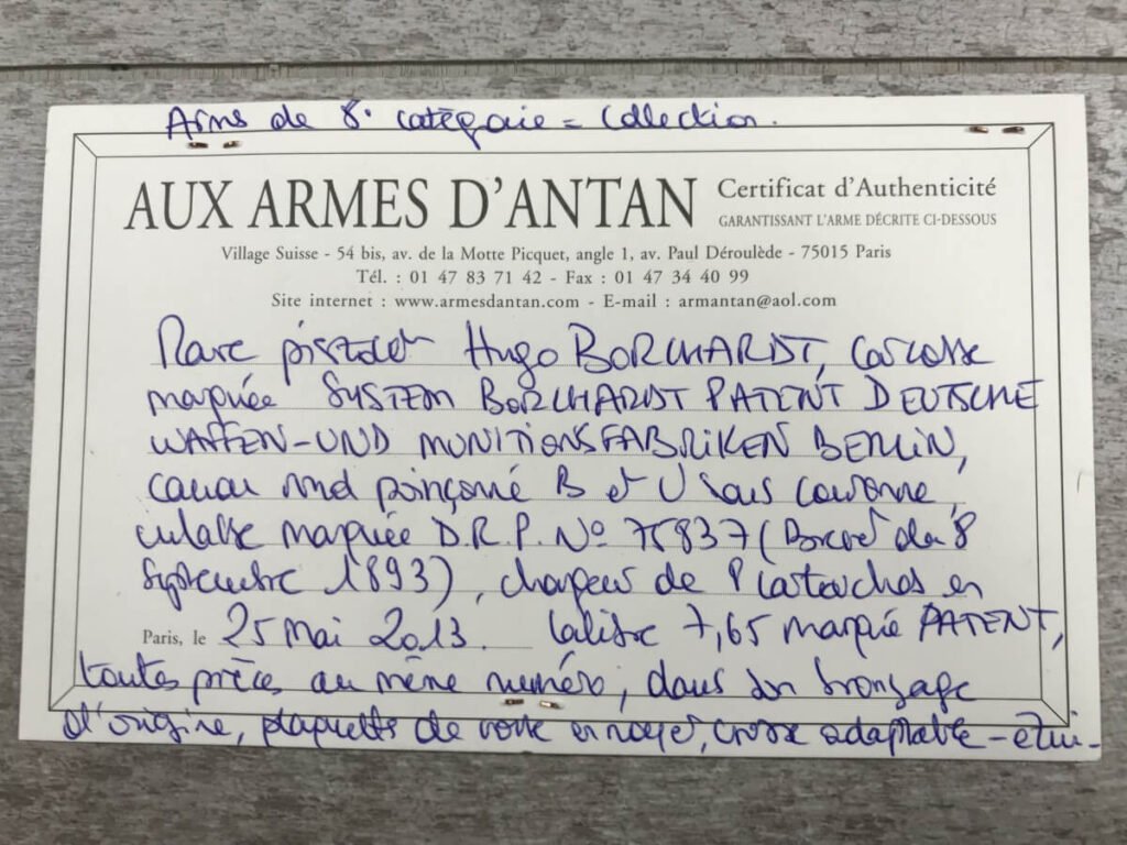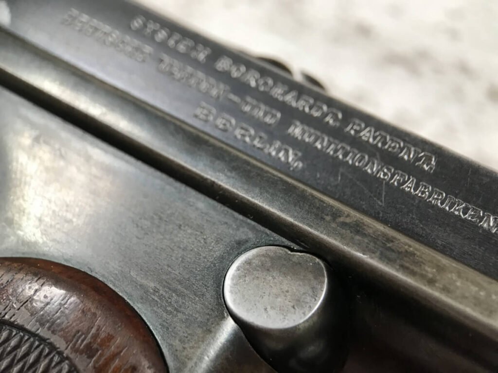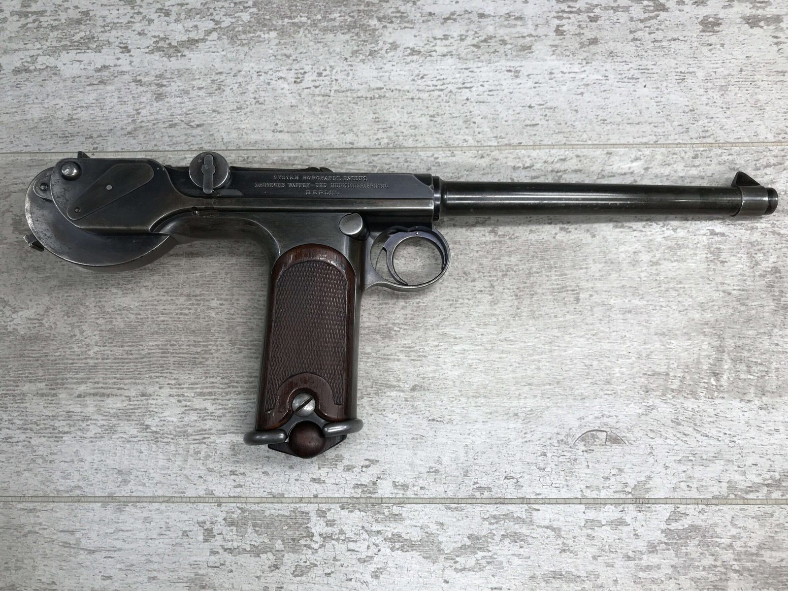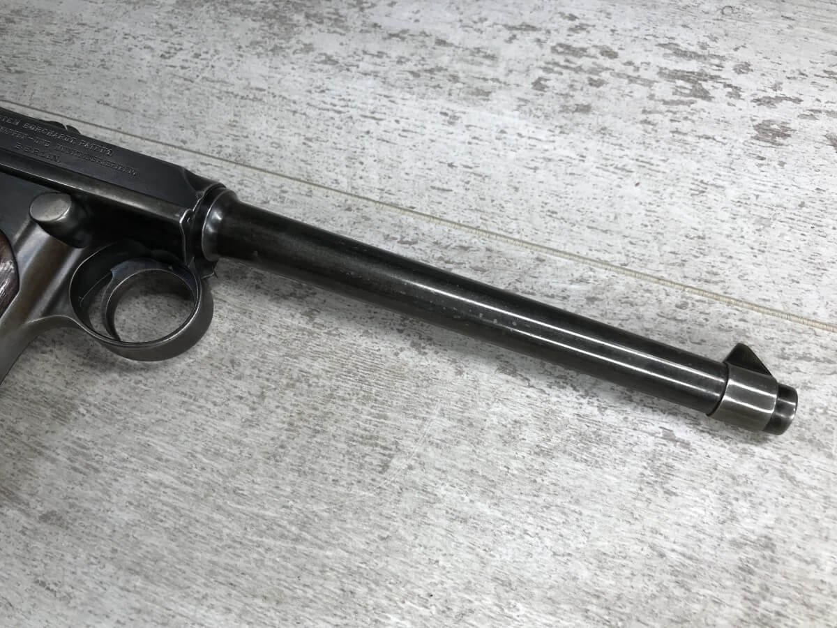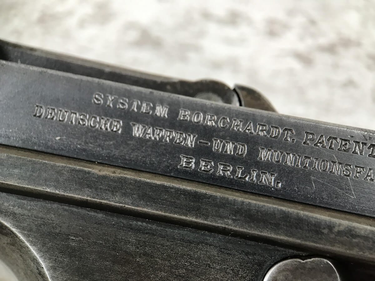 DWM MODEL 1893 BORCHARDT SEMI-AUTOMATIC PISTOL W/SHOULDER STOCK #1981, 7.63MM CAL, 7 1/2″ BBL “SYSTEM BORCHARDT. PATENT./DEUTSCHE WAFFEN-UND MUNITIONSFABRIKEN,/BERLIN.” ON RIGHT SIDE OF RECEIVER, “D.R.P./NO. 75837” ON TOP OF THE TOGGLE, EVERYTHING MATCHING, CORRECT PROOFS, 85% OF ORIGINAL FINISH W/SOME PATINA, SCATTERED SPOTTING, LIGHT EDGE WEAR AND HANDLING MARKS, EXC MATCHING GRIPS, EXC MATCHING MAG, MATCHING LEATHER HOLSTER/STOCK, BORE HAS FROSTING THROUGHOUT W/GOOD RIFLING, MECHANICALLY EXCELLENT, VERY RARE, AUX ARMES D’ANTAN CERTIFICATE OF AUTHENTICITY INCLUDED