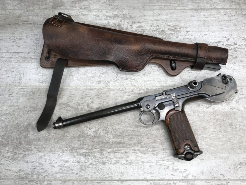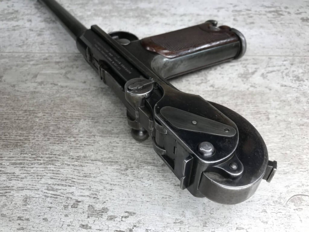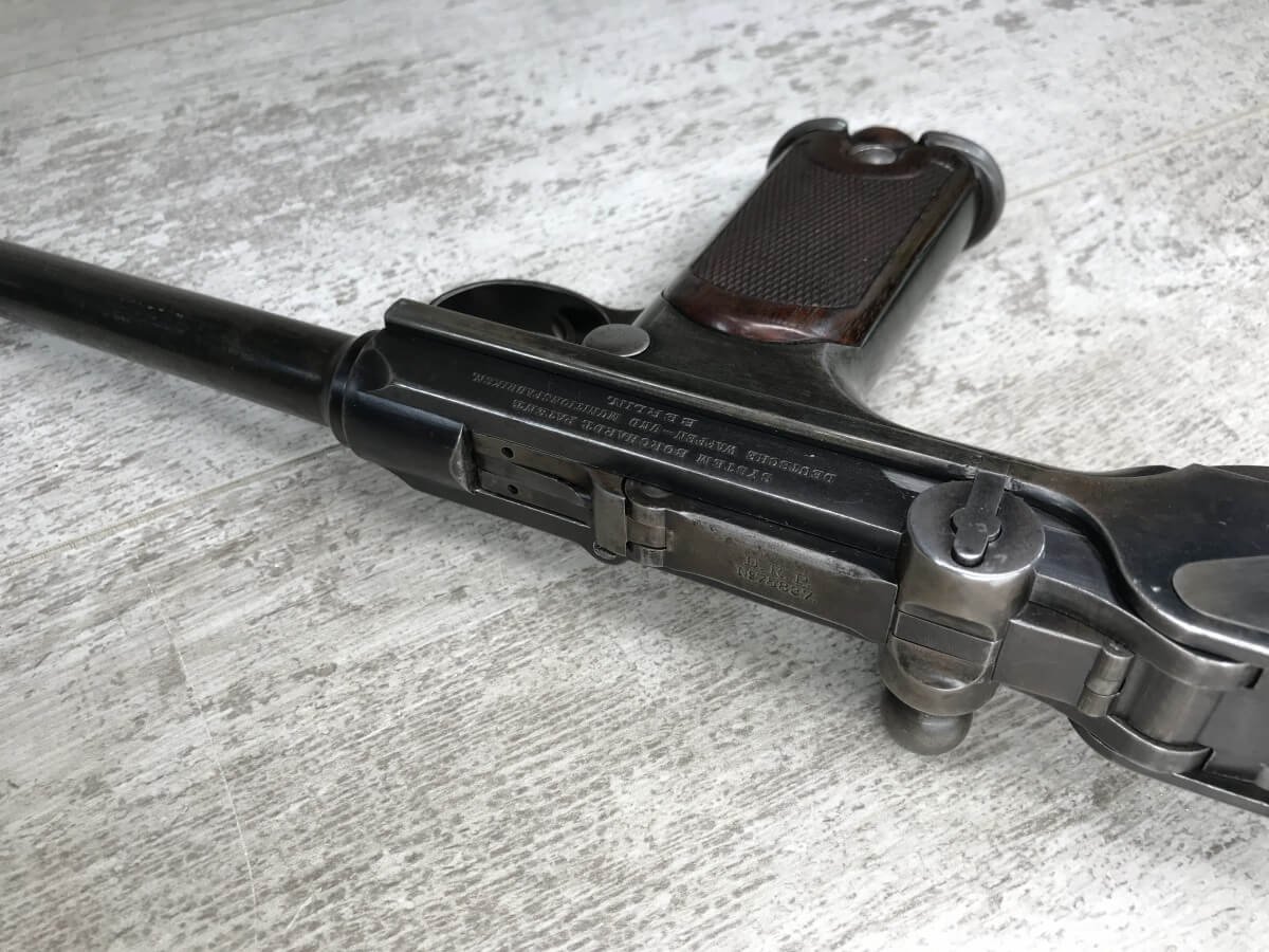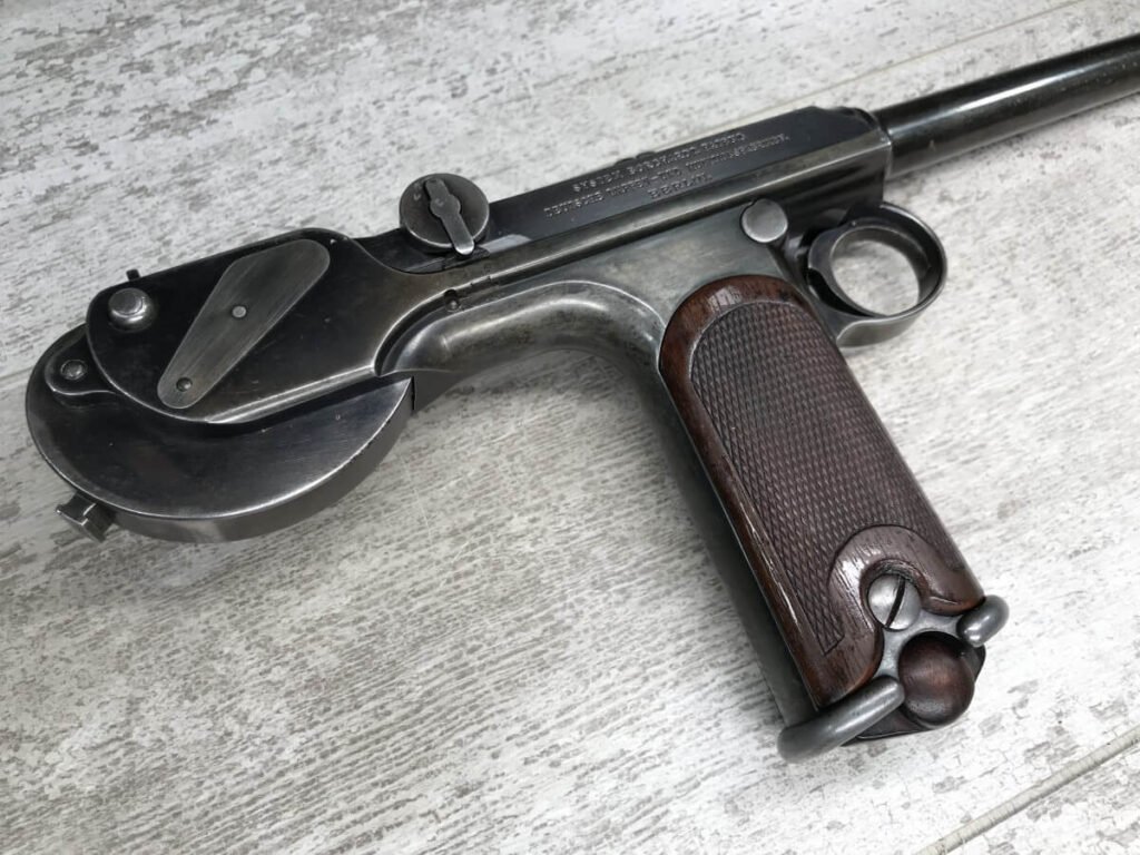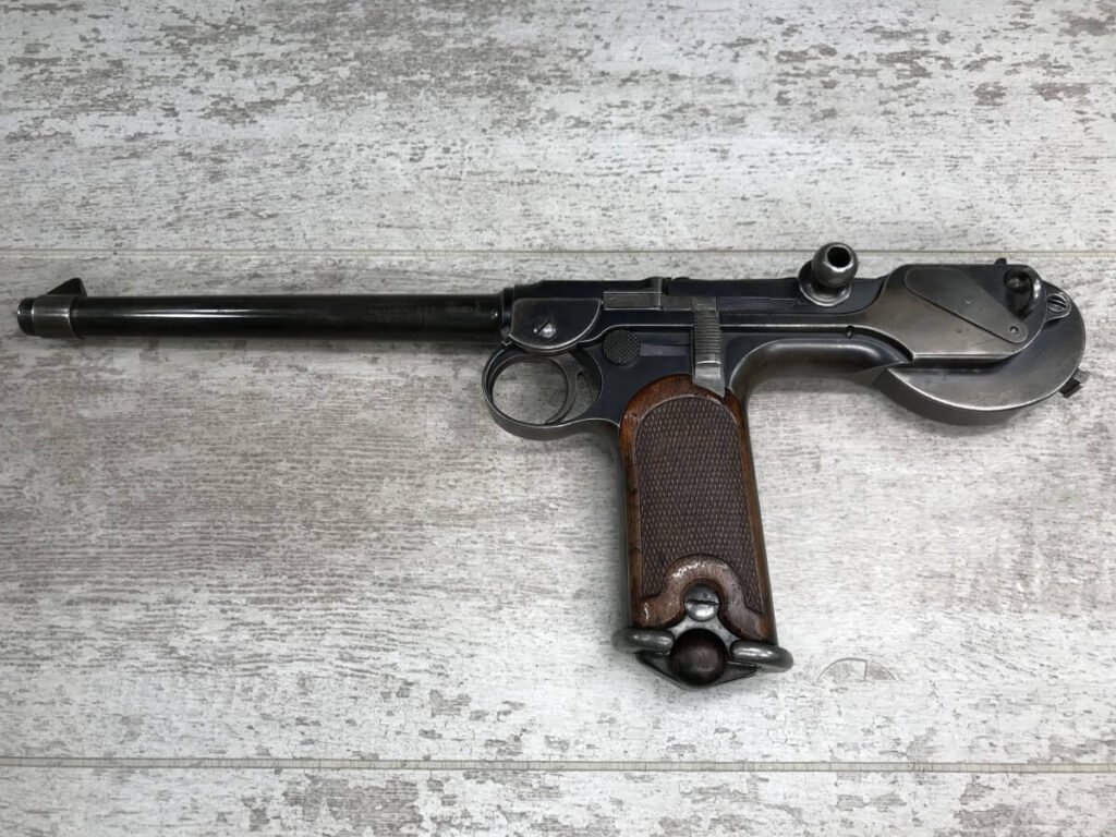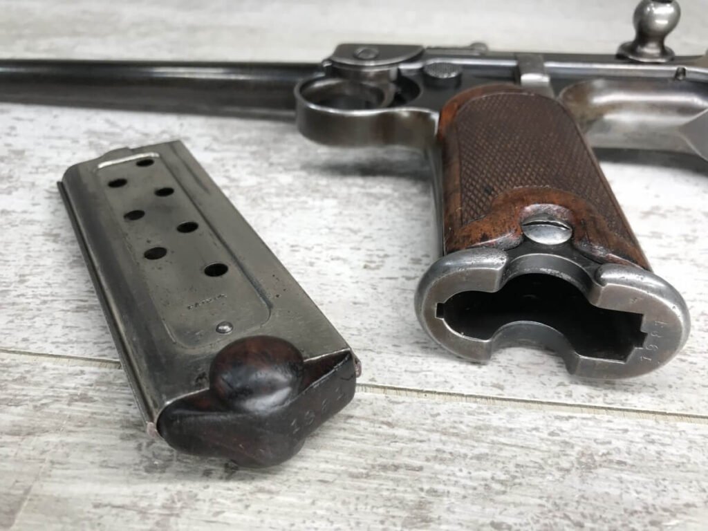 DWM MODEL 1893 BORCHARDT SEMI-AUTOMATIC PISTOL W/SHOULDER STOCK #1981, 7.63MM CAL, 7 1/2″ BBL “SYSTEM BORCHARDT. PATENT./DEUTSCHE WAFFEN-UND MUNITIONSFABRIKEN,/BERLIN.” ON RIGHT SIDE OF RECEIVER, “D.R.P./NO. 75837” ON TOP OF THE TOGGLE, EVERYTHING MATCHING, CORRECT PROOFS, 85% OF ORIGINAL FINISH W/SOME PATINA, SCATTERED SPOTTING, LIGHT EDGE WEAR AND HANDLING MARKS, EXC MATCHING GRIPS, EXC MATCHING MAG, MATCHING LEATHER HOLSTER/STOCK, BORE HAS FROSTING THROUGHOUT W/GOOD RIFLING, MECHANICALLY EXCELLENT, VERY RARE, AUX ARMES D’ANTAN CERTIFICATE OF AUTHENTICITY INCLUDED