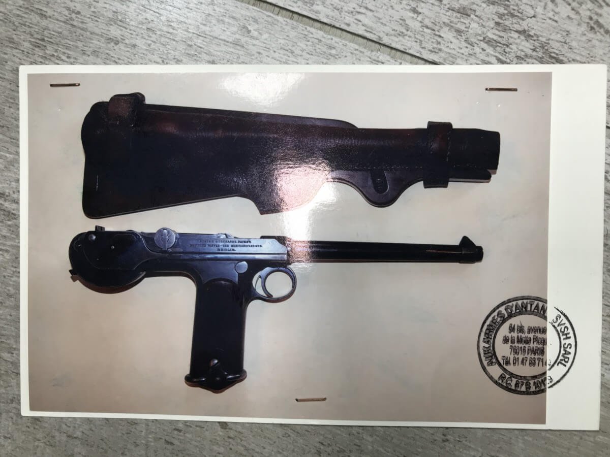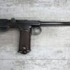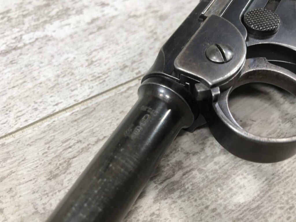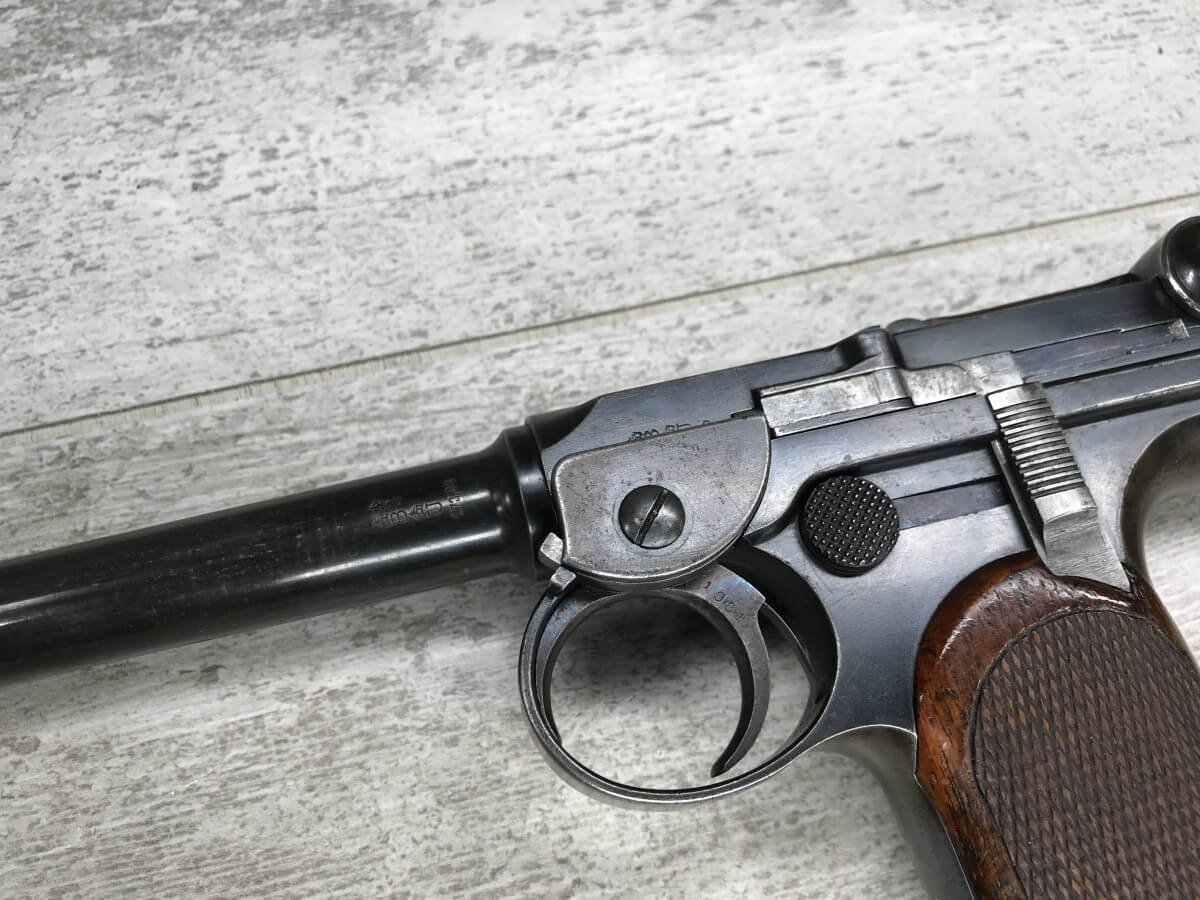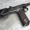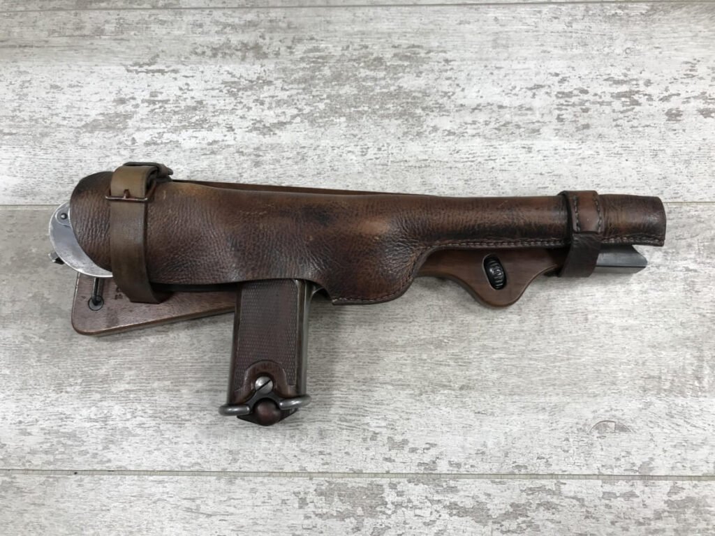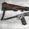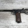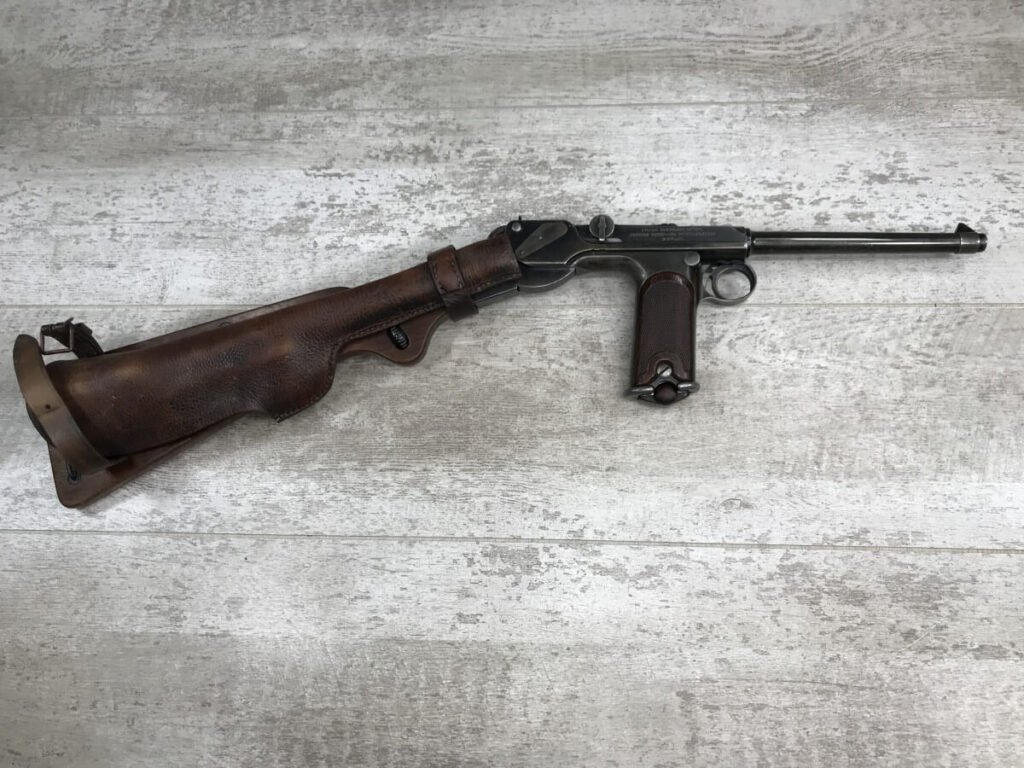 DWM MODEL 1893 BORCHARDT SEMI-AUTOMATIC PISTOL W/SHOULDER STOCK #1981, 7.63MM CAL, 7 1/2″ BBL “SYSTEM BORCHARDT. PATENT./DEUTSCHE WAFFEN-UND MUNITIONSFABRIKEN,/BERLIN.” ON RIGHT SIDE OF RECEIVER, “D.R.P./NO. 75837” ON TOP OF THE TOGGLE, EVERYTHING MATCHING, CORRECT PROOFS, 85% OF ORIGINAL FINISH W/SOME PATINA, SCATTERED SPOTTING, LIGHT EDGE WEAR AND HANDLING MARKS, EXC MATCHING GRIPS, EXC MATCHING MAG, MATCHING LEATHER HOLSTER/STOCK, BORE HAS FROSTING THROUGHOUT W/GOOD RIFLING, MECHANICALLY EXCELLENT, VERY RARE, AUX ARMES D’ANTAN CERTIFICATE OF AUTHENTICITY INCLUDED