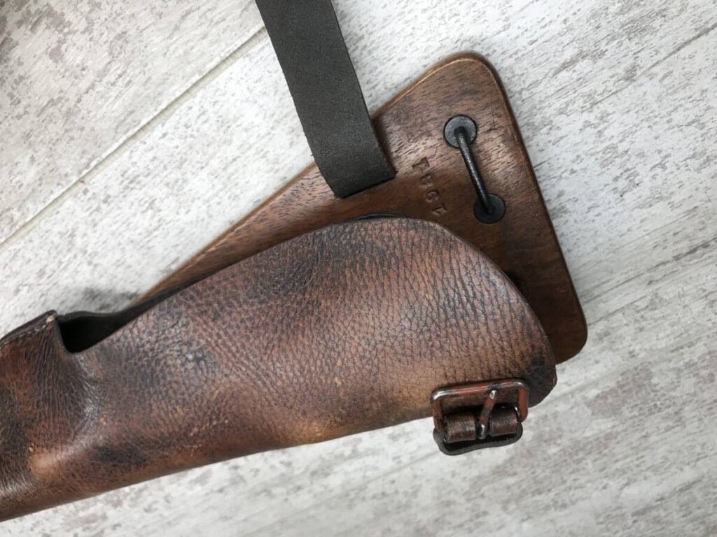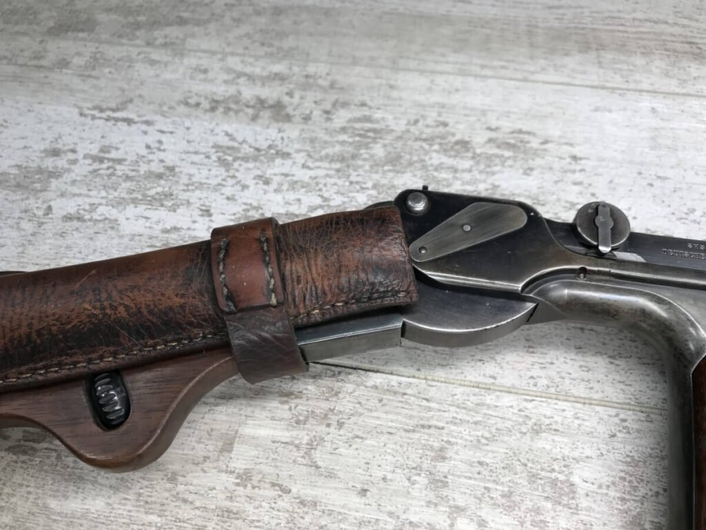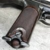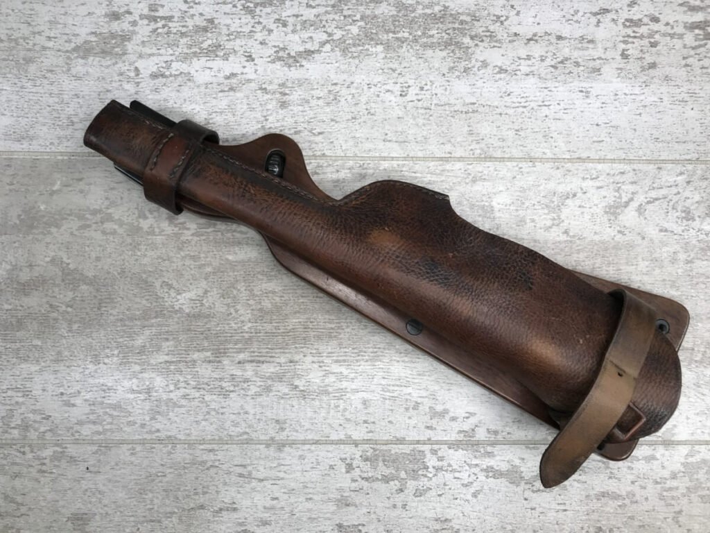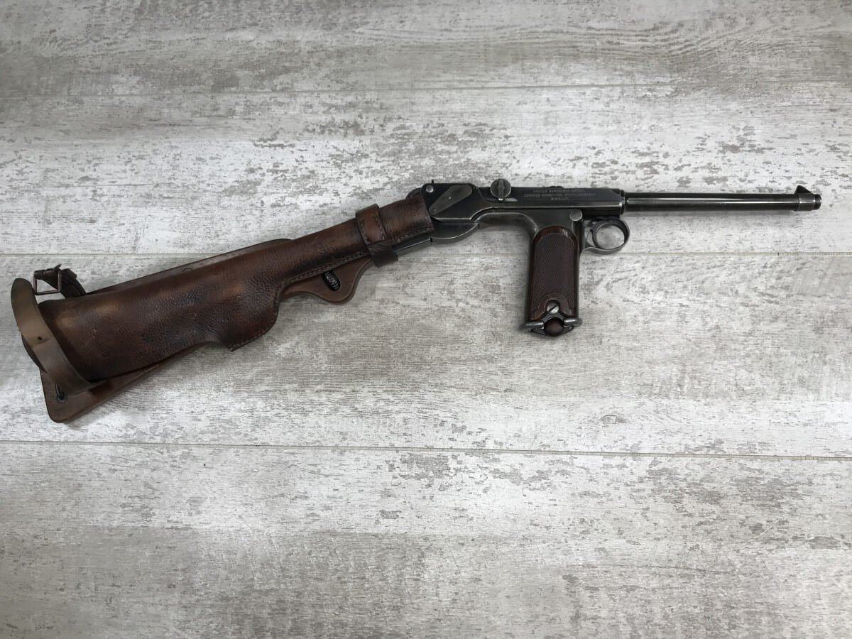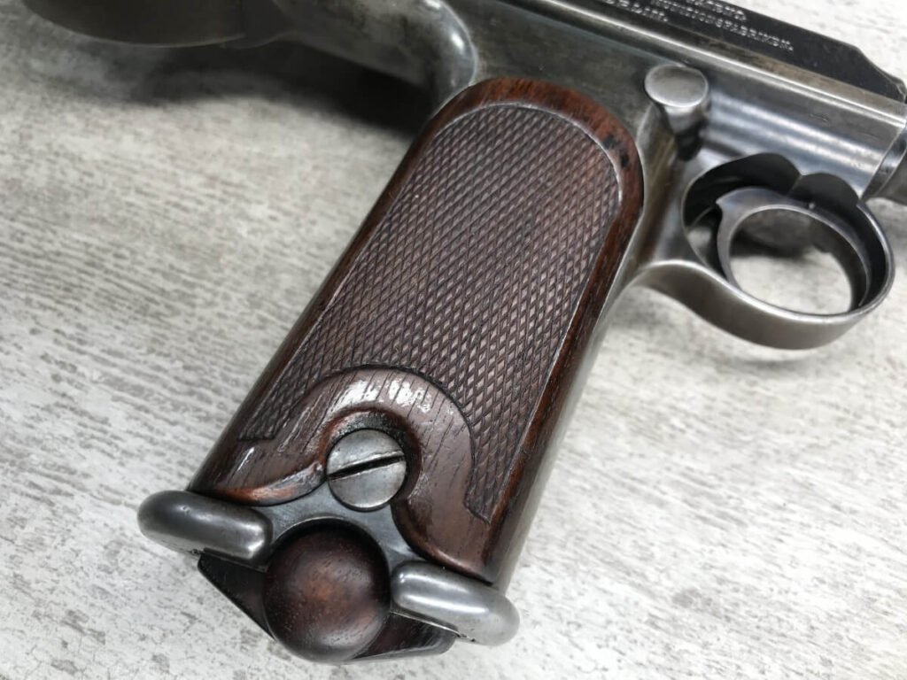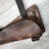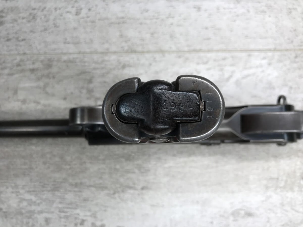DWM MODEL 1893 BORCHARDT SEMI-AUTOMATIC PISTOL W/SHOULDER STOCK #1981, 7.63MM CAL, 7 1/2″ BBL “SYSTEM BORCHARDT. PATENT./DEUTSCHE WAFFEN-UND MUNITIONSFABRIKEN,/BERLIN.” ON RIGHT SIDE OF RECEIVER, “D.R.P./NO. 75837” ON TOP OF THE TOGGLE, EVERYTHING MATCHING, CORRECT PROOFS, 85% OF ORIGINAL FINISH W/SOME PATINA, SCATTERED SPOTTING, LIGHT EDGE WEAR AND HANDLING MARKS, EXC MATCHING GRIPS, EXC MATCHING MAG, MATCHING LEATHER HOLSTER/STOCK, BORE HAS FROSTING THROUGHOUT W/GOOD RIFLING, MECHANICALLY EXCELLENT, VERY RARE, AUX ARMES D’ANTAN CERTIFICATE OF AUTHENTICITY INCLUDED