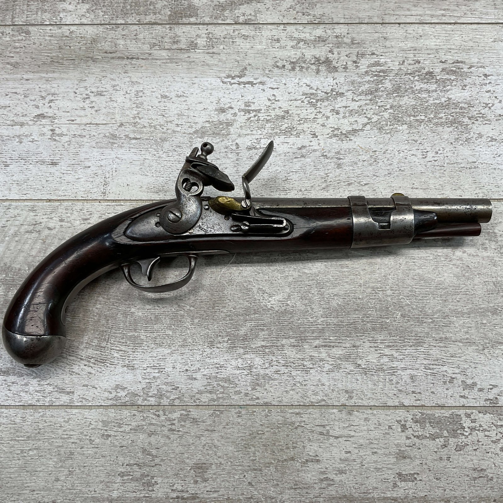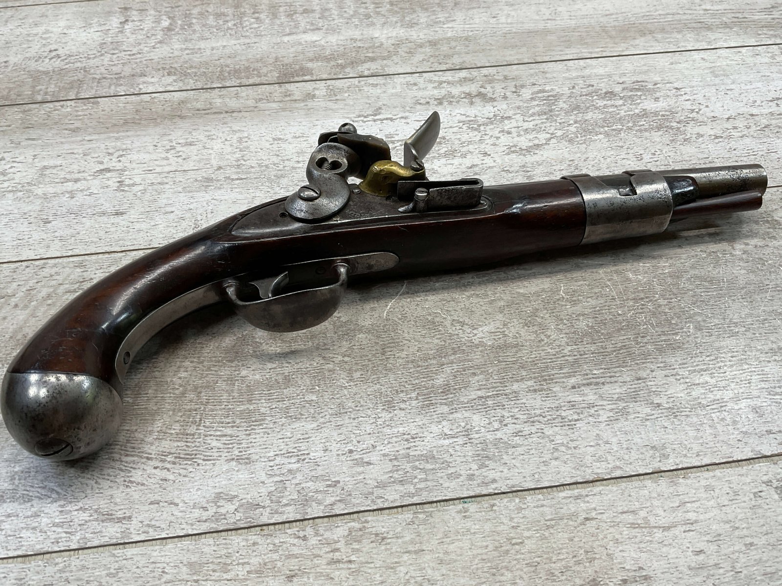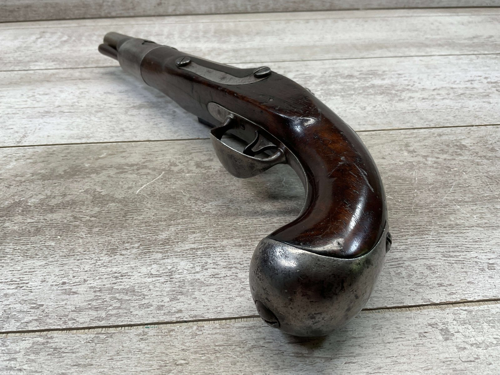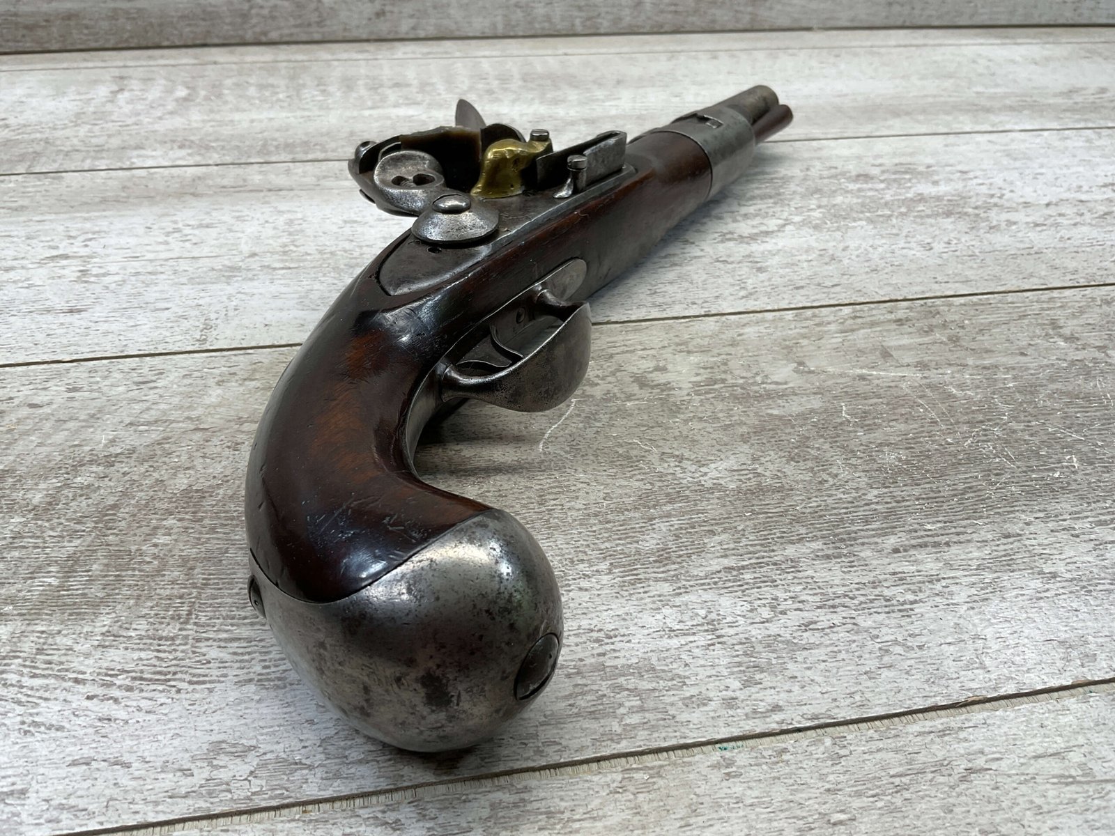 EAST INDIA CO. 1813 FLINTLOCK .69 CAL PISTOL, ANTIQUE #NSN, 8″ BBL, REPAIRED GRIP, EAST INDIA CO. CONDEMED MARKS ON LOCK & BBL, METAL RAM ROD, FLINT, GREAT PIECE, CONDITION AS SHOWN IN PICTURES