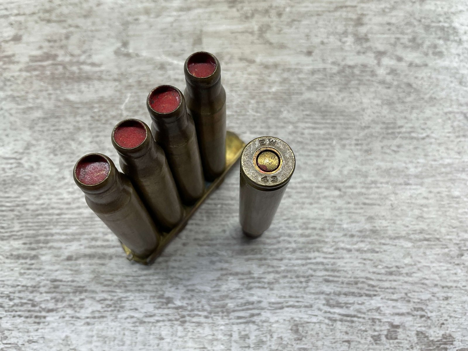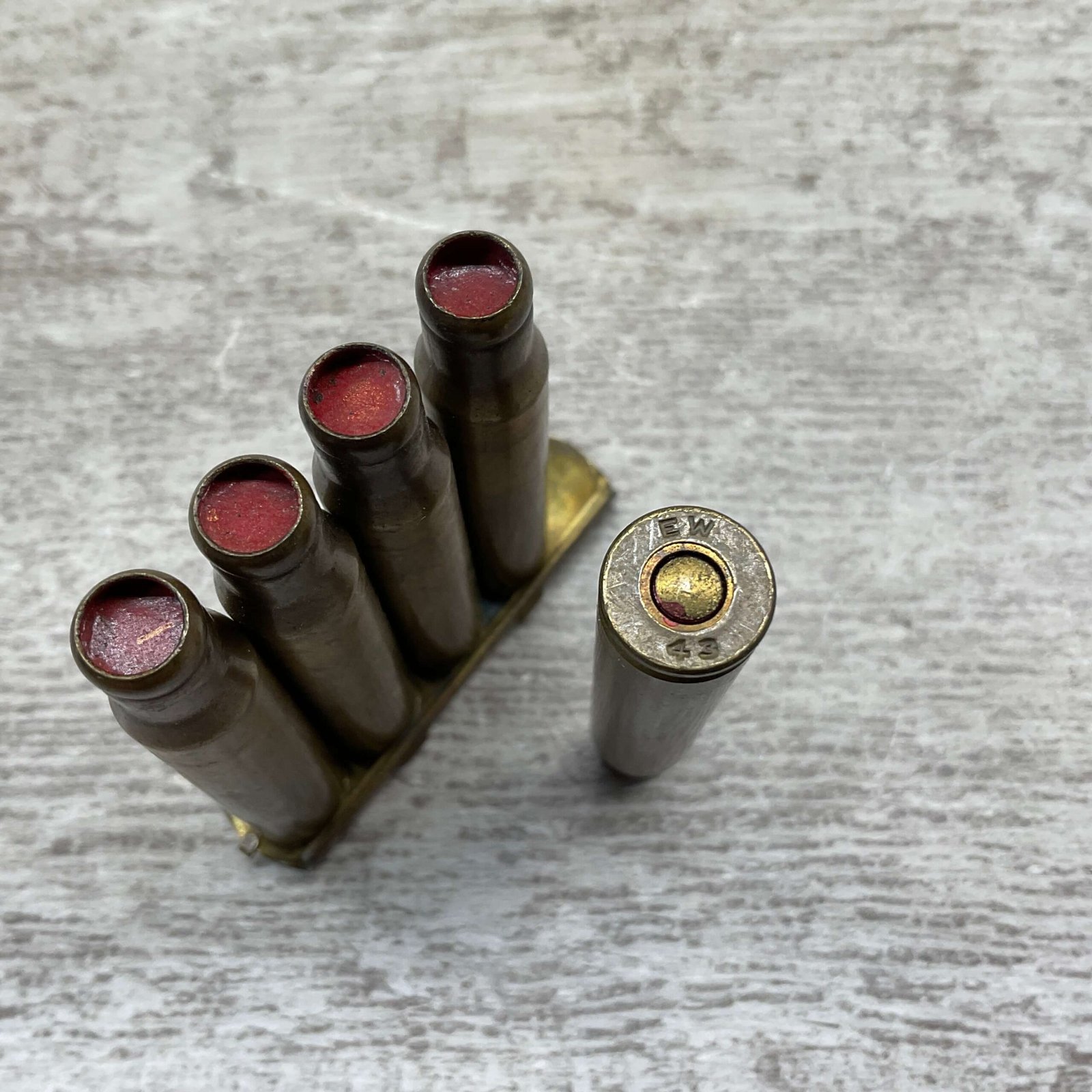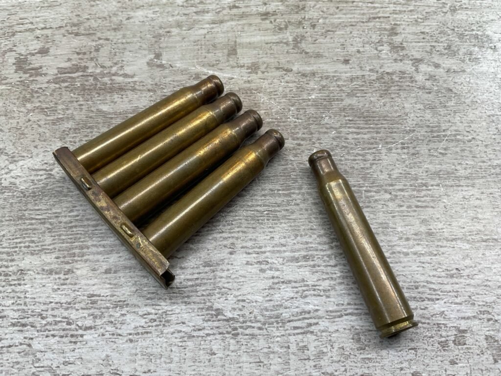 EAU CLAIRE ORDANANCE PLANT, 30-06 BLANKS, QTY 5 CARTRIDGES ON STIRRPER CLIP, HEAD STAMP “EW” AND “42”