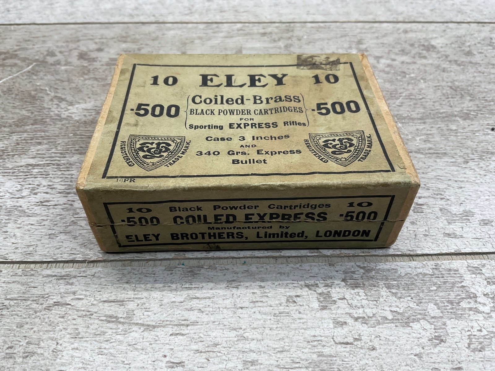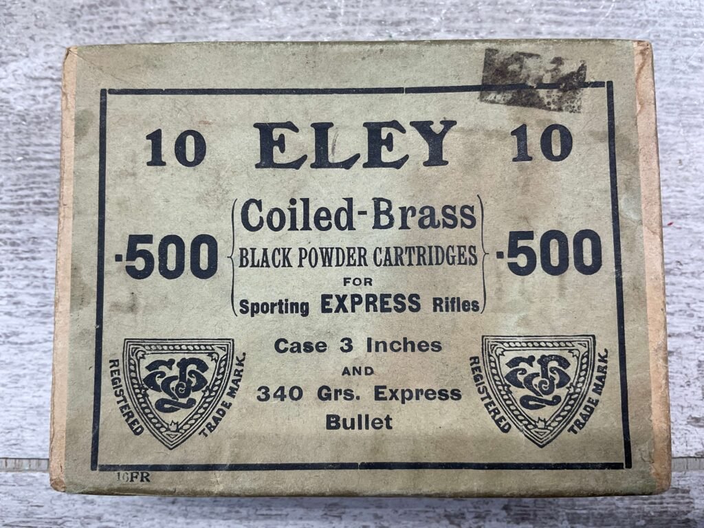 ELEY .500 CAL BLACK POWDER CARTRIDGES, EMPTY BOX, VERY RARE, BOX IS IN NEARLY MINT CONDITION AND DISPLAYS WELL!