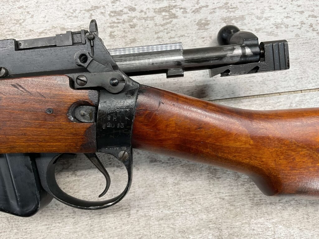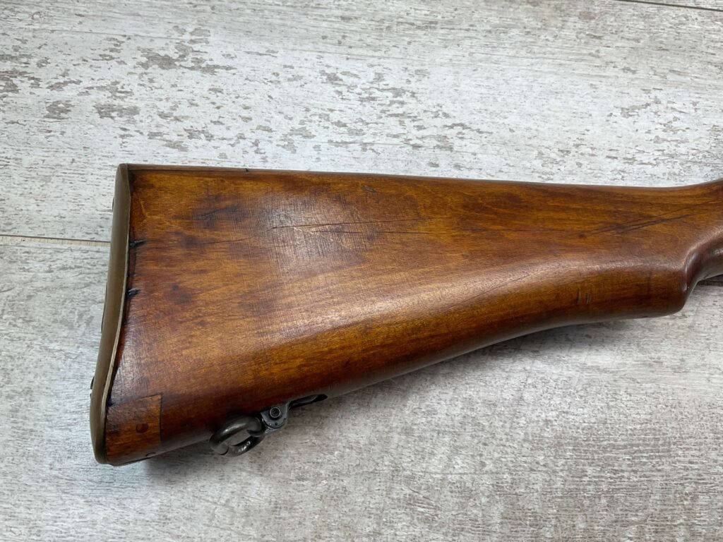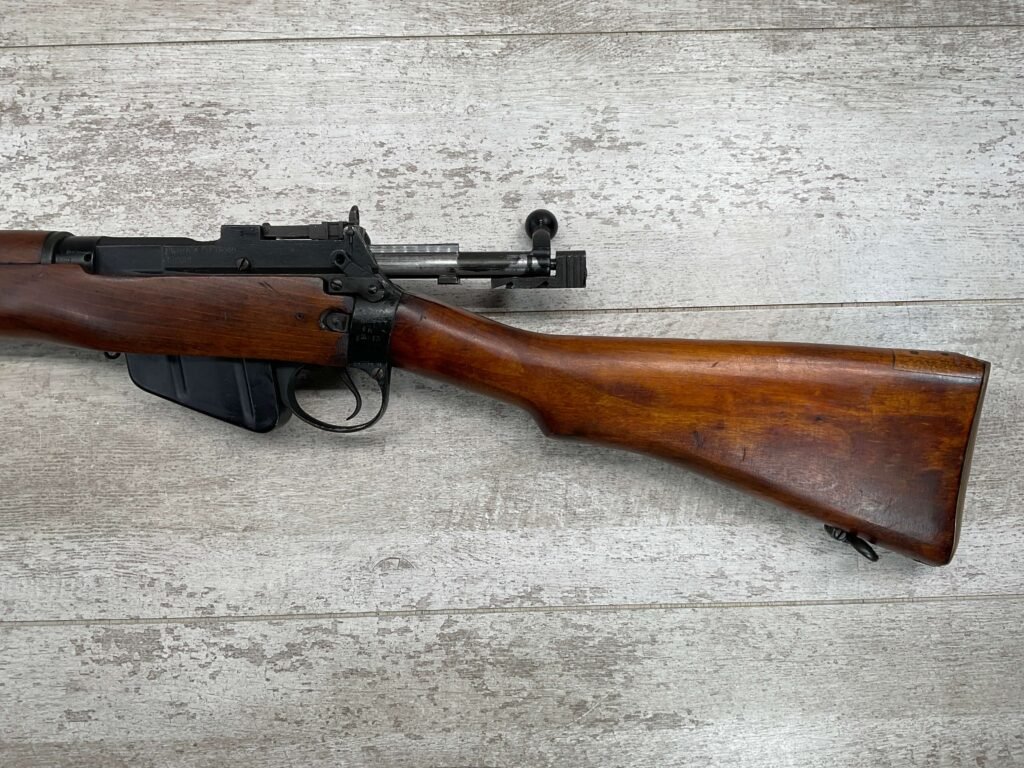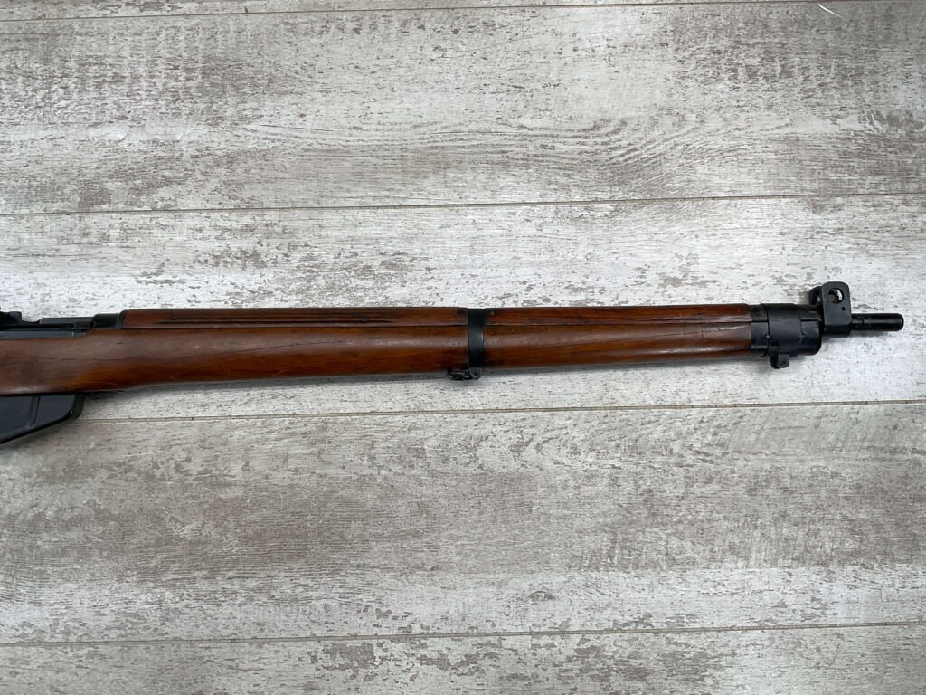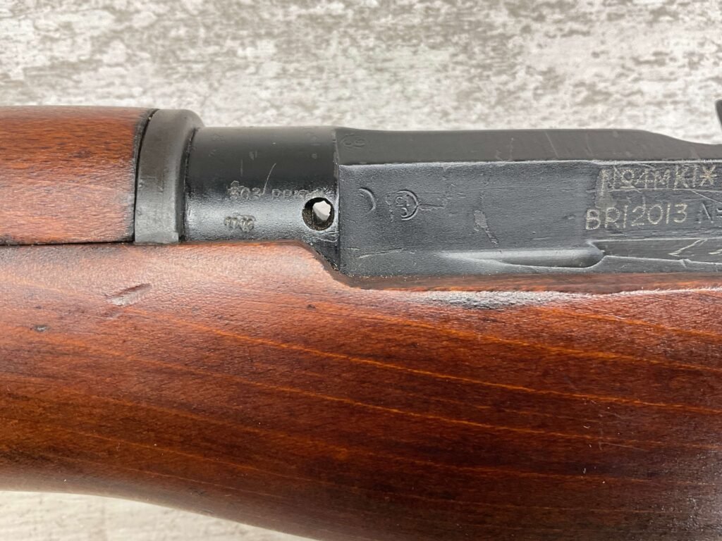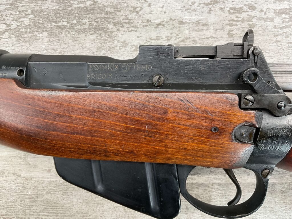 ENFIELD NO4 MK1 BRITISH .303 CAL BOLT ACTION RIFLE #BR12013, .303 BRITISH, MALTBY MFG 1944, FAZAKERLEY REBUILT IN 1948, 90% BLUE, EXC STOCK W/LIGHT CRACK ON RIGHT SIDE (DOES NOT OPEN WITH FLEX, THINKING DUE TO DRYING OUT AS NOT IN NORMAL STRESS AREA), ALL MATCHING, EXC BRIGHT BORE W/EXC RIFLING, BARREL WEAR FROM BAYONET, NO BAYO INCLUDED, 25″ BBL, FULL STOCK, NO VISIBLE IMPORT MARK, BRASS TRAPDOOR, GROOVED HANDGUARD, 90+% OVERALL