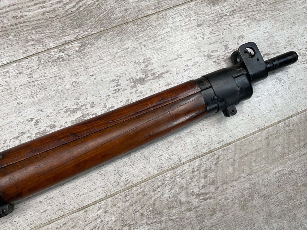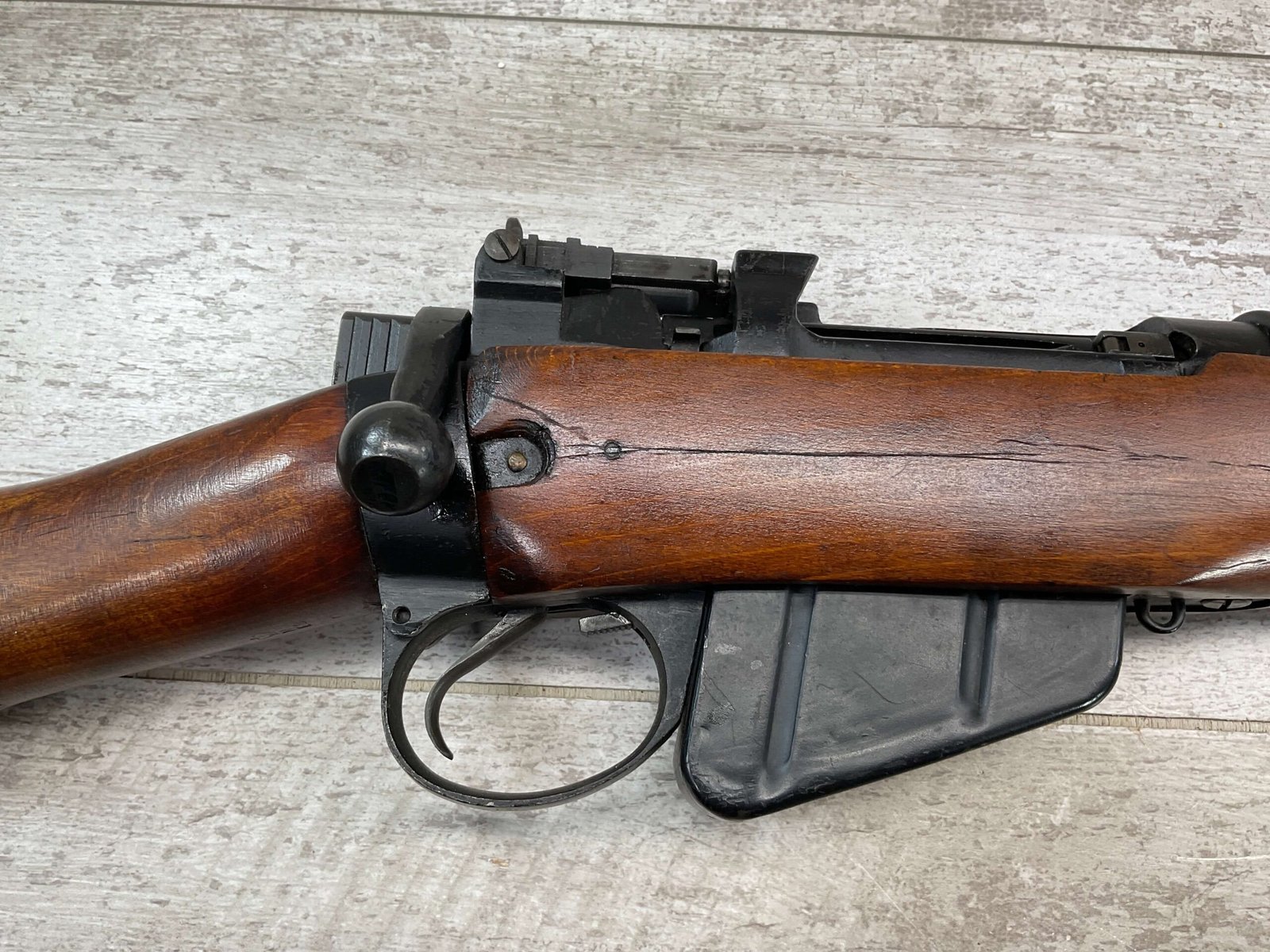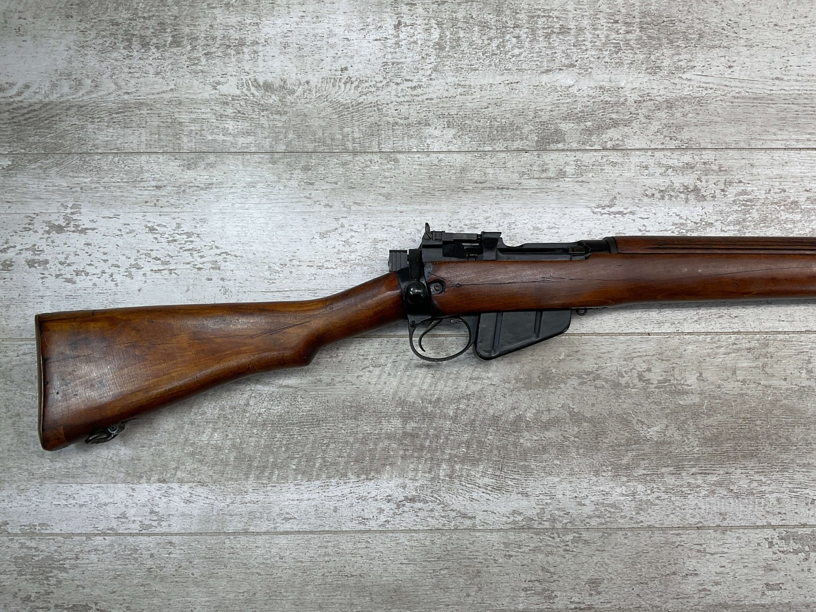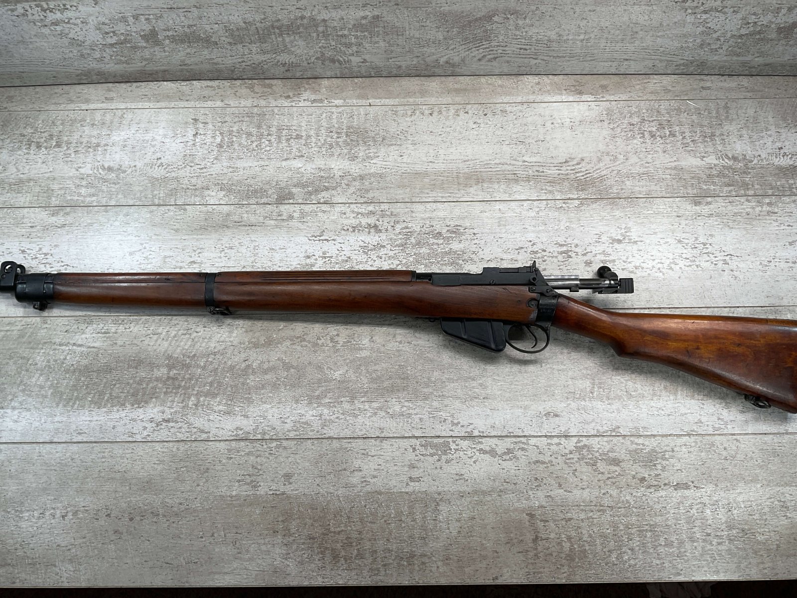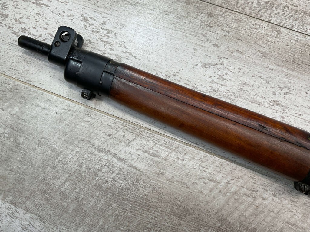 ENFIELD NO4 MK1 BRITISH .303 CAL BOLT ACTION RIFLE #BR12013, .303 BRITISH, MALTBY MFG 1944, FAZAKERLEY REBUILT IN 1948, 90% BLUE, EXC STOCK W/LIGHT CRACK ON RIGHT SIDE (DOES NOT OPEN WITH FLEX, THINKING DUE TO DRYING OUT AS NOT IN NORMAL STRESS AREA), ALL MATCHING, EXC BRIGHT BORE W/EXC RIFLING, BARREL WEAR FROM BAYONET, NO BAYO INCLUDED, 25″ BBL, FULL STOCK, NO VISIBLE IMPORT MARK, BRASS TRAPDOOR, GROOVED HANDGUARD, 90+% OVERALL