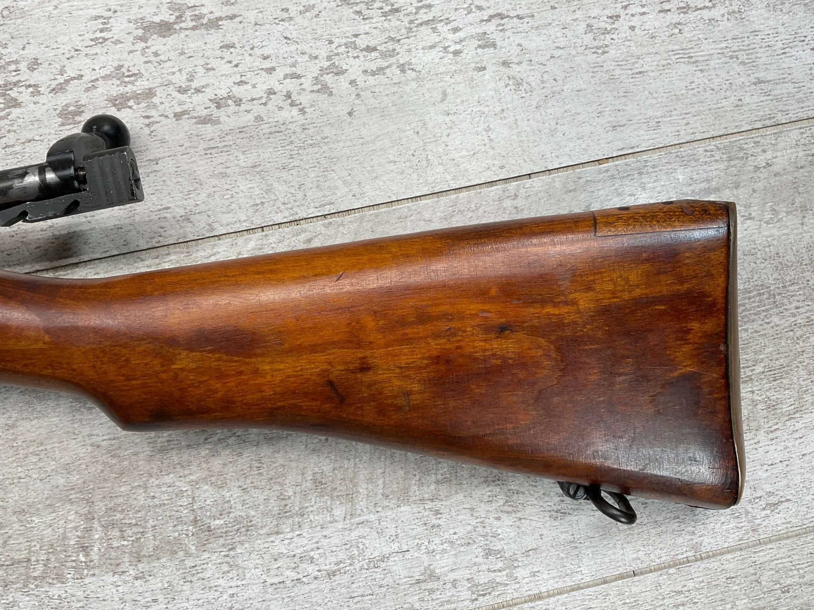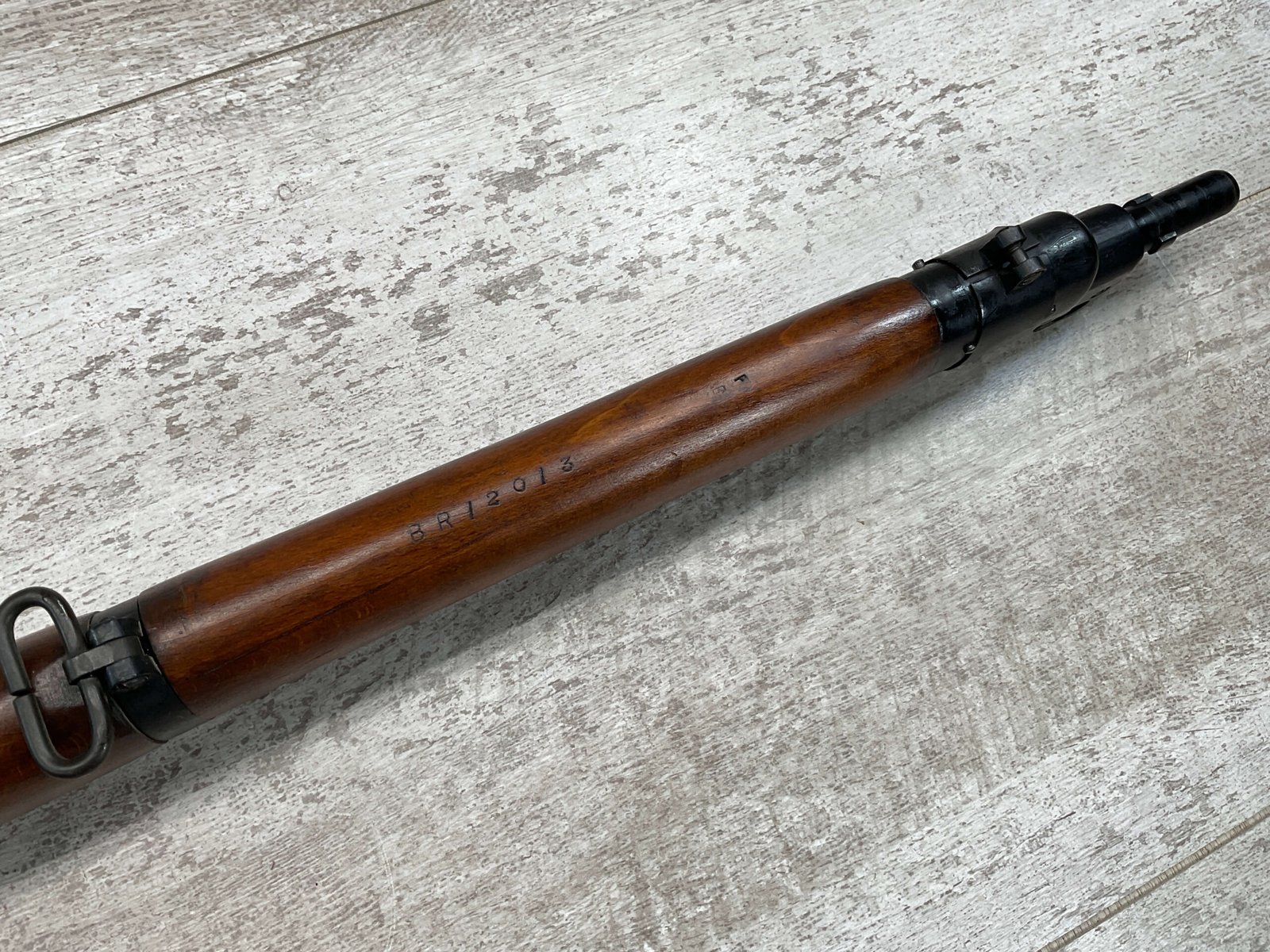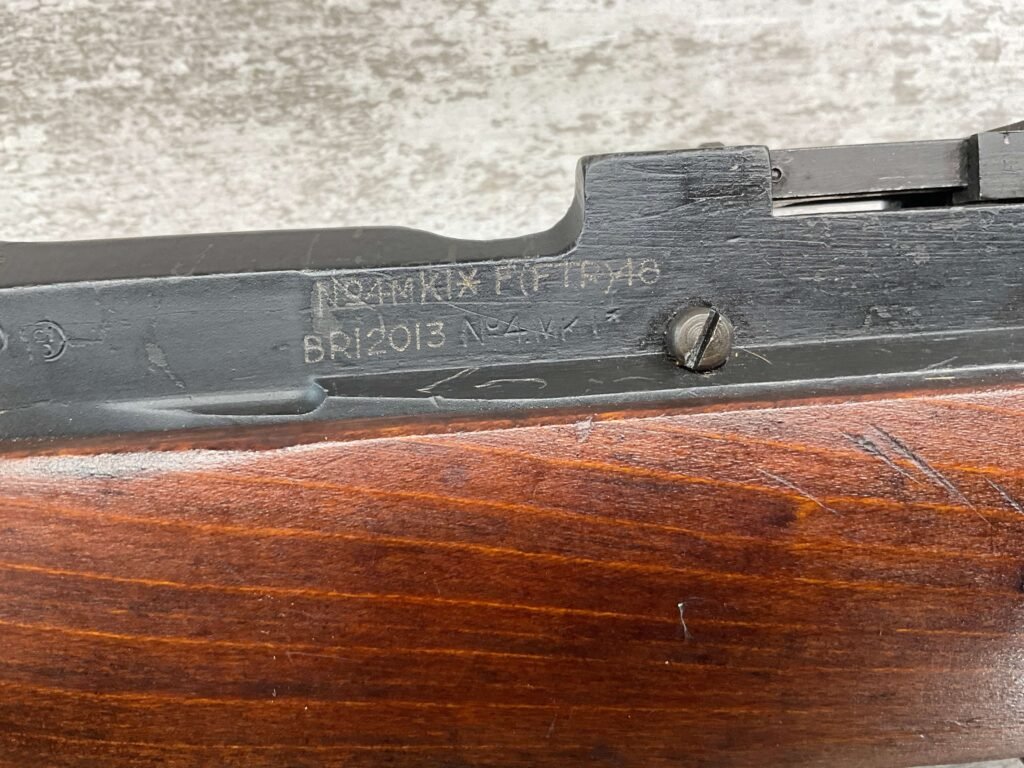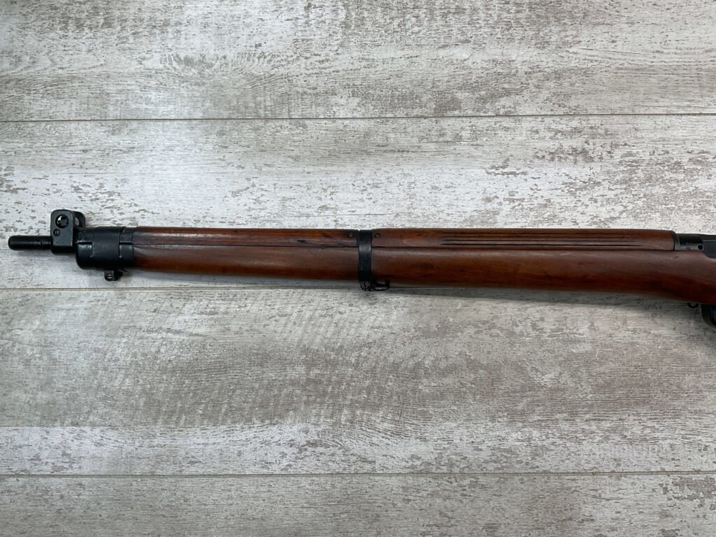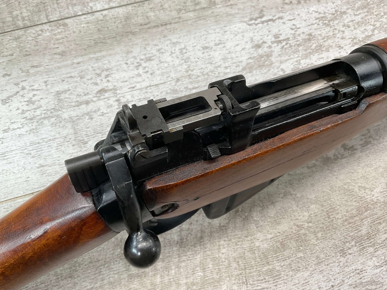 ENFIELD NO4 MK1 BRITISH .303 CAL BOLT ACTION RIFLE #BR12013, .303 BRITISH, MALTBY MFG 1944, FAZAKERLEY REBUILT IN 1948, 90% BLUE, EXC STOCK W/LIGHT CRACK ON RIGHT SIDE (DOES NOT OPEN WITH FLEX, THINKING DUE TO DRYING OUT AS NOT IN NORMAL STRESS AREA), ALL MATCHING, EXC BRIGHT BORE W/EXC RIFLING, BARREL WEAR FROM BAYONET, NO BAYO INCLUDED, 25″ BBL, FULL STOCK, NO VISIBLE IMPORT MARK, BRASS TRAPDOOR, GROOVED HANDGUARD, 90+% OVERALL