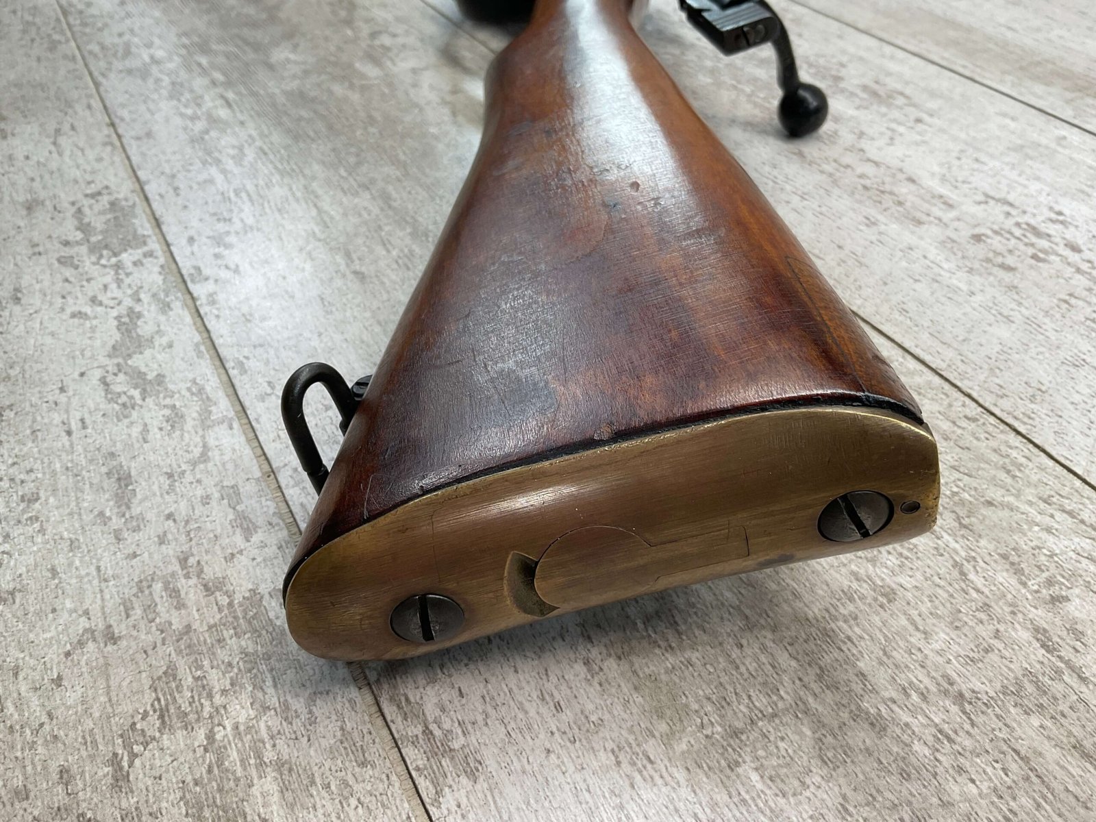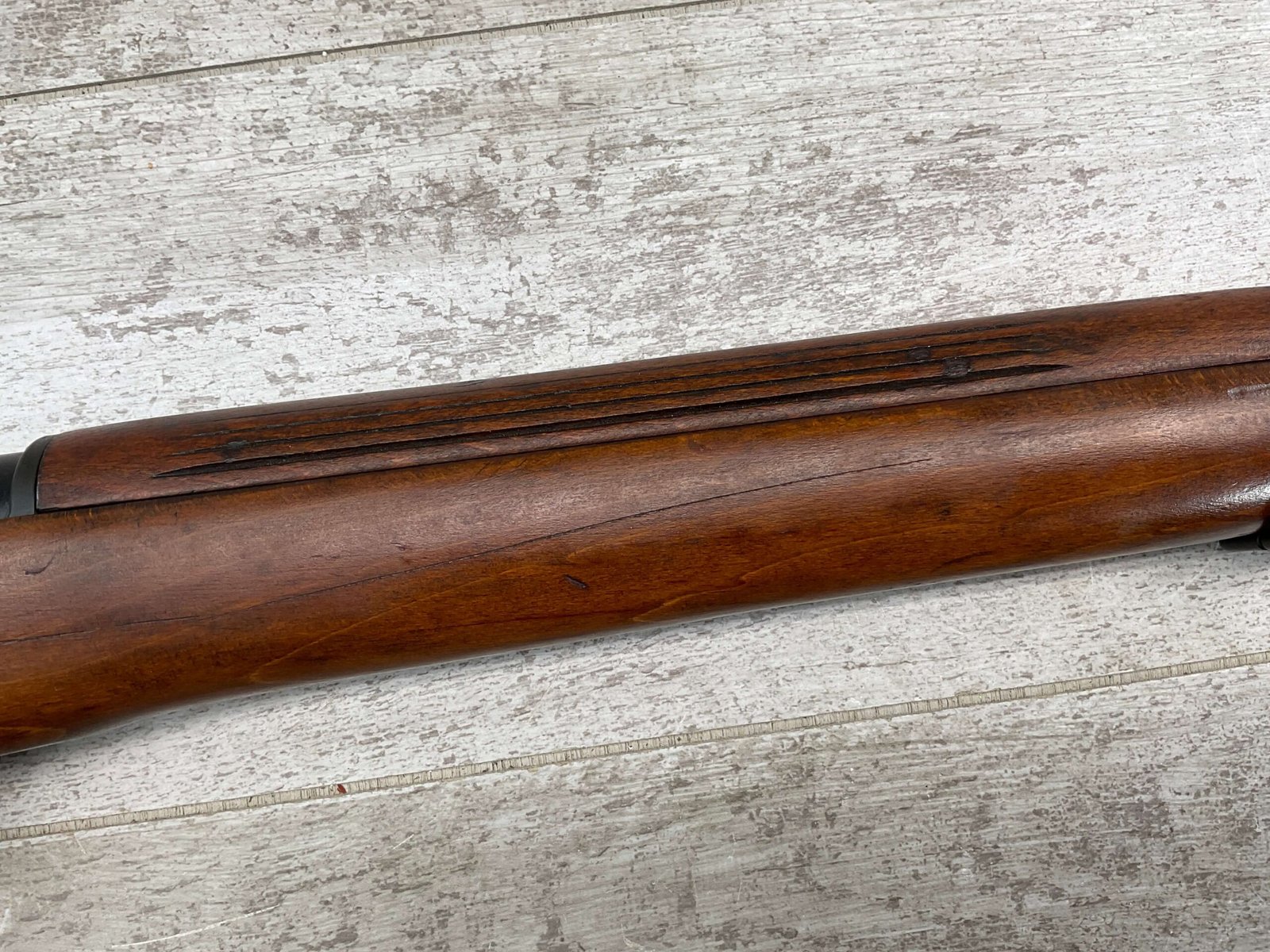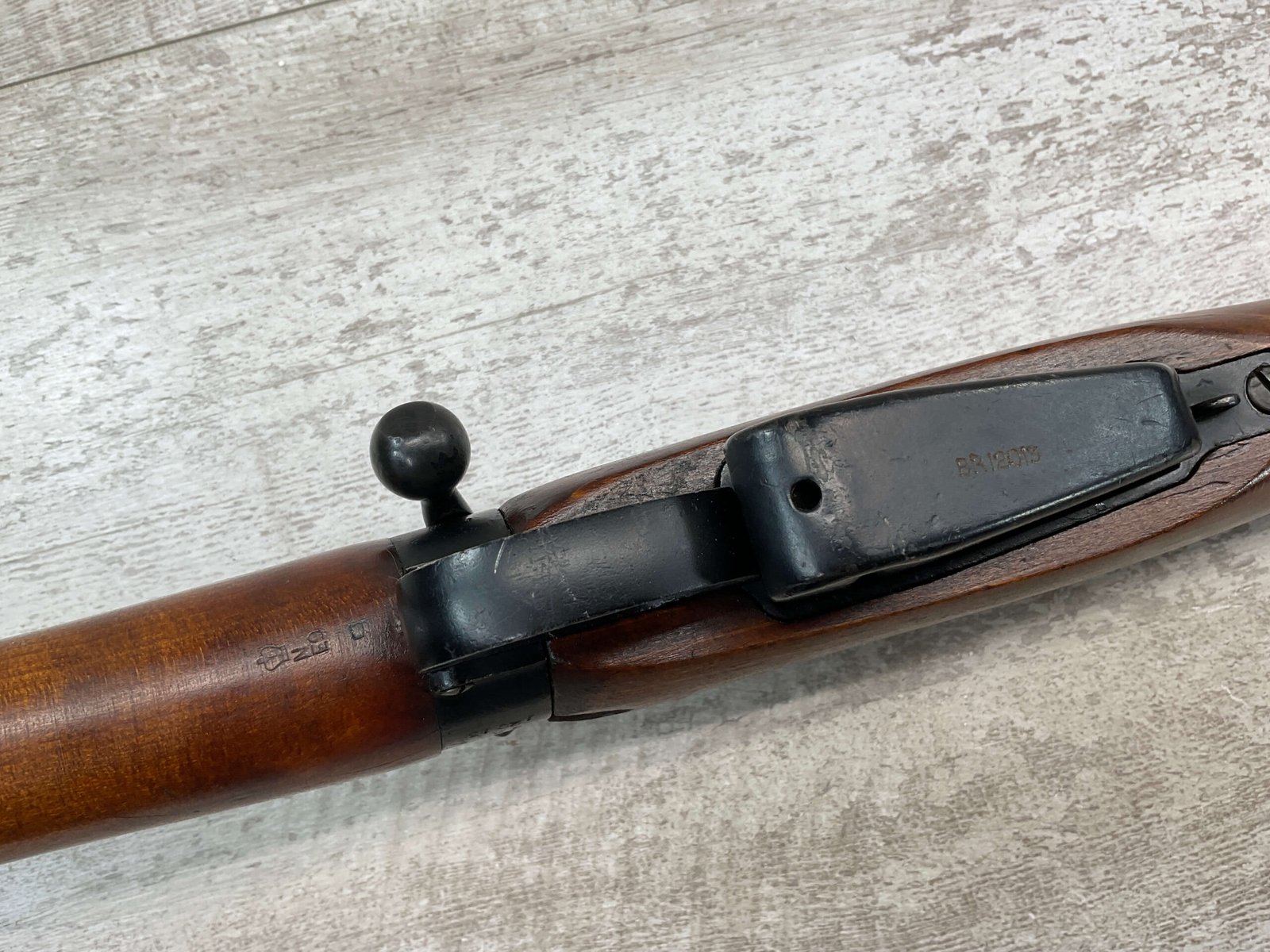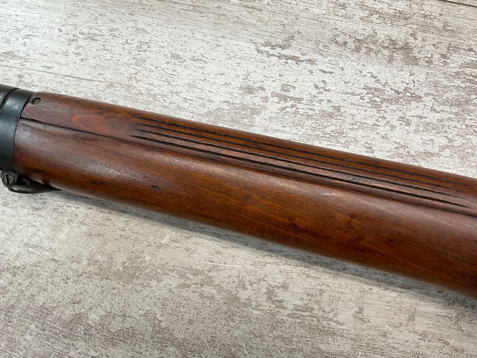 ENFIELD NO4 MK1 BRITISH .303 CAL BOLT ACTION RIFLE #BR12013, .303 BRITISH, MALTBY MFG 1944, FAZAKERLEY REBUILT IN 1948, 90% BLUE, EXC STOCK W/LIGHT CRACK ON RIGHT SIDE (DOES NOT OPEN WITH FLEX, THINKING DUE TO DRYING OUT AS NOT IN NORMAL STRESS AREA), ALL MATCHING, EXC BRIGHT BORE W/EXC RIFLING, BARREL WEAR FROM BAYONET, NO BAYO INCLUDED, 25″ BBL, FULL STOCK, NO VISIBLE IMPORT MARK, BRASS TRAPDOOR, GROOVED HANDGUARD, 90+% OVERALL