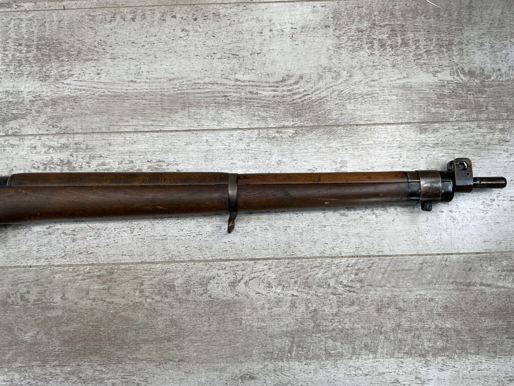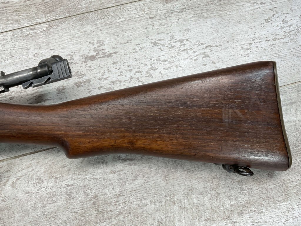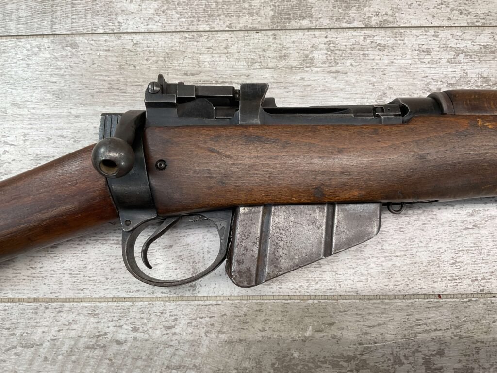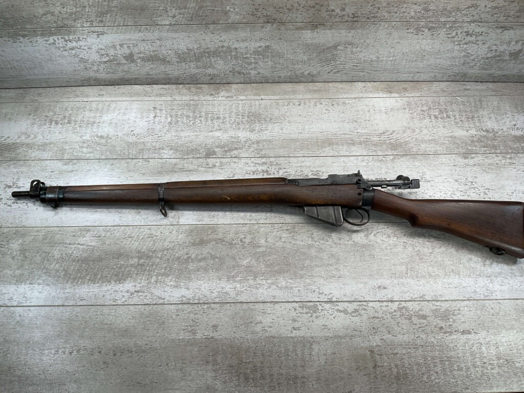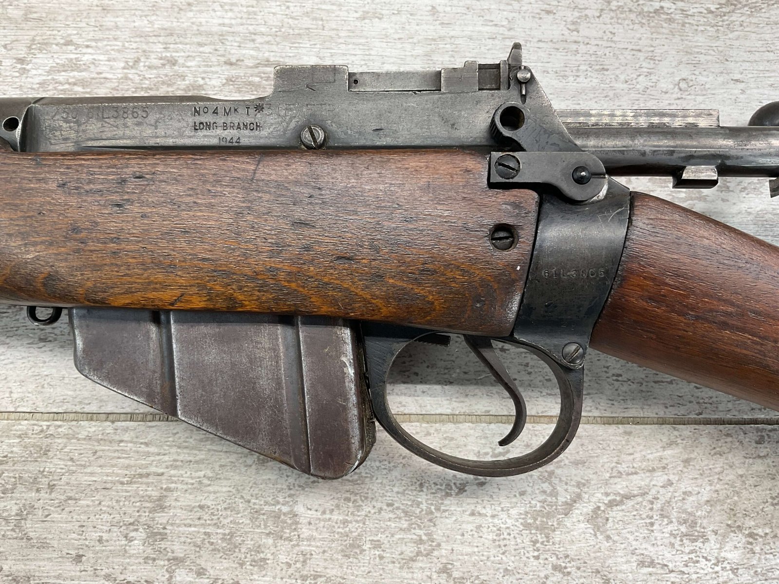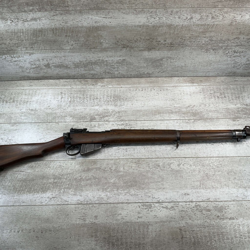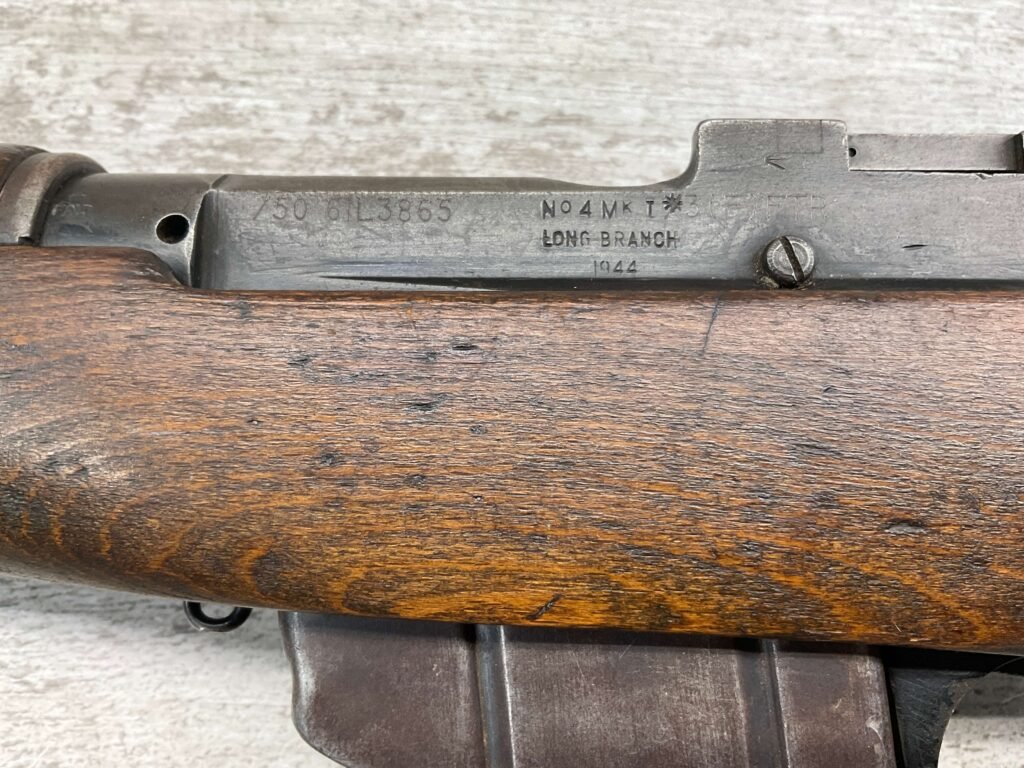 ENFIELD NO4 MK1 LONG BRANCH .303 CAL BOLT ACTION RIFLE, 1944 MFR #61L3865, 24″ BARREL, .303 BRITISH, LONG BRANCH BUILT, ALL MATCHING, DARK PITTED BORE W/VG RIFLING (WILL STILL MAKE A GREAT SHOOTER), BRASS TRAPDOOR, CANADIAN RIFLES HAD THE MOST DURABLE STOCK, 1300YD LADDER & PEEP SIGHT W/ FAZAKERLEY MARKS, VG OVERALL CANADIAN MADE ENFIELD.