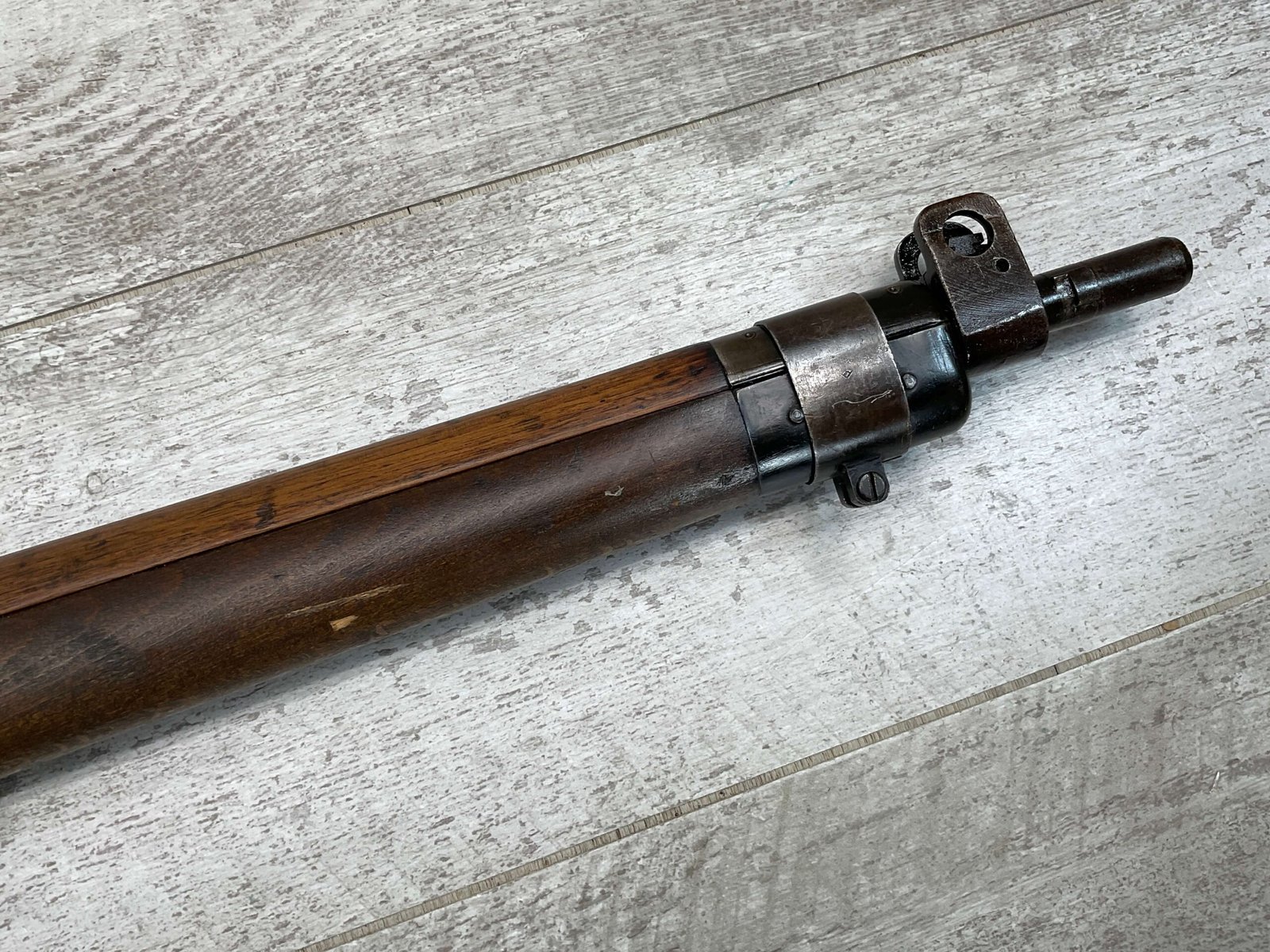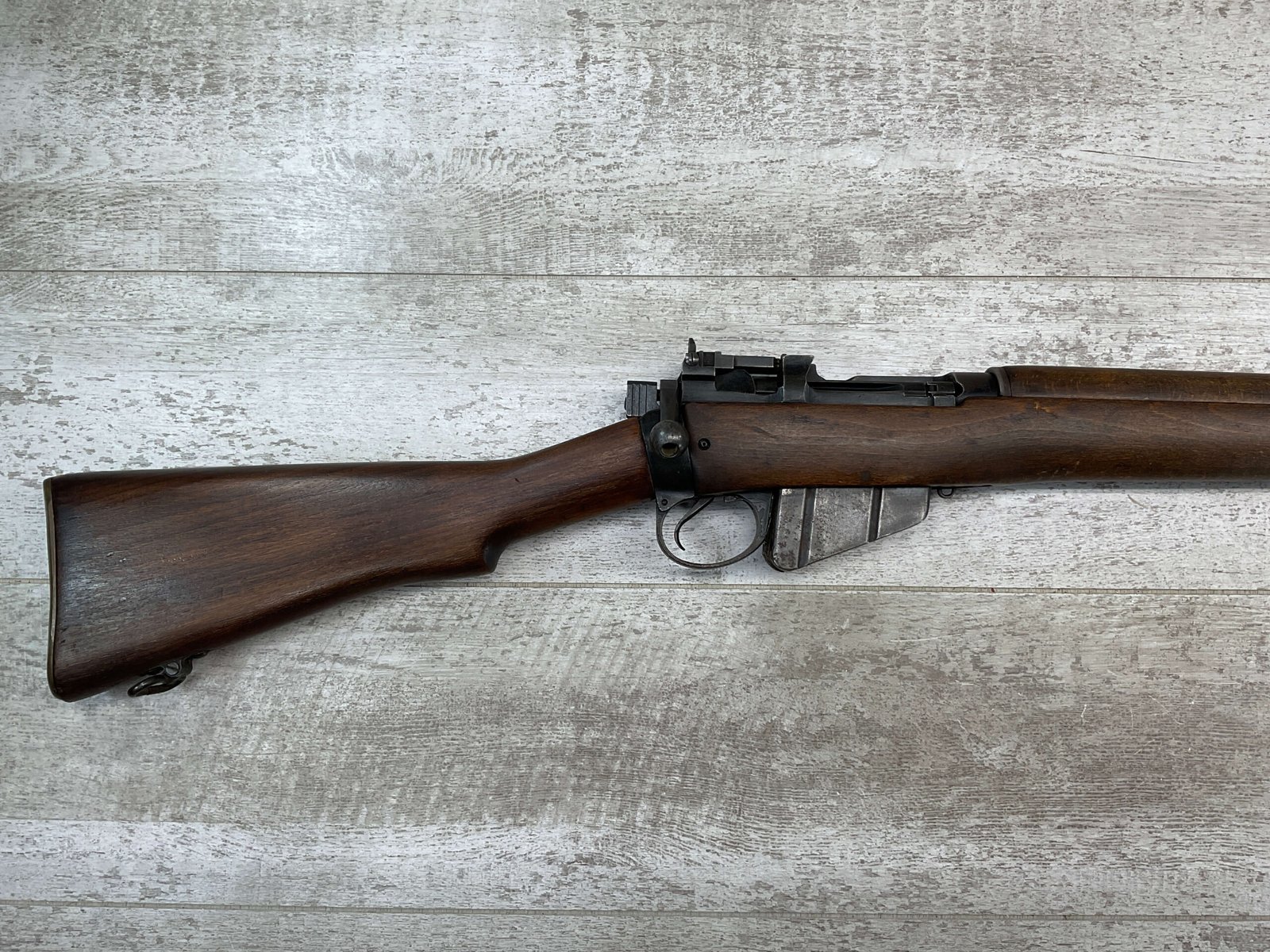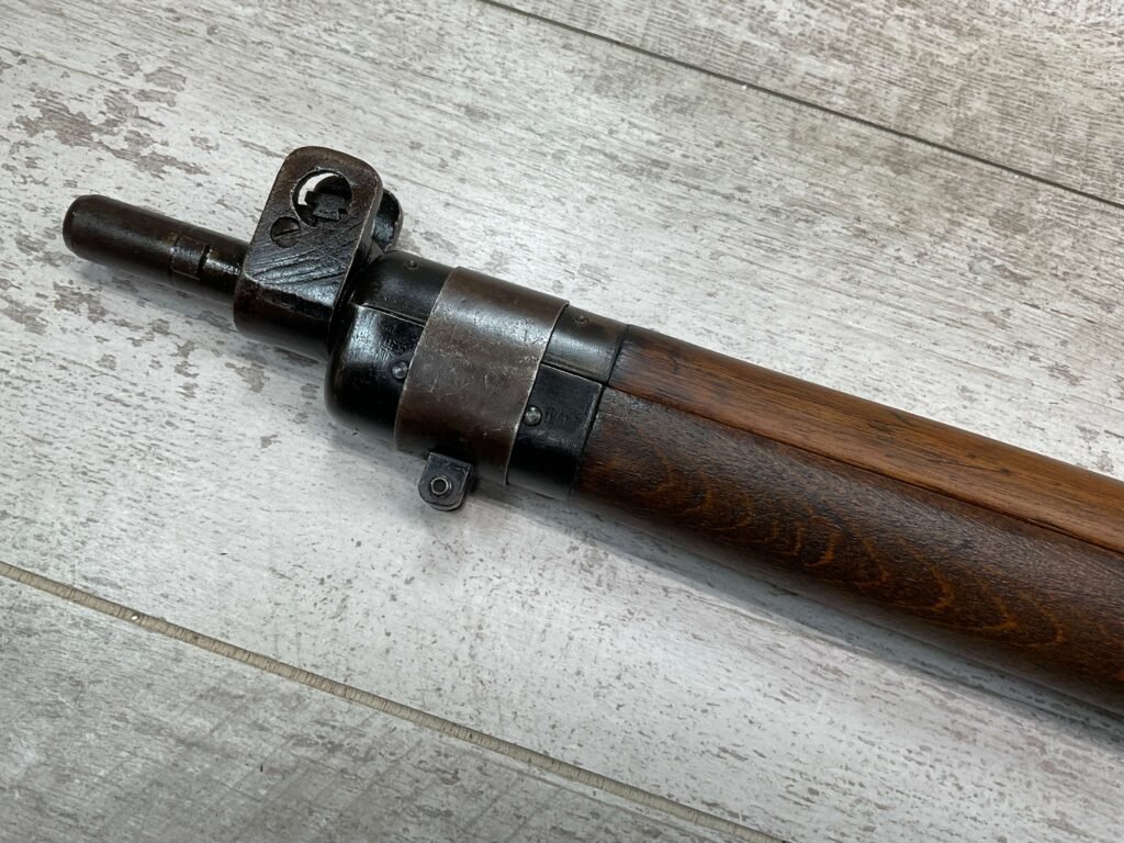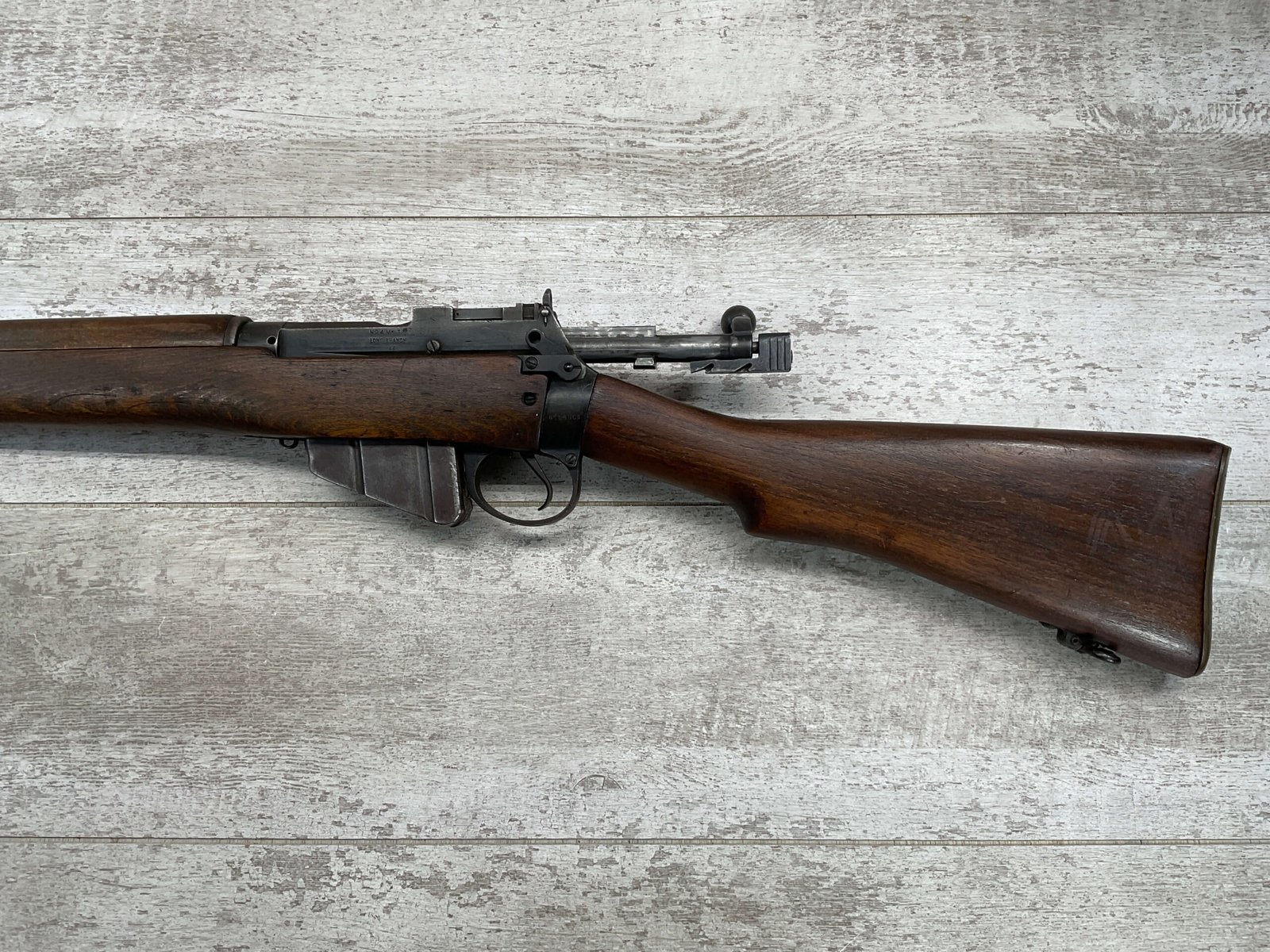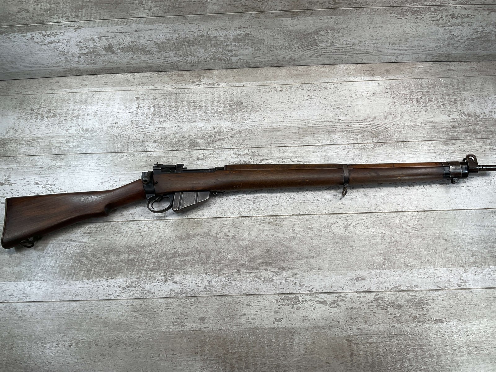 ENFIELD NO4 MK1 LONG BRANCH .303 CAL BOLT ACTION RIFLE, 1944 MFR #61L3865, 24″ BARREL, .303 BRITISH, LONG BRANCH BUILT, ALL MATCHING, DARK PITTED BORE W/VG RIFLING (WILL STILL MAKE A GREAT SHOOTER), BRASS TRAPDOOR, CANADIAN RIFLES HAD THE MOST DURABLE STOCK, 1300YD LADDER & PEEP SIGHT W/ FAZAKERLEY MARKS, VG OVERALL CANADIAN MADE ENFIELD.