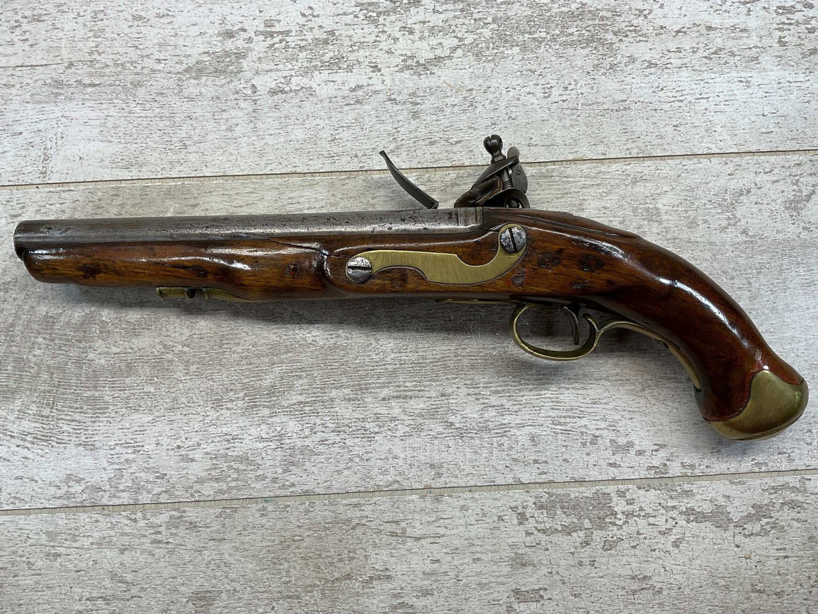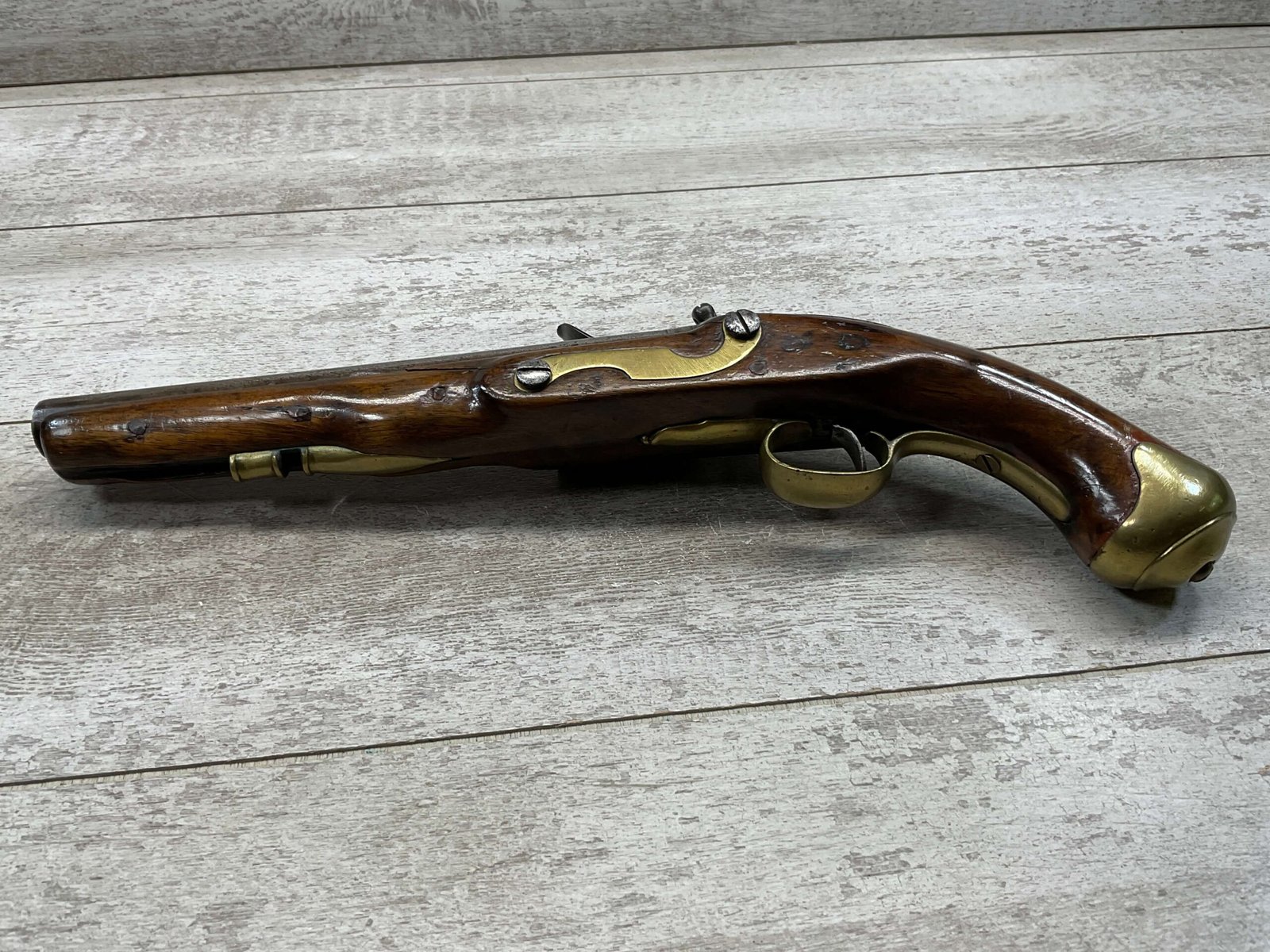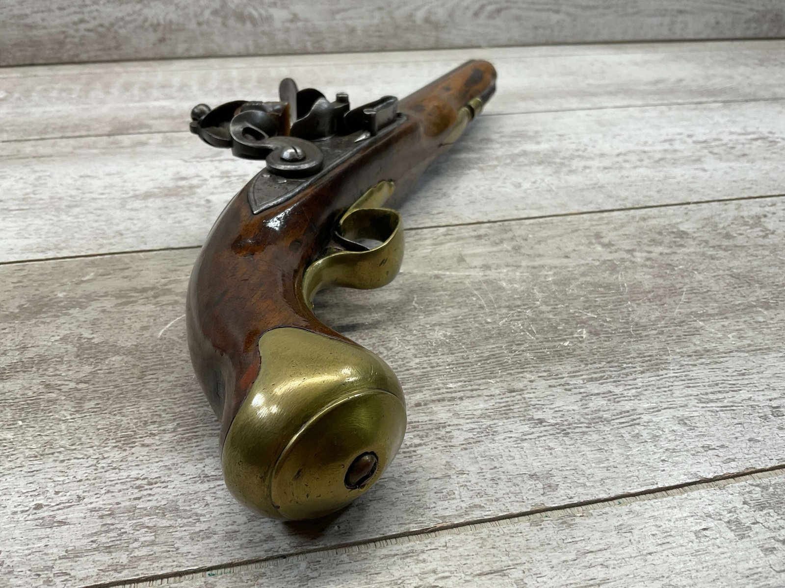 ENGLISH 1808 LIGHT DRAGOON FLINTLOCK .66 CAL PISTOL, ANTIQUE #NSN, 8″ BBL, STOCK HAS CRACKS, VARNISHED WOOD, MISSING RAMROD, BRASS FURNITURE, FLINT, CONDITION AS SHOWN IN PISTURES