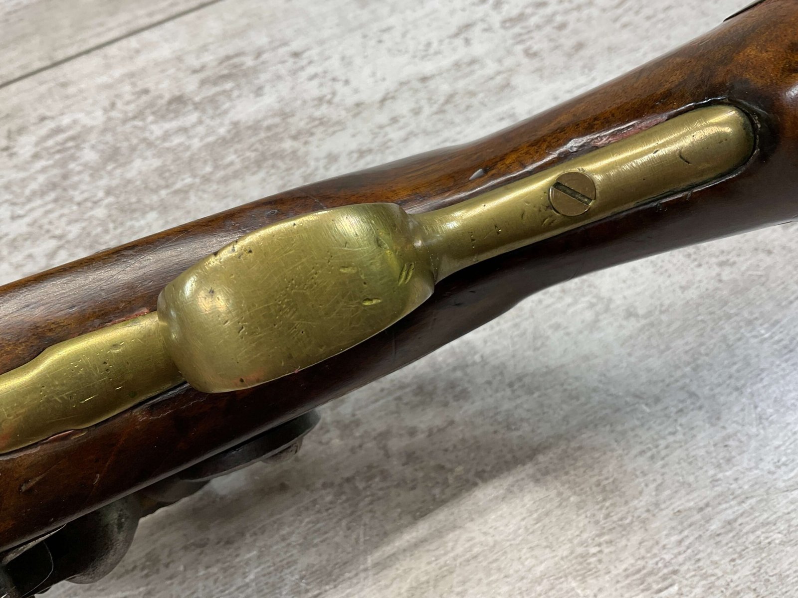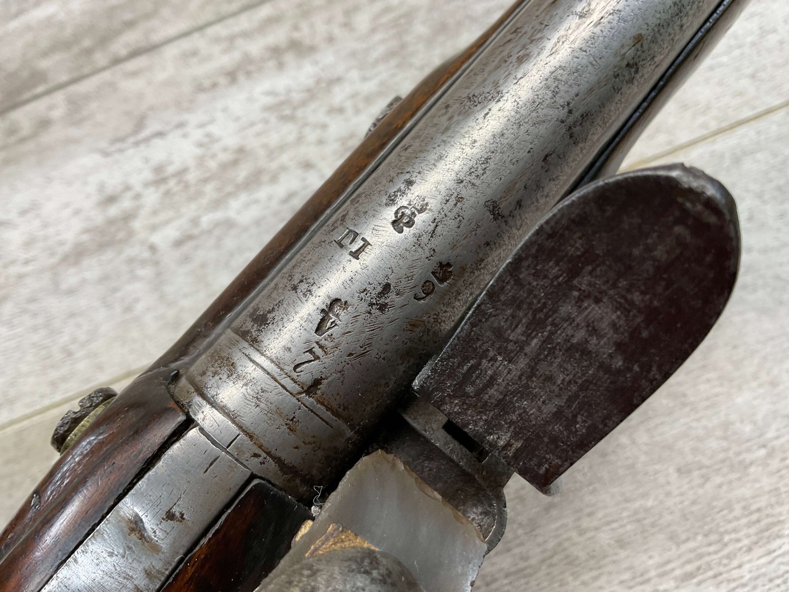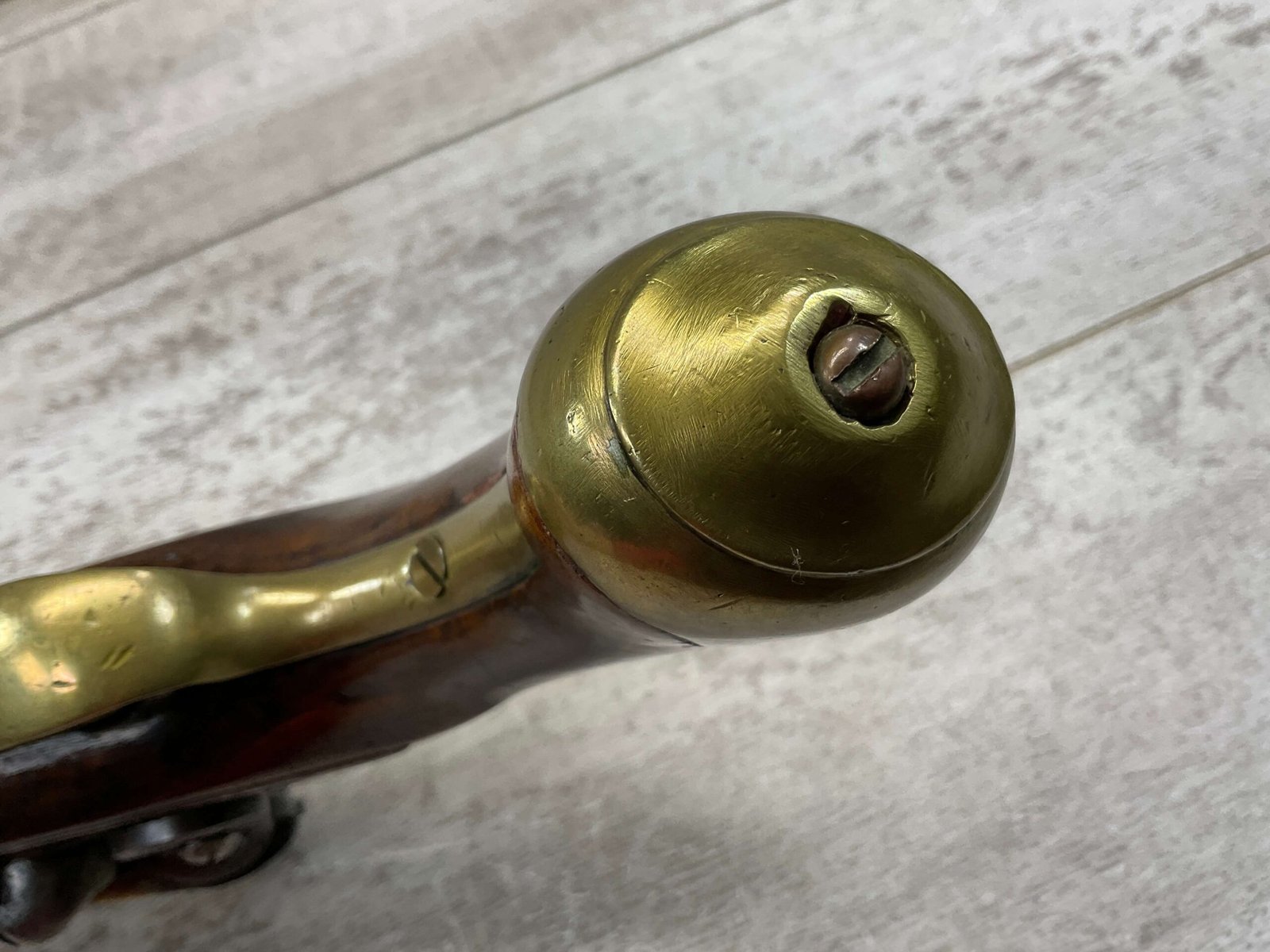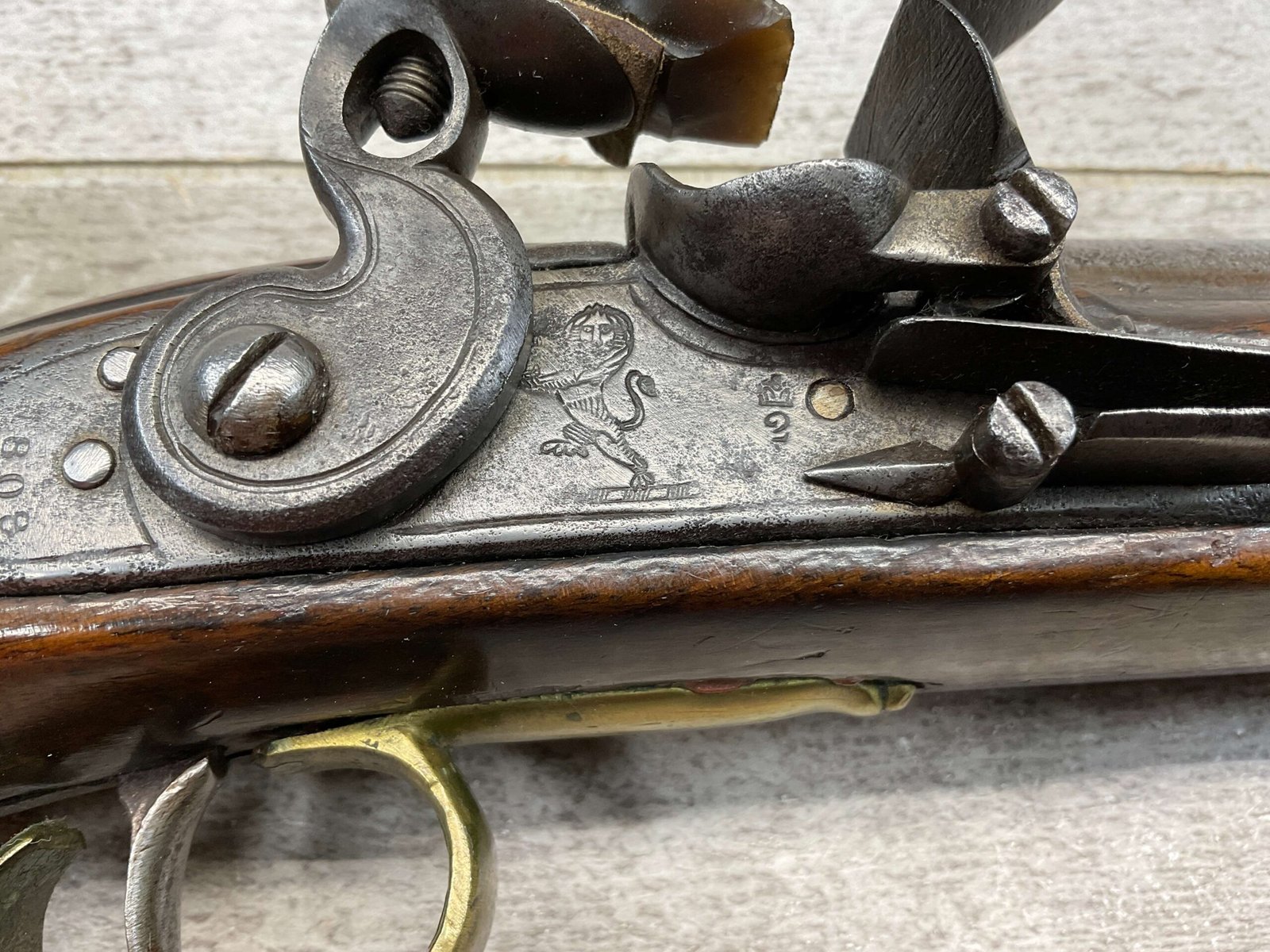 ENGLISH 1808 LIGHT DRAGOON FLINTLOCK .66 CAL PISTOL, ANTIQUE #NSN, 8″ BBL, STOCK HAS CRACKS, VARNISHED WOOD, MISSING RAMROD, BRASS FURNITURE, FLINT, CONDITION AS SHOWN IN PISTURES