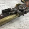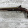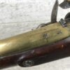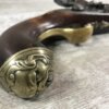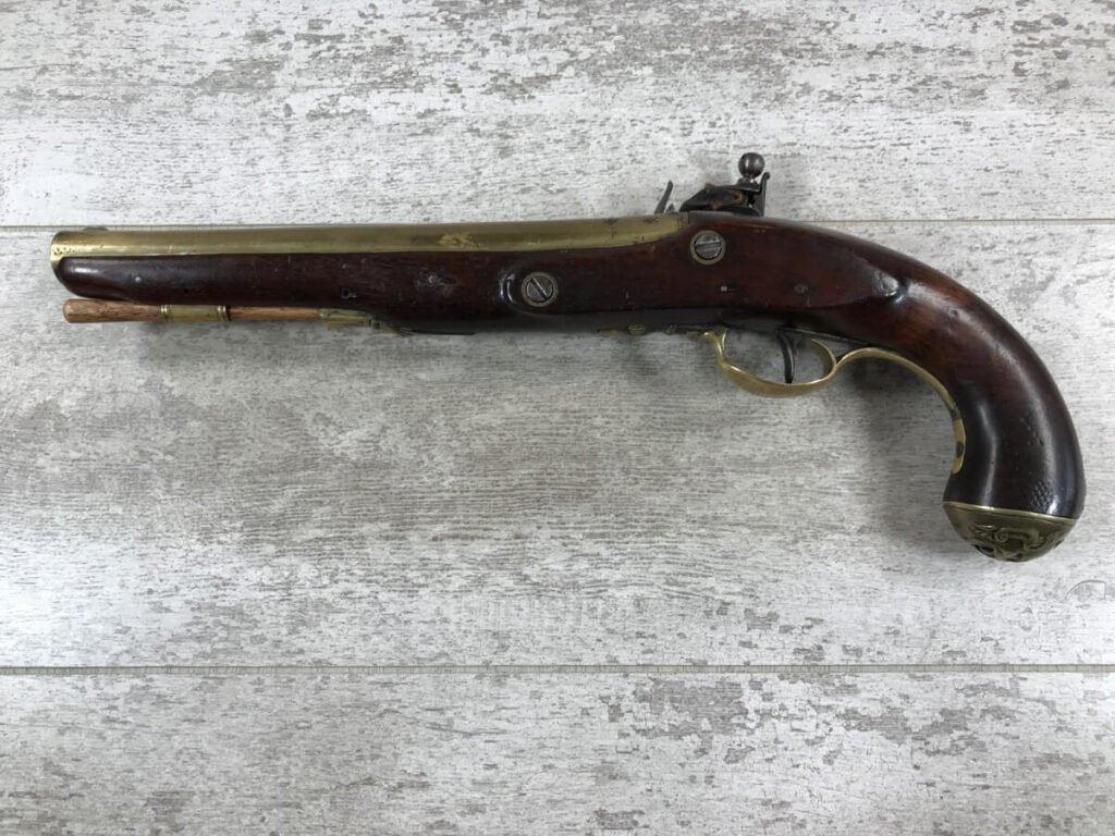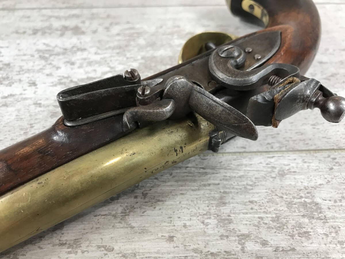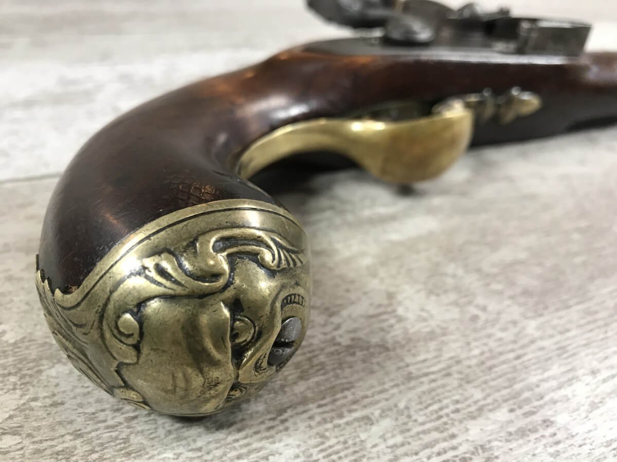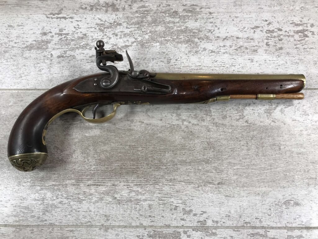 SKU#127 ENGLISH BRASS BARRELLED FLINTLOCK PISTOL, CIRCA 1775-1794, ENGRAVED LOCK-PLATE, 9″ BRASS BARREL ENGRAVED LIVERPOOL W/TWO LONDON PROOF MARKS, BRASS BUTT CAP, RAMROD PIPES & TRIGGER GUARD, ORIGINAL WOODEN RAMROD, MINOR DINGS AND SCRATCHES, 16″ OVERALL, 8 3/4″ BARREL, BRASS BARRELLED PISTOLS WERE OFTEN CARRIED ON BOARD SHIPS DURING THE 18TH-19TH CENTURY.