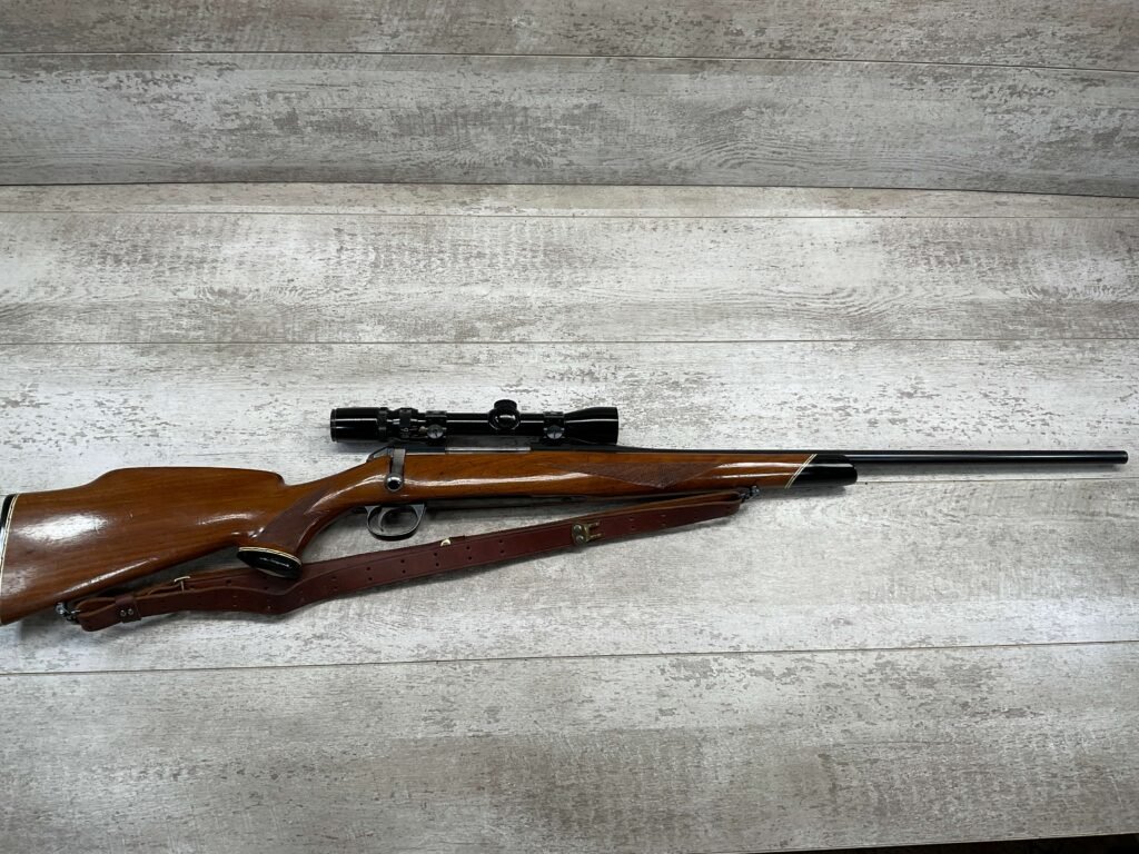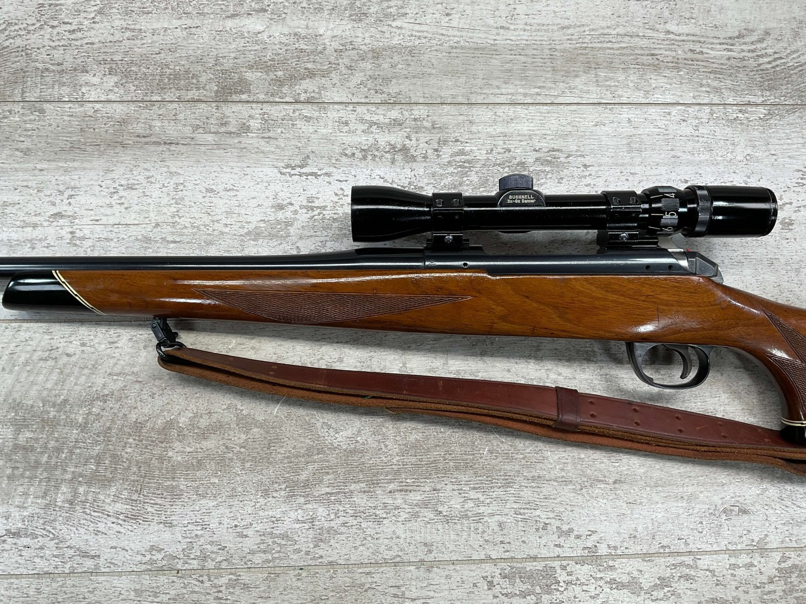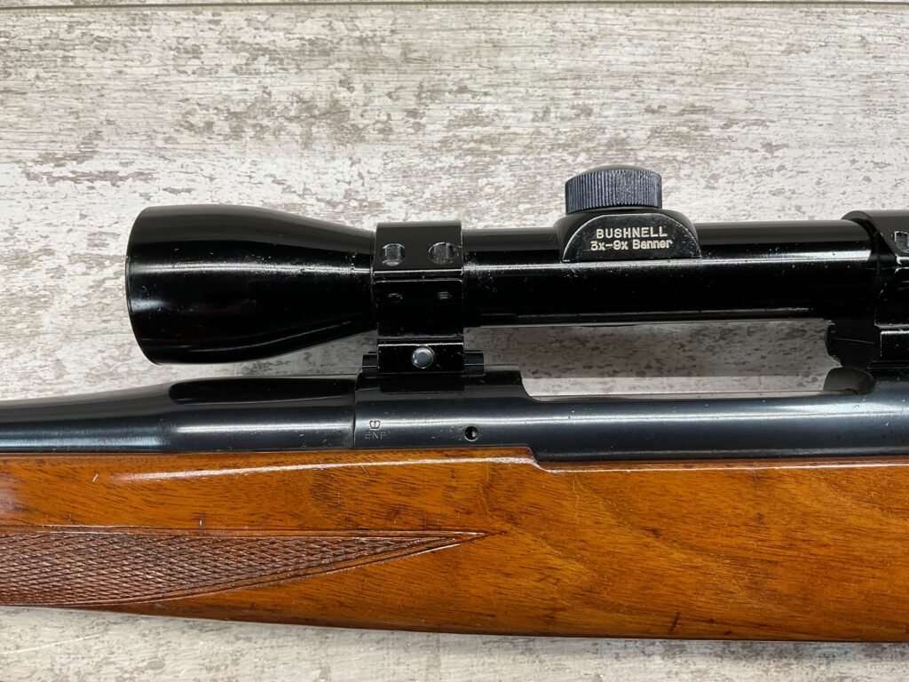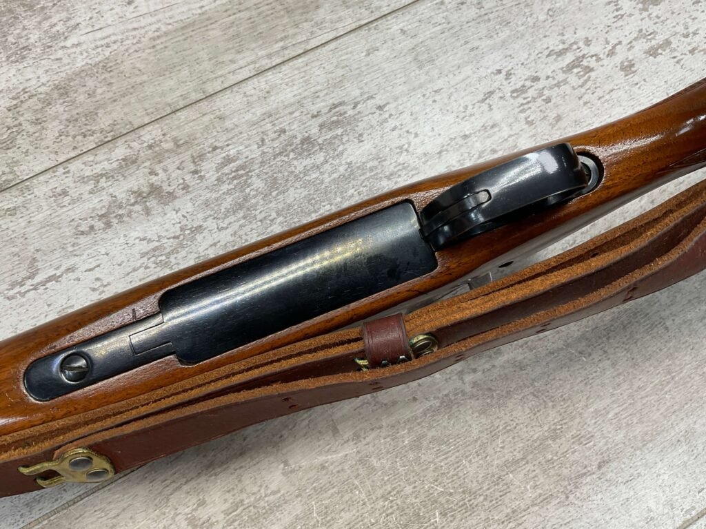 ENGLISH HERTER’S MODEL U-9 .30-06 BOLT ACTION RIFLE #NSN, 24″ BBL, VG-EXC CHECKERED WOOD STOCK W/LIGHT HANDLING/USE MARKS, MONTE CARLO SYLE STOCK, EXC BLUE W/COUPLE AREA OF FINISH WEAR, SLING SWIVELS & LEATHER SLING, VG BRIGHT BORE & STRONG RIFLING, BUSHNELL 3X-9X BANNER SCOPE, SMOOTH ACTION