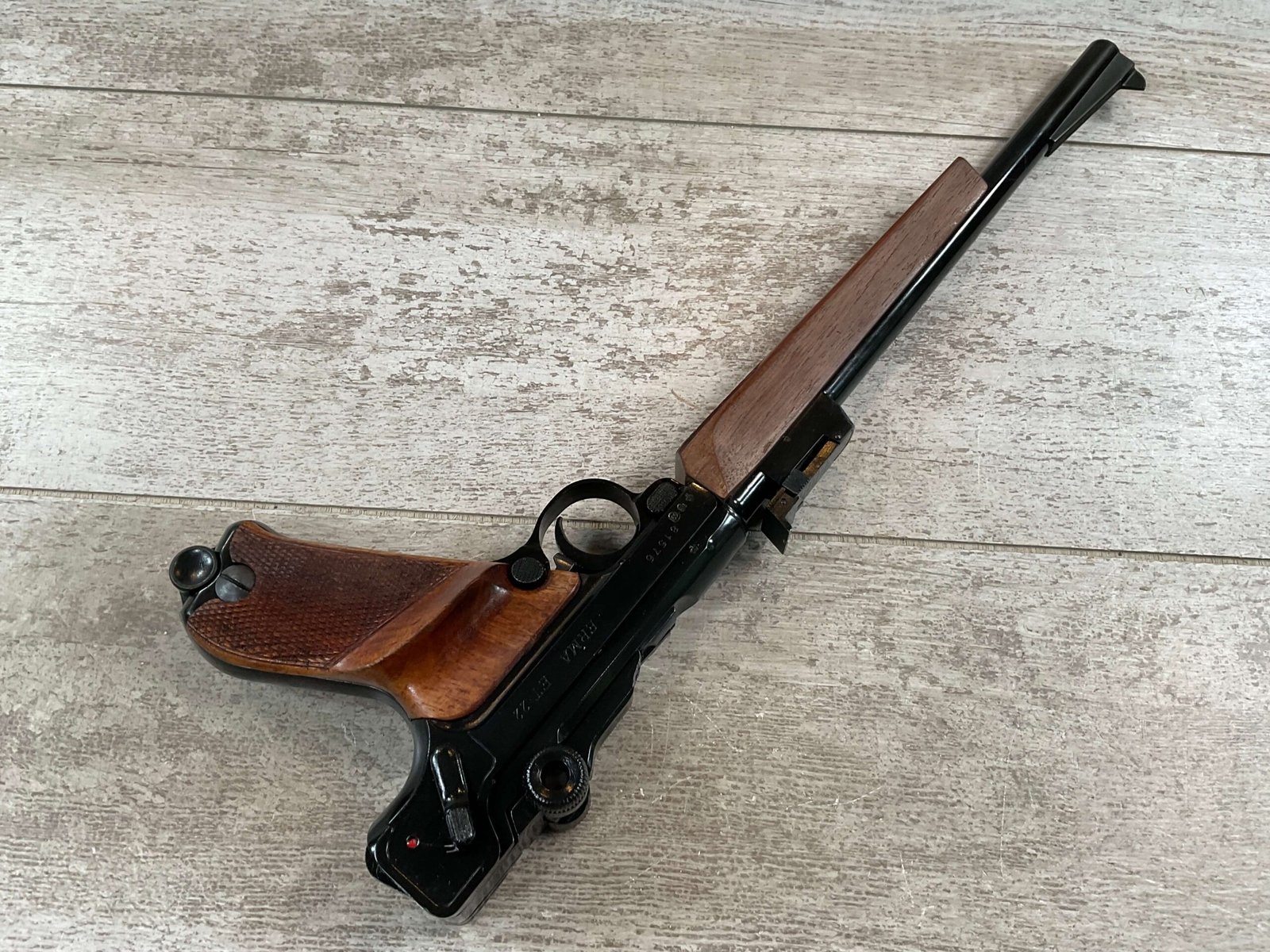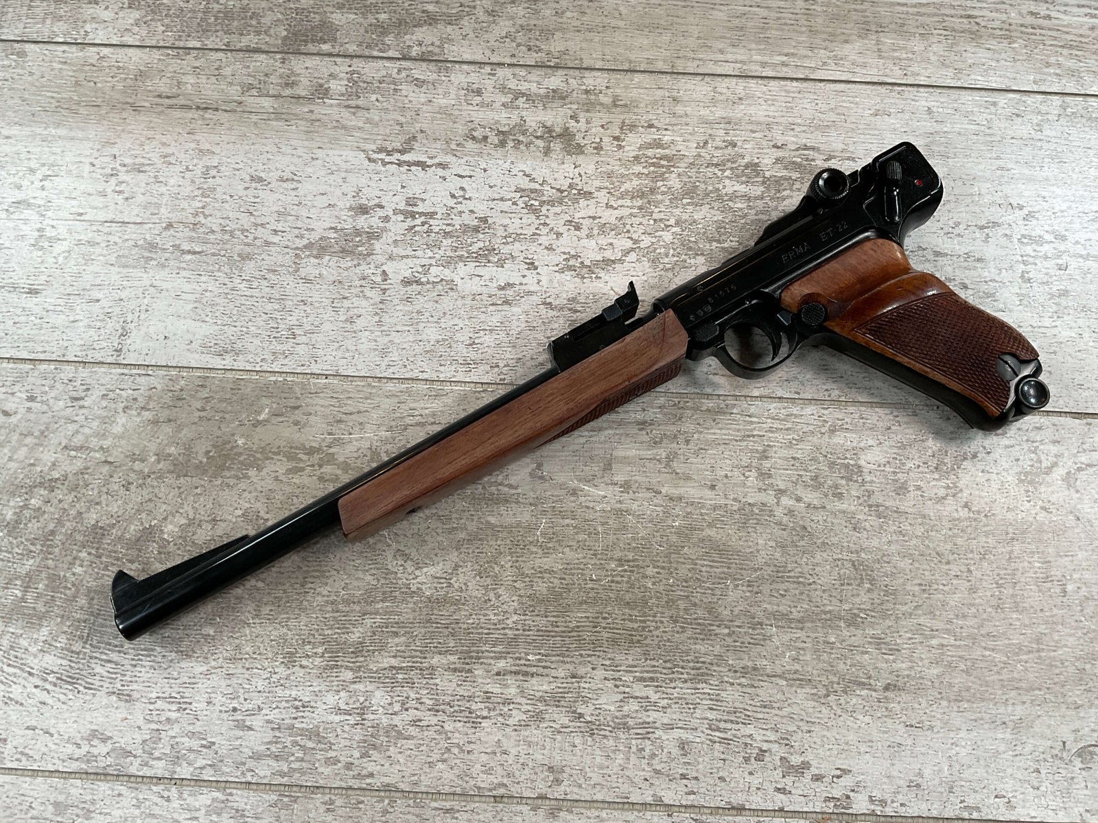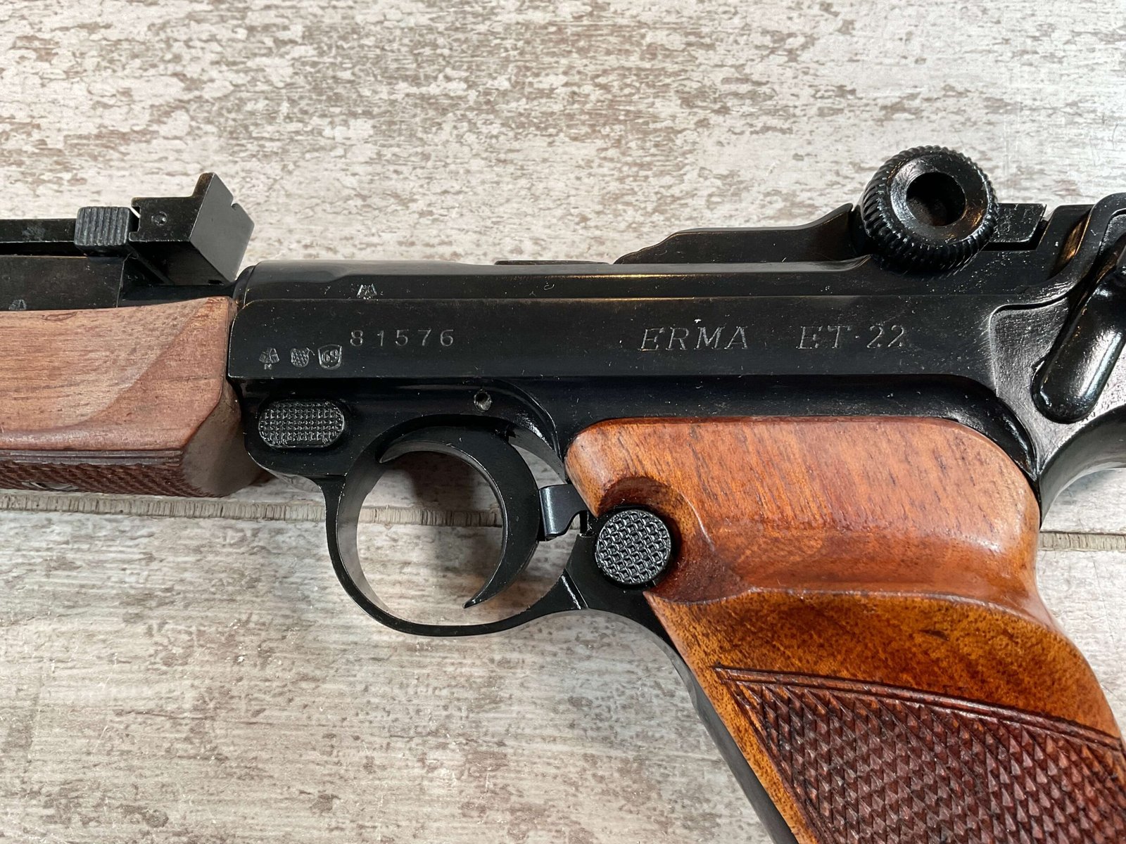 The Erma ET-22, also known as the Navy Luger, is a variant of the famous German Luger pistol chambered in .22 Long Rifle. It was produced by the Erma-Werke company, a German firearms manufacturer. The ET-22 was primarily designed as a training and recreational pistol, offering a similar operating mechanism to the larger-caliber Lugers but with reduced recoil and ammunition costs.