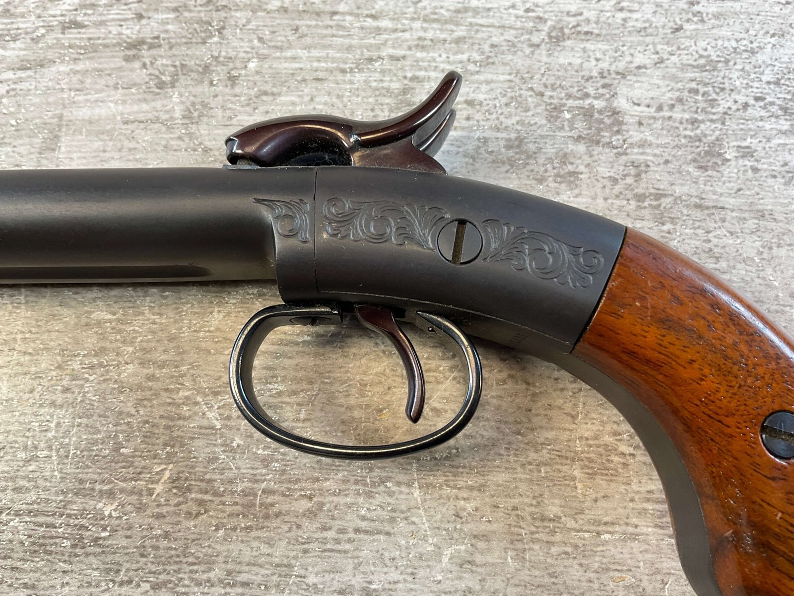 ETHAN ALLEN .36 CAL DOUBLE BARREL MUFF PISTOL #S07080, .36 CAL, 4″ DOUBLE BARREL, BEAUTIFUL FINISH ON BARRELS & FRAME, HIGH GLOSS PLUM BLUE ON HAMMERS & TRIGGER, SMOOTH WALNUT GRIPS, ACTION EXCELLENT, POSSIBLY UNFIRED, CONDITION AS SHOWN IN PICTURES, FROM THE JAMES EARL JONES “FAVORITES” COLLECTION W/ CERTIFICATE OF AUTHENTICITY.