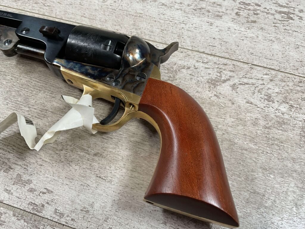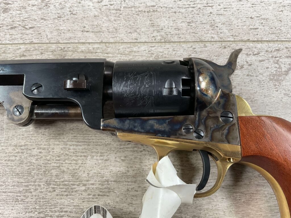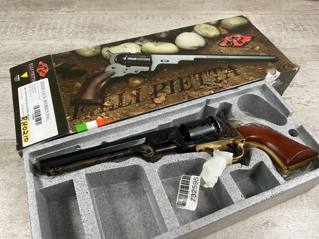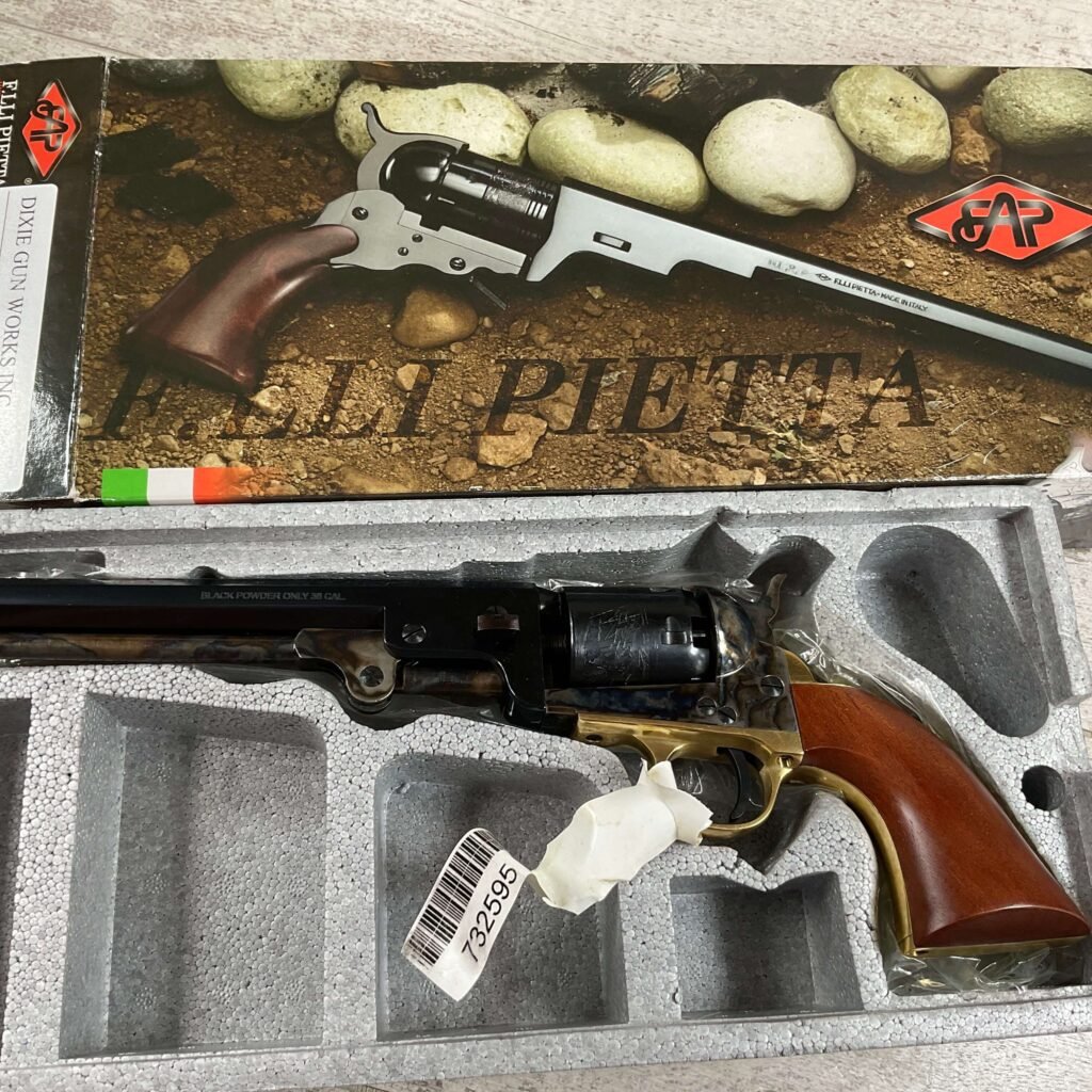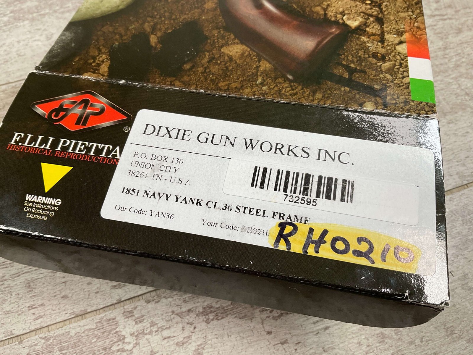F.LLI PIETTA .36 CAL 1851 NAVY YANK CASE HARDENED BLACK POWDER REVOLVER #732595, 7.5″ BLUED OCTAGON BARREL, REAR SIGHT IN HAMMER, BLADE FRONT SIGHT, EXC SMOOTH WALNUT GRIPS, BRASS BACKSTRAP & TRIGGER GUARD, COLOR CASE HARDENED FRAME/PLUNGER & HAMMER, NO CYLINDER WEAR, CYLINDER HAS ENGRAVING, EXC OVERALL, 98+%  **IN ORIGINAL PACKAGING W/TAGS, NEVER FIRED**