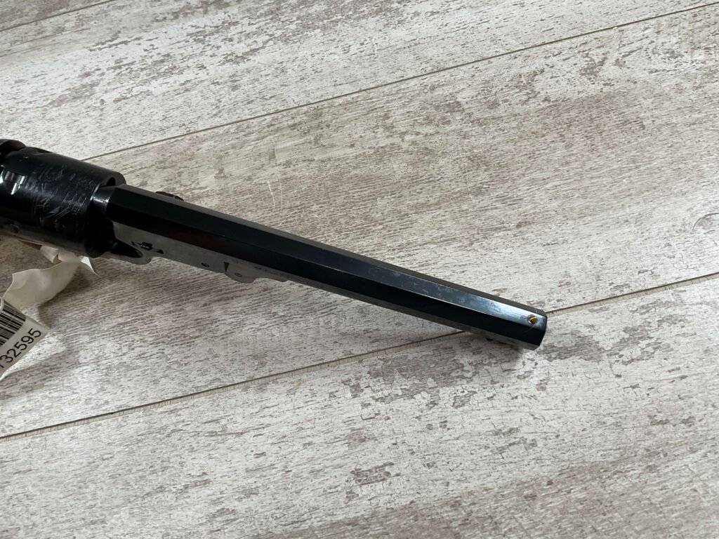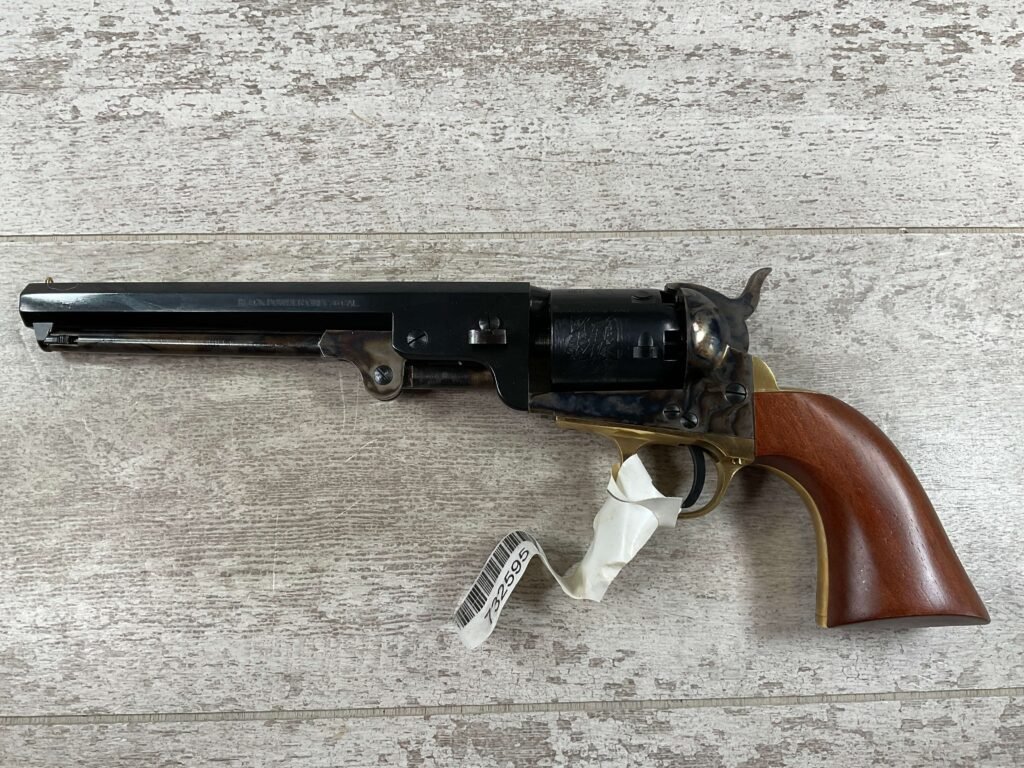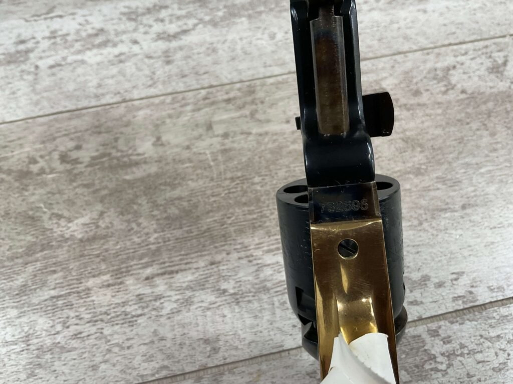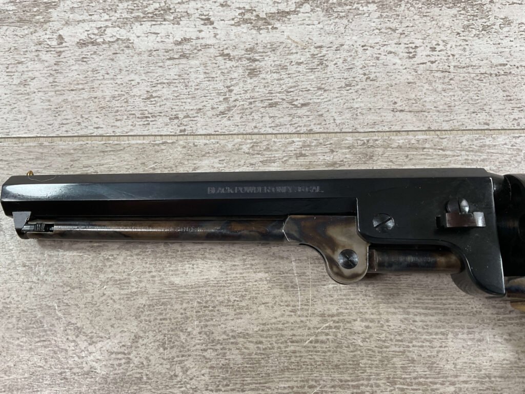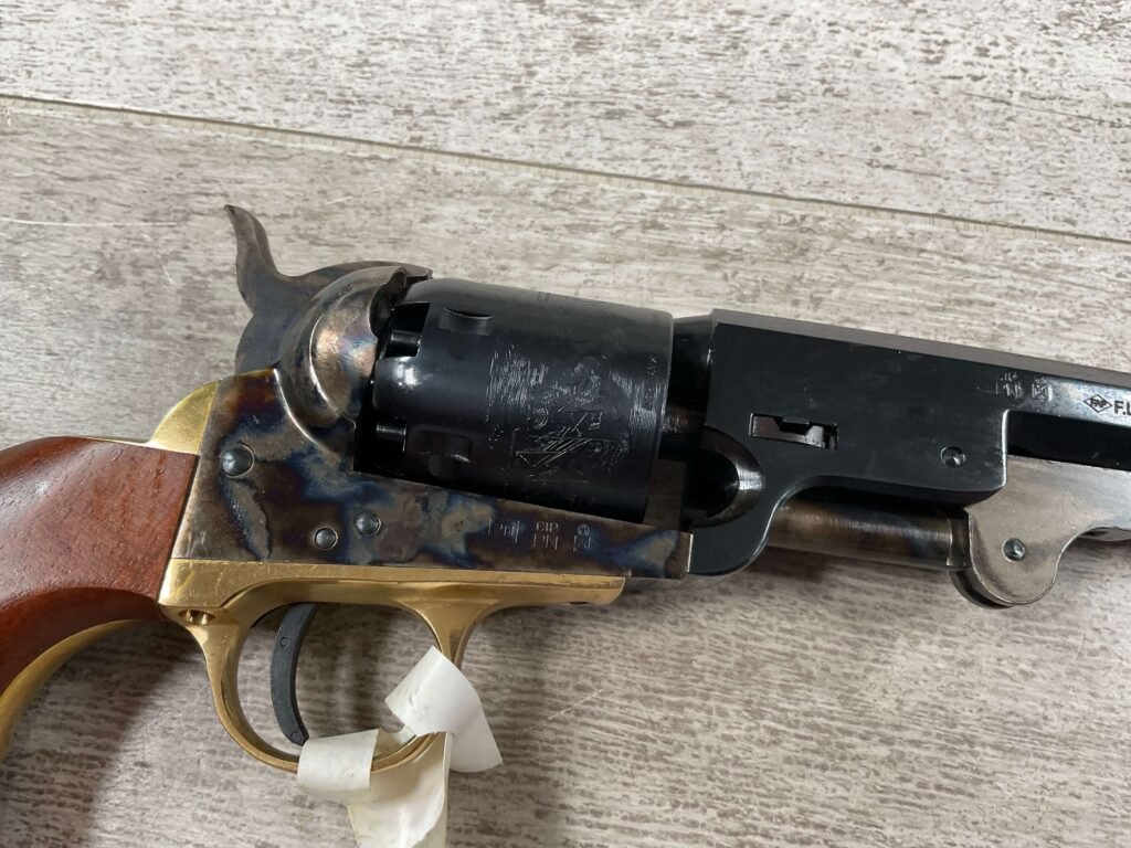 F.LLI PIETTA .36 CAL 1851 NAVY YANK CASE HARDENED BLACK POWDER REVOLVER #732595, 7.5″ BLUED OCTAGON BARREL, REAR SIGHT IN HAMMER, BLADE FRONT SIGHT, EXC SMOOTH WALNUT GRIPS, BRASS BACKSTRAP & TRIGGER GUARD, COLOR CASE HARDENED FRAME/PLUNGER & HAMMER, NO CYLINDER WEAR, CYLINDER HAS ENGRAVING, EXC OVERALL, 98+%  **IN ORIGINAL PACKAGING W/TAGS, NEVER FIRED**