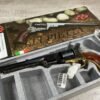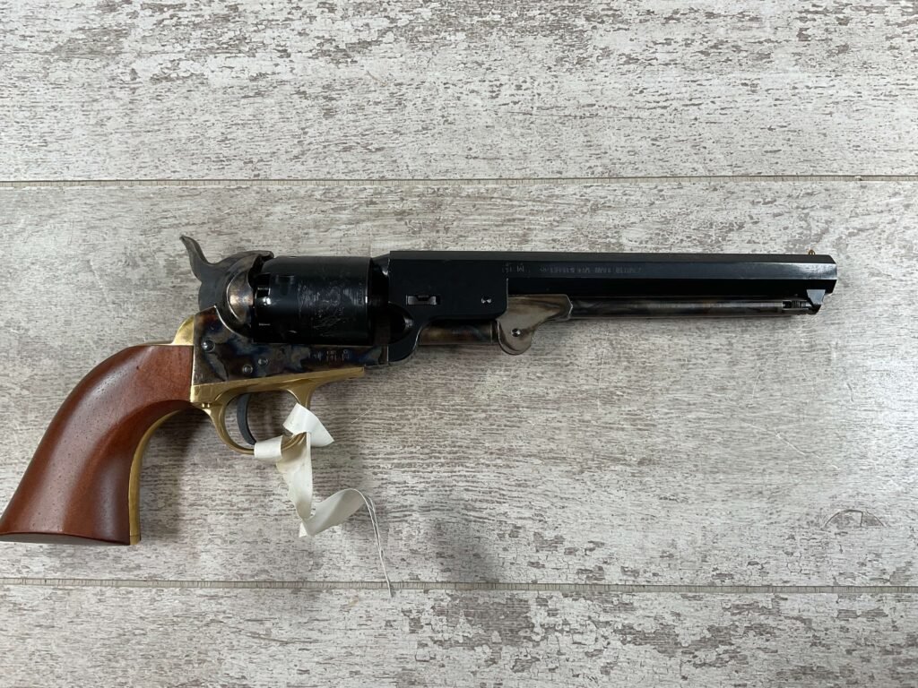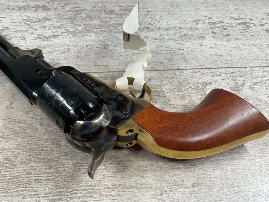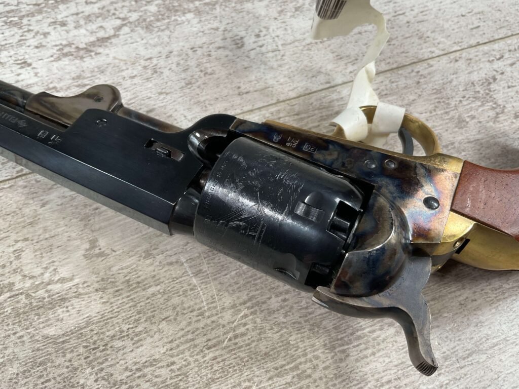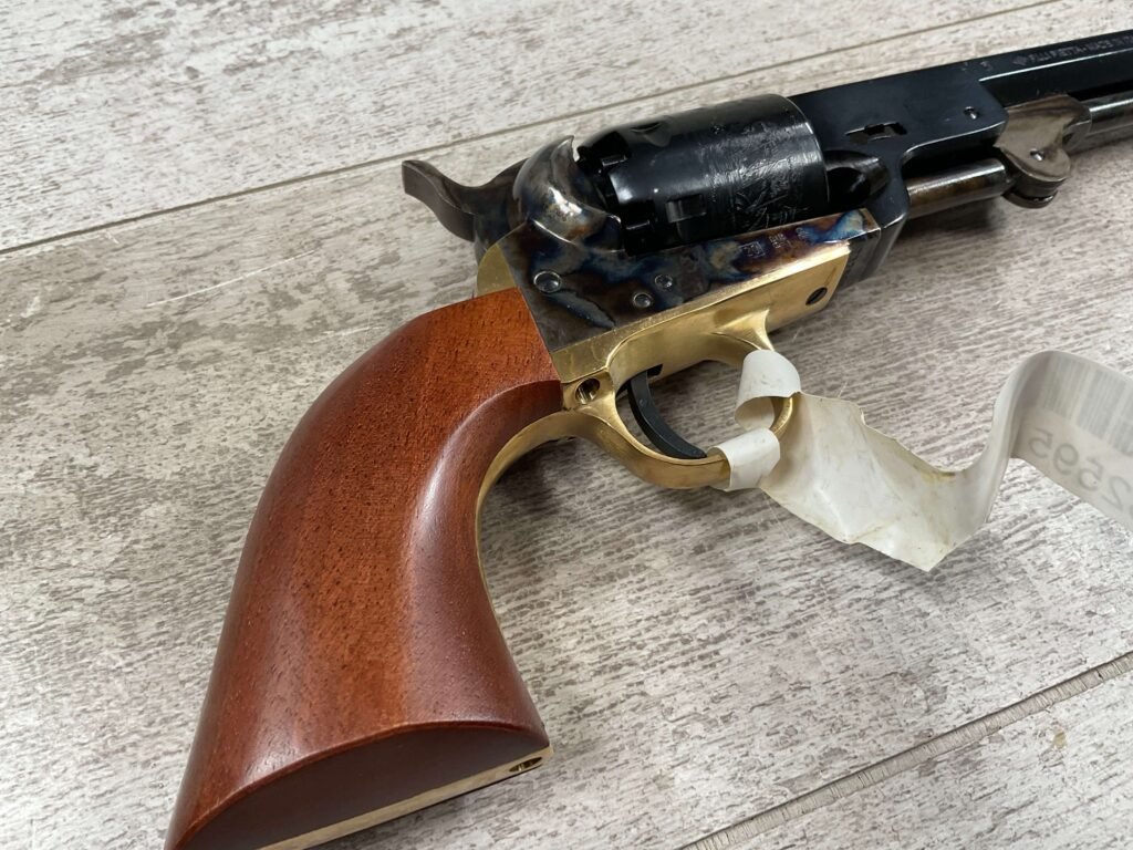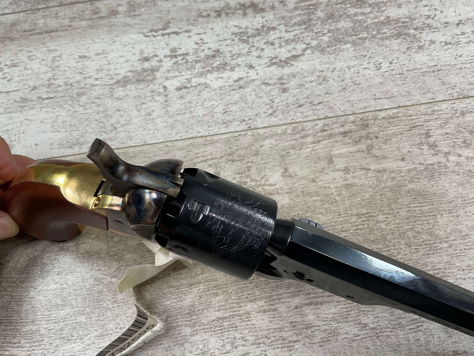 F.LLI PIETTA .36 CAL 1851 NAVY YANK CASE HARDENED BLACK POWDER REVOLVER #732595, 7.5″ BLUED OCTAGON BARREL, REAR SIGHT IN HAMMER, BLADE FRONT SIGHT, EXC SMOOTH WALNUT GRIPS, BRASS BACKSTRAP & TRIGGER GUARD, COLOR CASE HARDENED FRAME/PLUNGER & HAMMER, NO CYLINDER WEAR, CYLINDER HAS ENGRAVING, EXC OVERALL, 98+%  **IN ORIGINAL PACKAGING W/TAGS, NEVER FIRED**