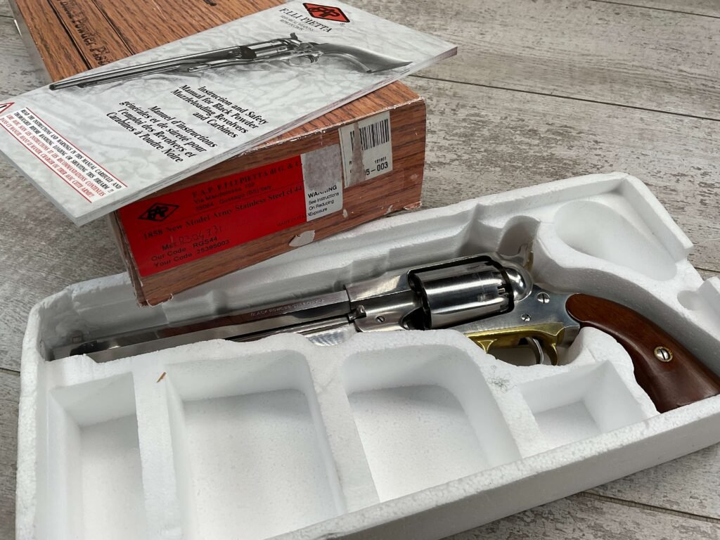 The Pietta 44 Caliber New Model Army in stainless steel is a modern replica of the iconic 1858 Army revolver, which was widely used during the Civil War. Here are some key features and details about this model: