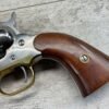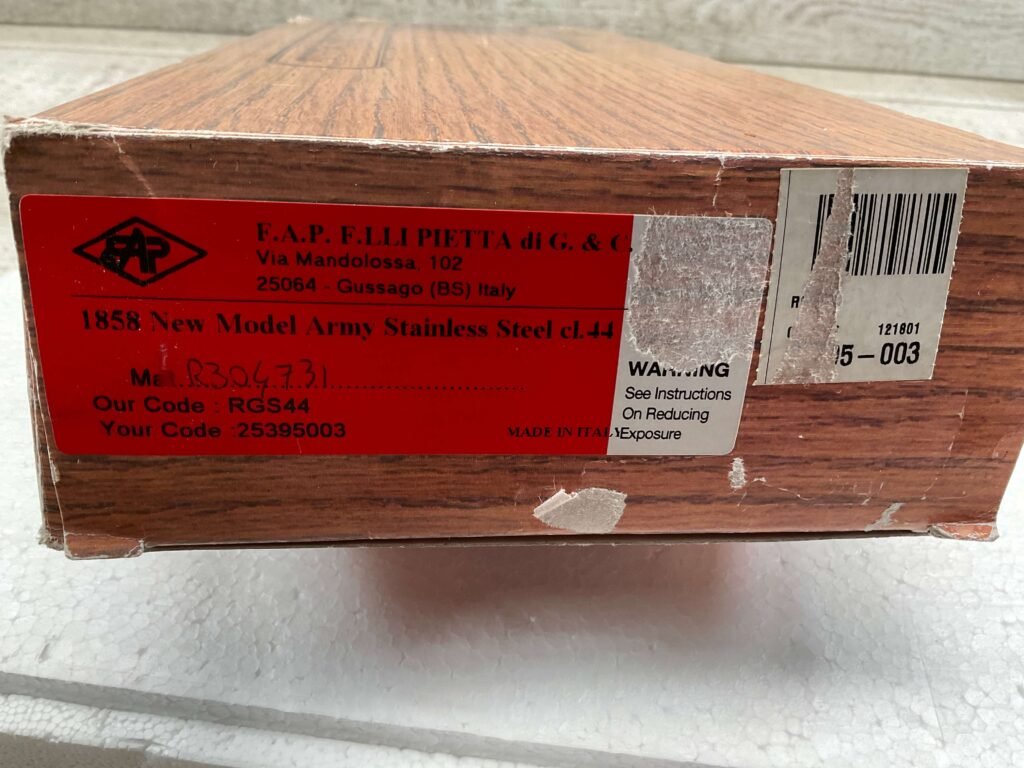 F.LLI PIETTA .44 CAL 1858 NEW MODEL ARMY BLACK POWDER REVOLVER #12314553, 8″ OCTAGON BARREL, SA ONLY, FIXED REAR SIGHT ON HAMMER, BLADE FRONT SIGHT, EXC SMOOTH BROWN WOOD GRIPS, STAINLESS STEEL BBL, CYLINDER, HAMMER AND TRIGGER, BRASS TRIGGER GUARD,  CABELA’S BLACK POWDER PISTOL, NIB