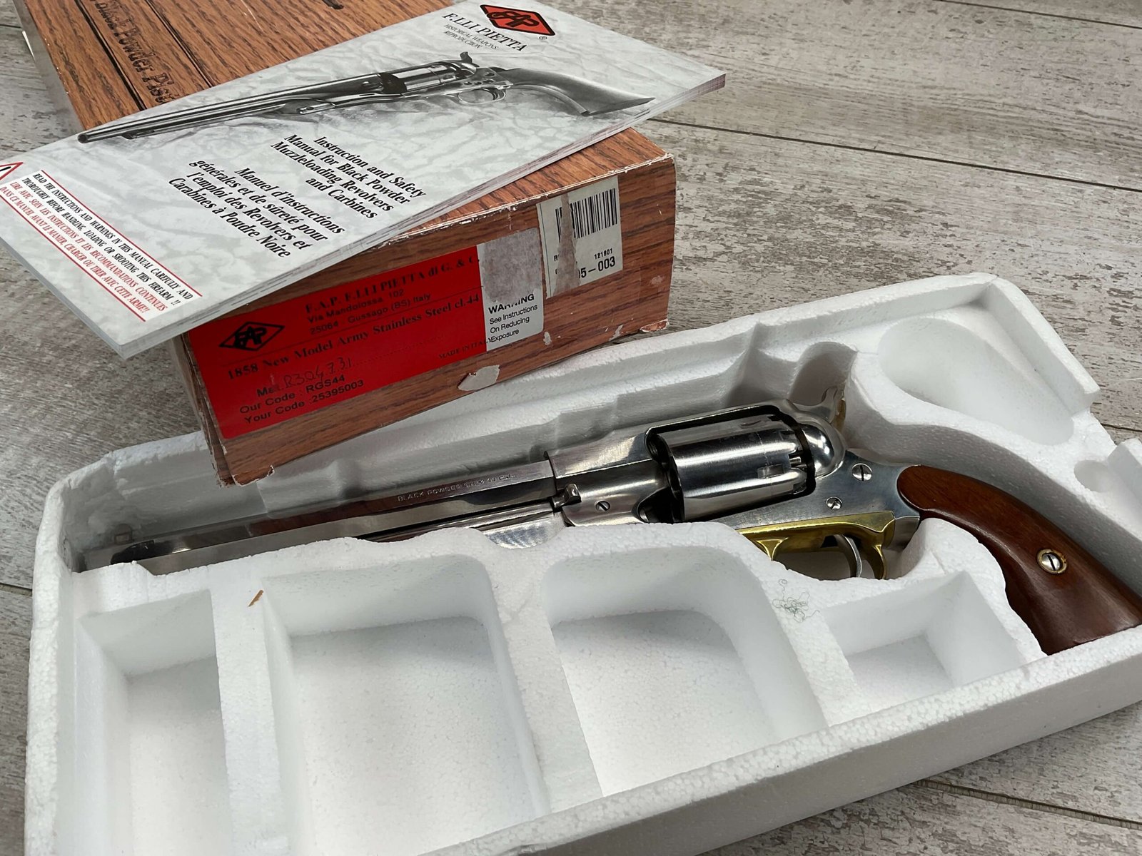 F.LLI PIETTA .44 CAL 1858 NEW MODEL ARMY BLACK POWDER REVOLVER #12314553, 8″ OCTAGON BARREL, SA ONLY, FIXED REAR SIGHT ON HAMMER, BLADE FRONT SIGHT, EXC SMOOTH BROWN WOOD GRIPS, STAINLESS STEEL BBL, CYLINDER, HAMMER AND TRIGGER, BRASS TRIGGER GUARD,  CABELA’S BLACK POWDER PISTOL, NIB
