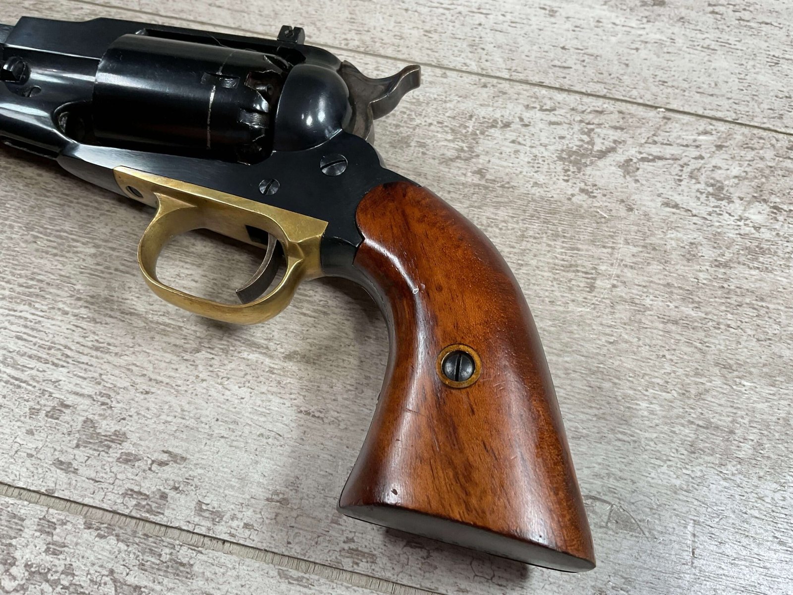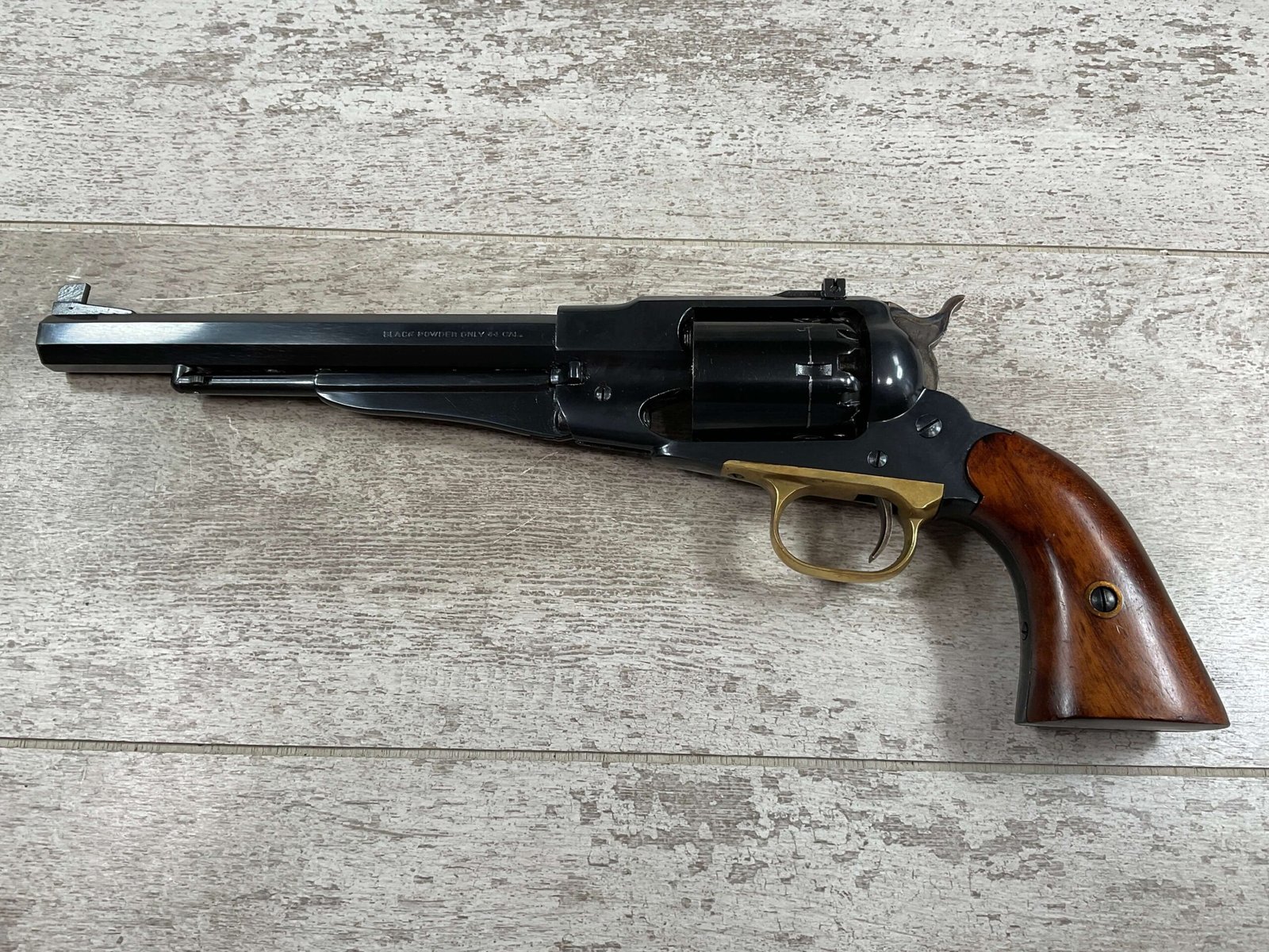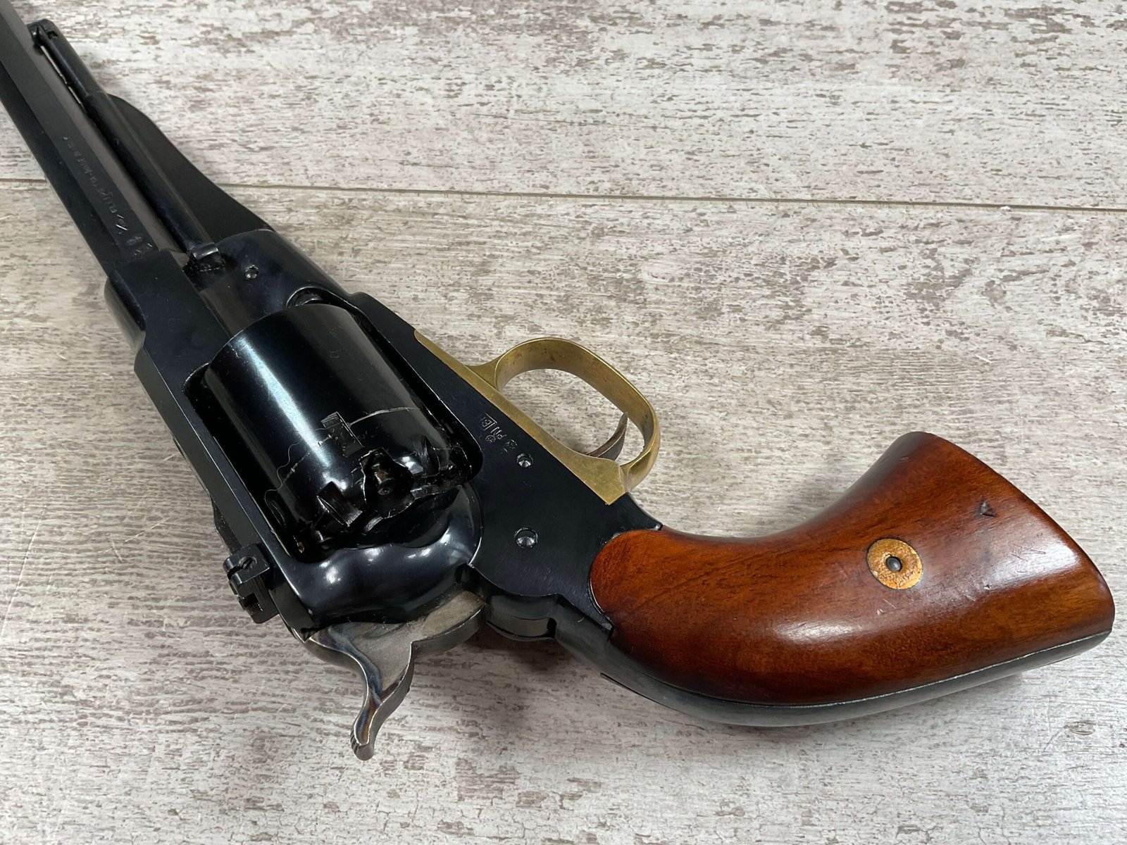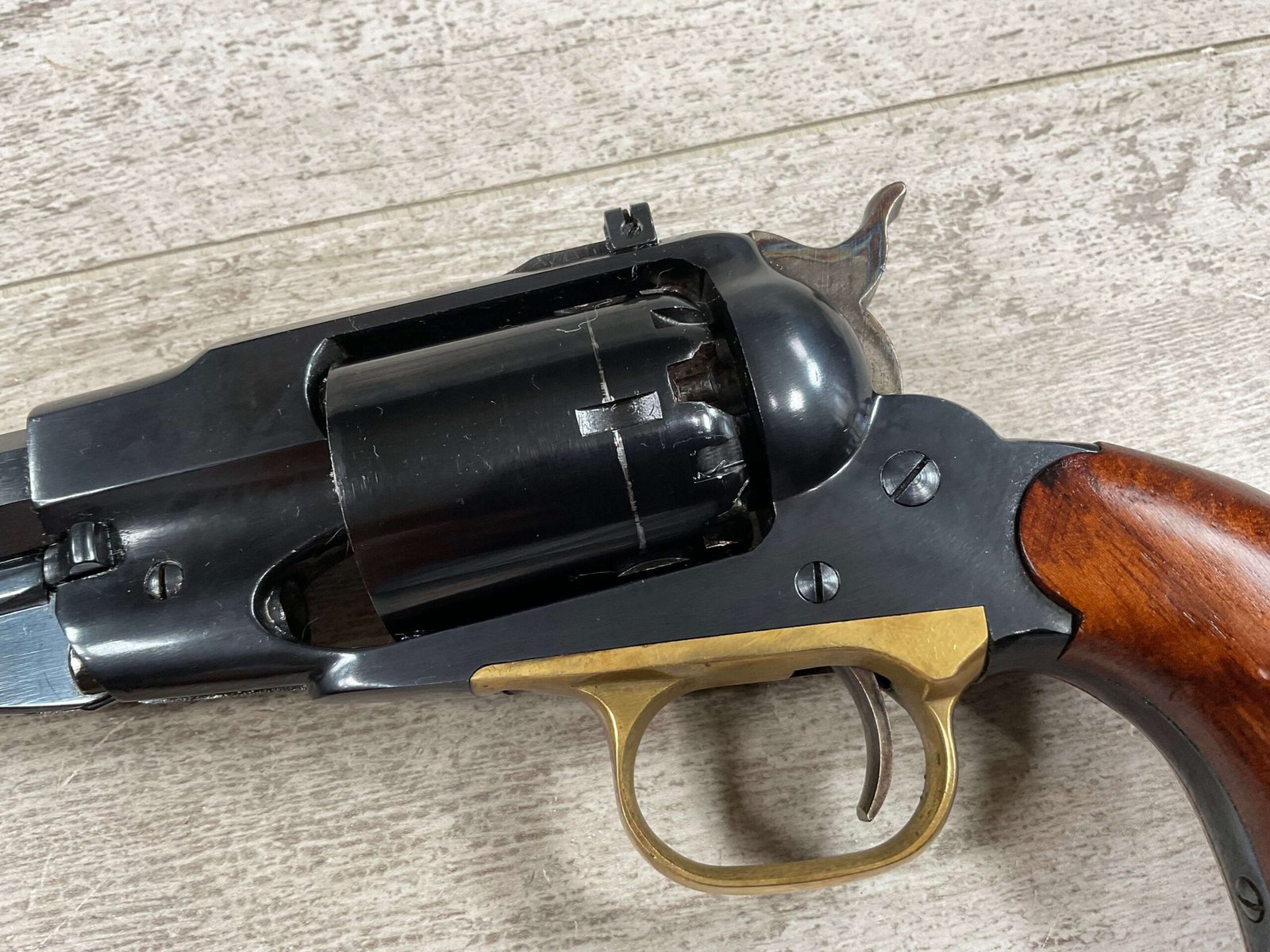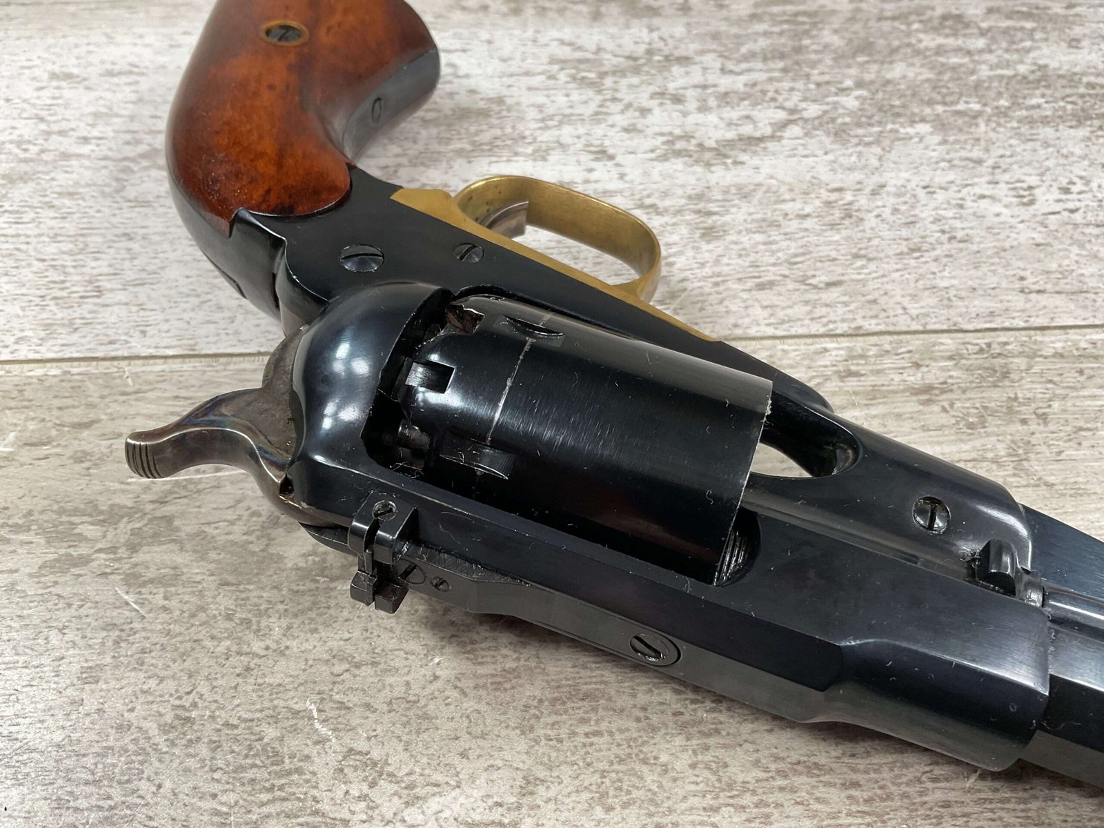 F.LLI PIETTA .44 CAL 1860 BLACK POWDER REVOLVER #223243, 8″ OCTAGON BARREL, ADJUSTABLE REAR SIGHTS, BLADE FRONT SIGHT, EXC SMOOTH DARK WALNUT GRIPS, BRASS TRIGGER GUARD, BLUED FRAME/CYLINDER AND BARREL, COLOR CASE HARDENED HAMMER & TRIGGER, LIGHT CYLINDER WEAR, EXC OVERALL, 95+%