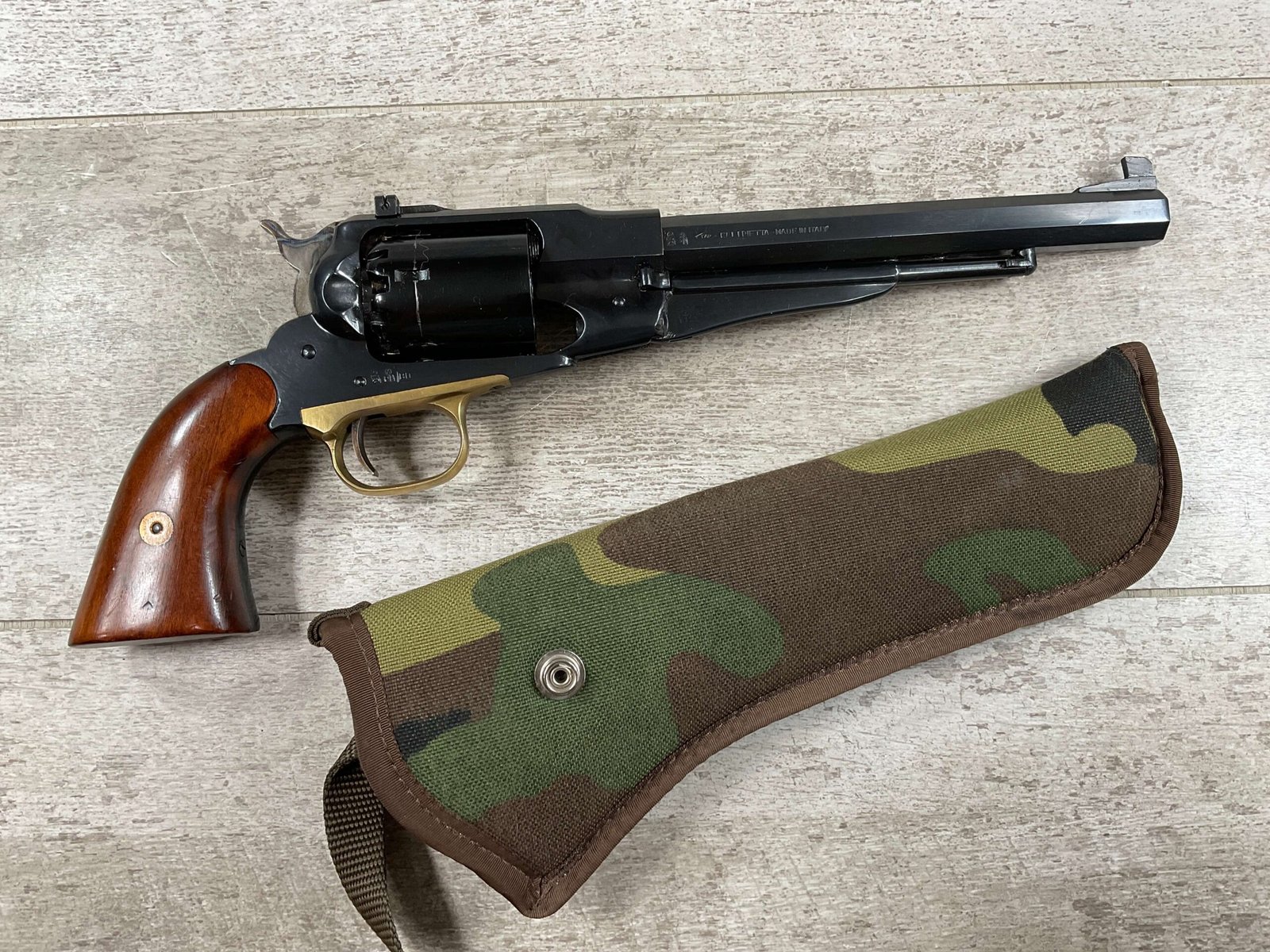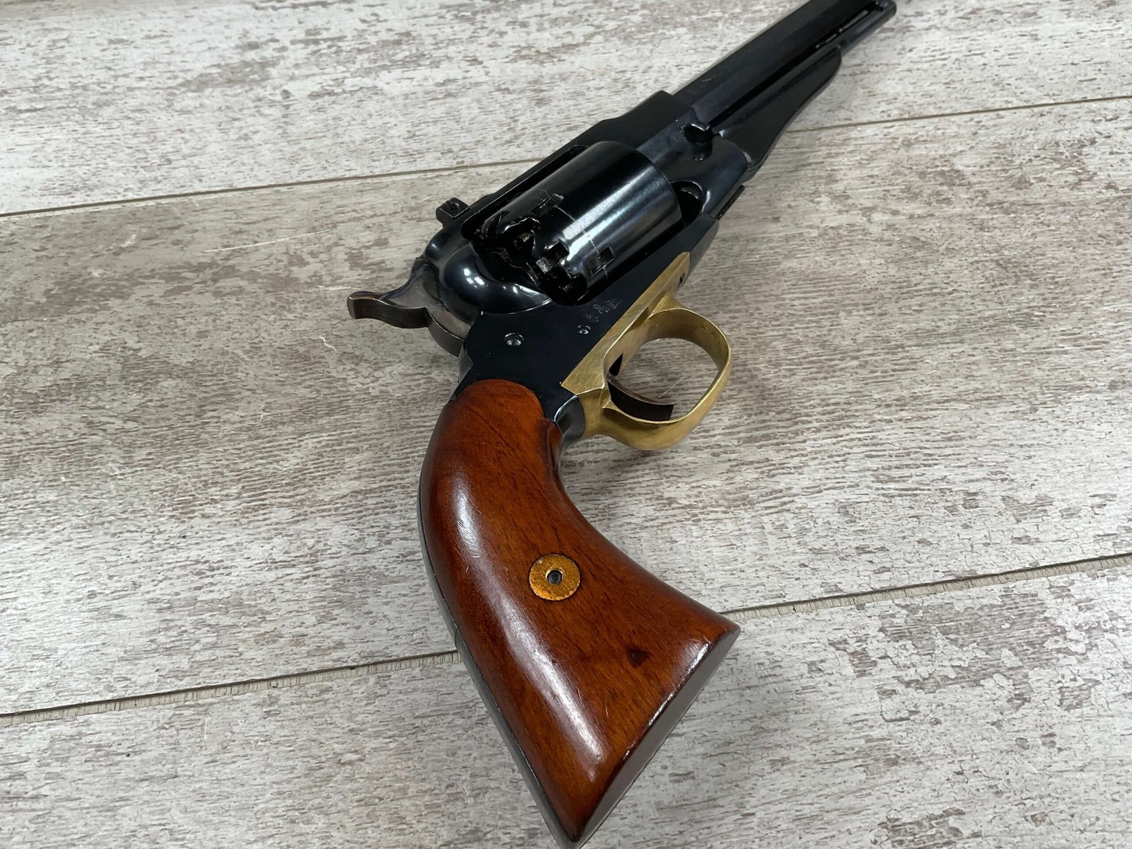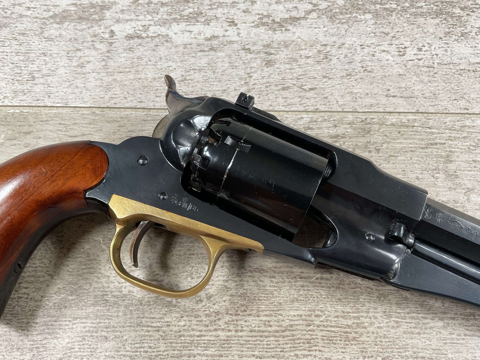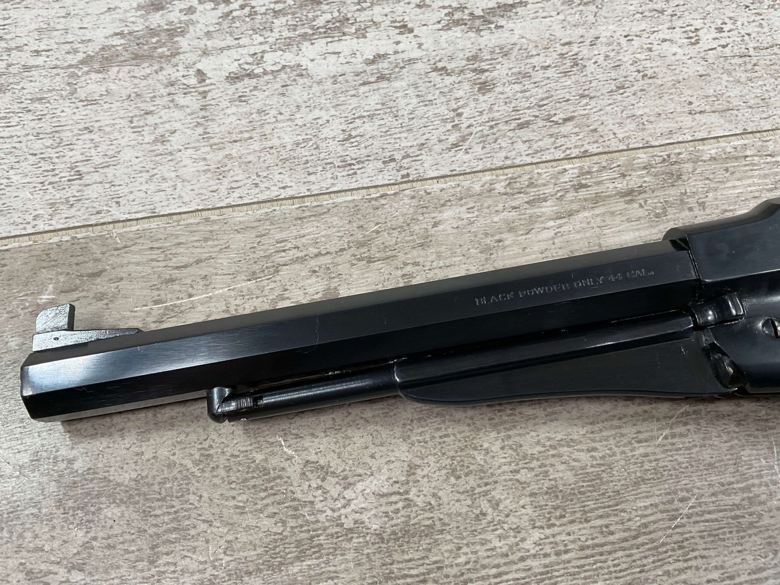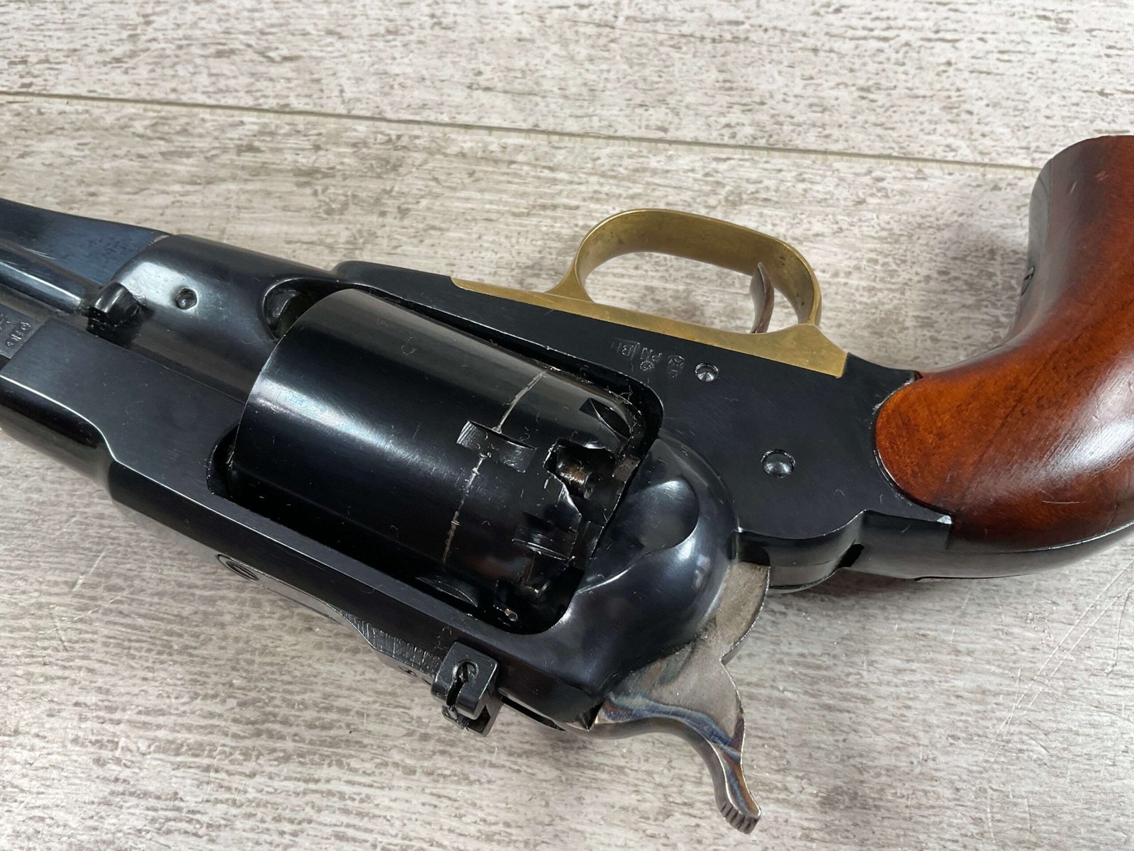 F.LLI PIETTA .44 CAL 1860 BLACK POWDER REVOLVER #223243, 8″ OCTAGON BARREL, ADJUSTABLE REAR SIGHTS, BLADE FRONT SIGHT, EXC SMOOTH DARK WALNUT GRIPS, BRASS TRIGGER GUARD, BLUED FRAME/CYLINDER AND BARREL, COLOR CASE HARDENED HAMMER & TRIGGER, LIGHT CYLINDER WEAR, EXC OVERALL, 95+%