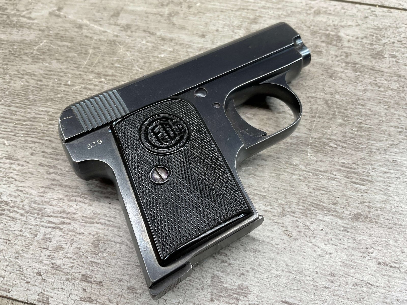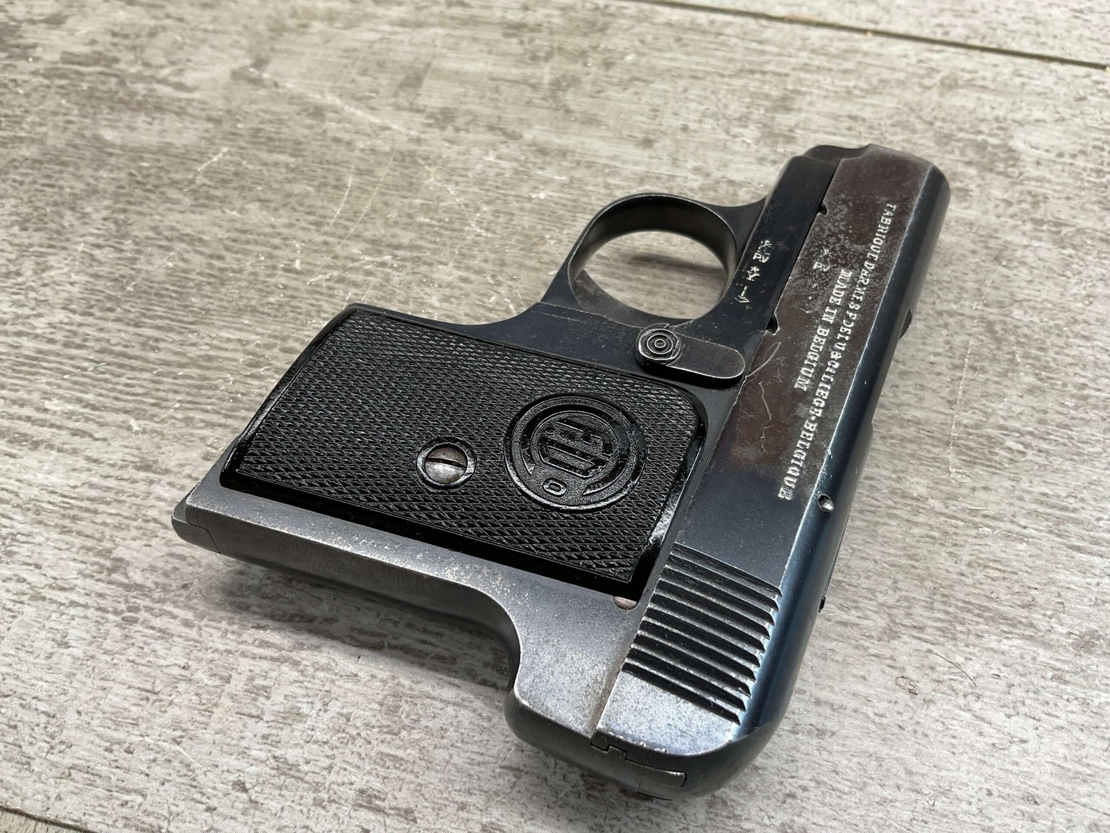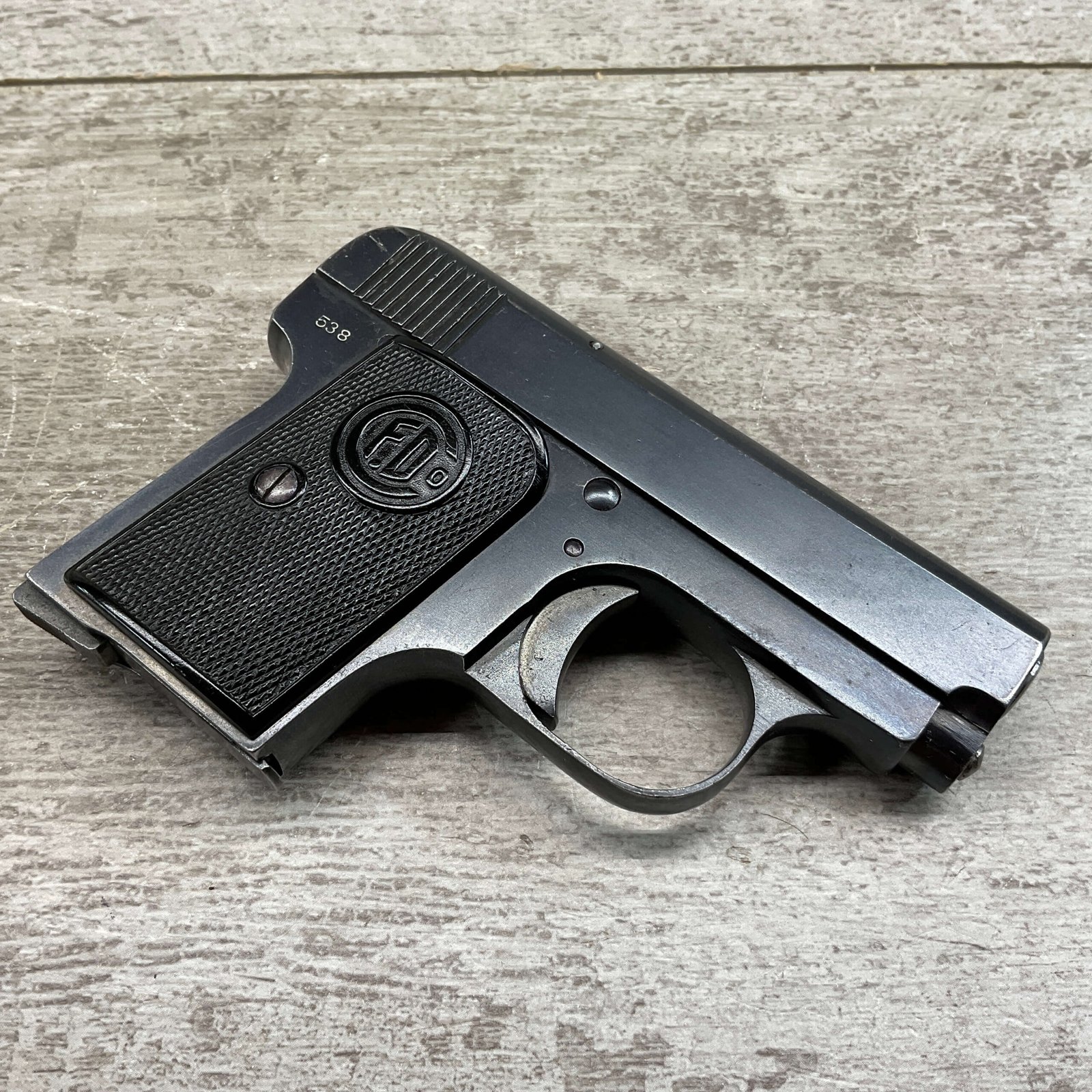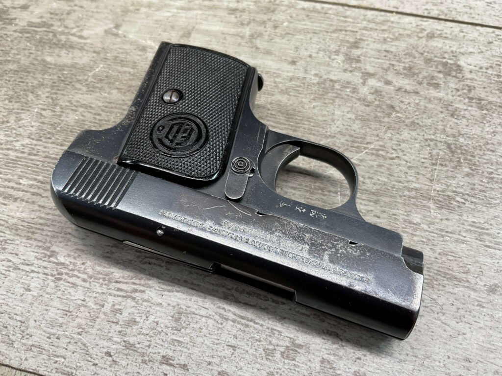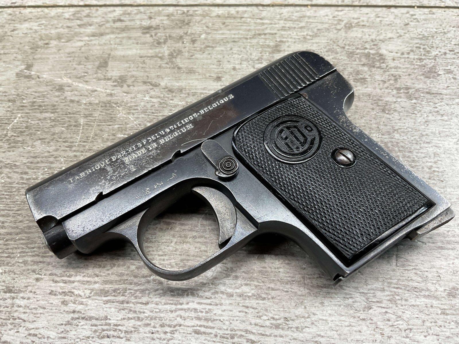 FABRIQUE D’ARMES F.DELU 6.35MM / 25ACP POCKET SEMI AUTO PISTOL #538, 6.35MM, 2″ BBL, 80%+ BLUE FINISH, BELGIAN PROOFS ON SLIDE & BBL, ALL MATCHING, BORE HAS FROSTING IN GROOVES BUT NICE RIFLING, EXC CHECKERED BLACK PLASTIC GRIPS, 1-6RND ORIGINAL MAGAZINE, GOOD CONDITION OVERALL