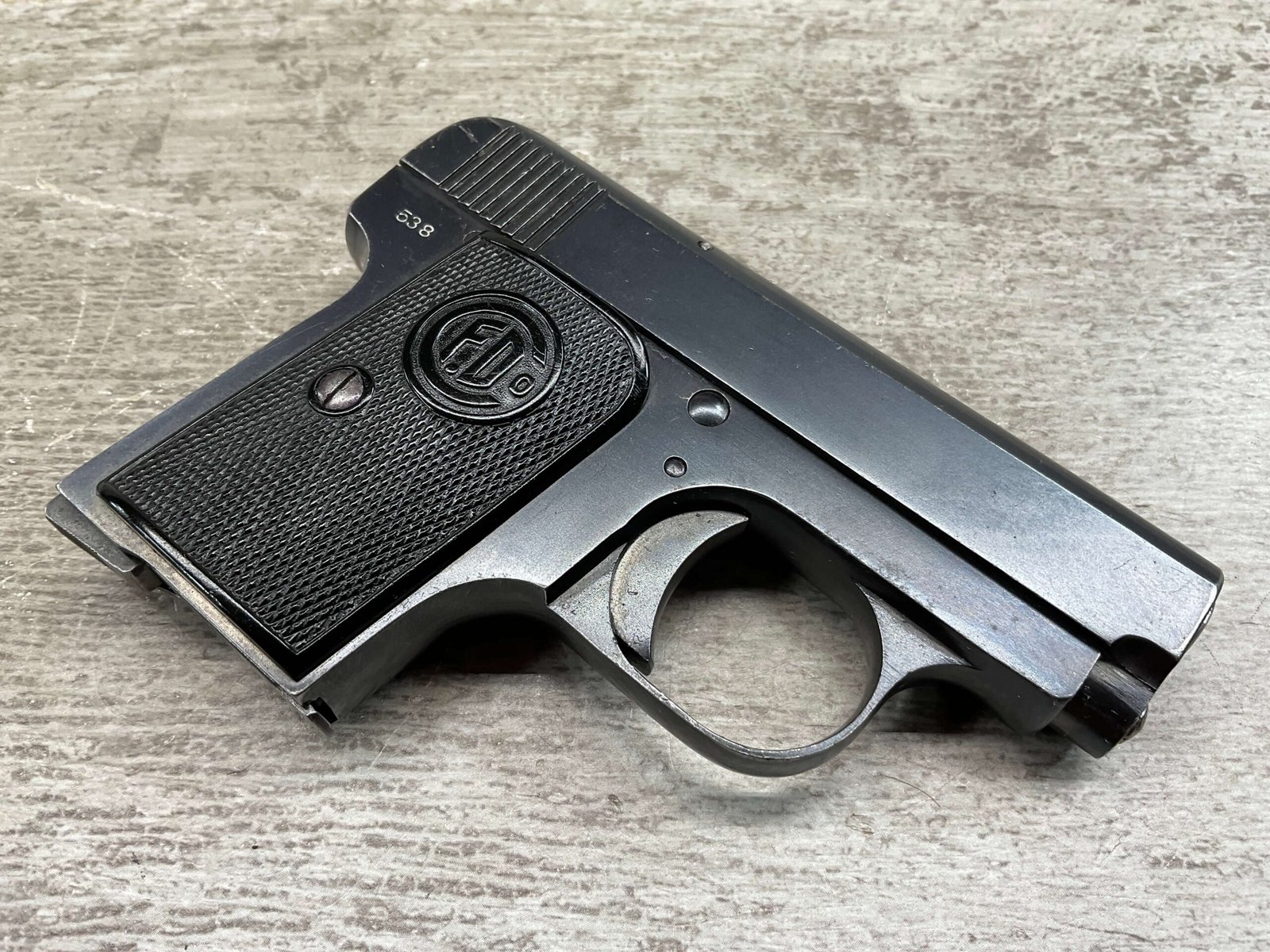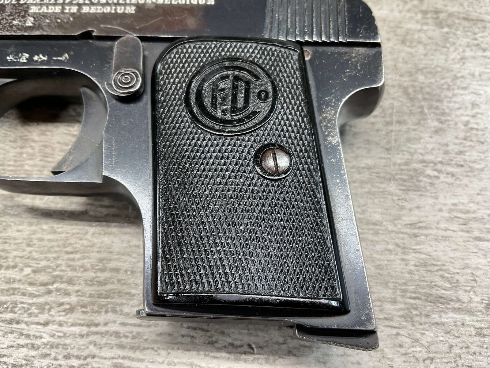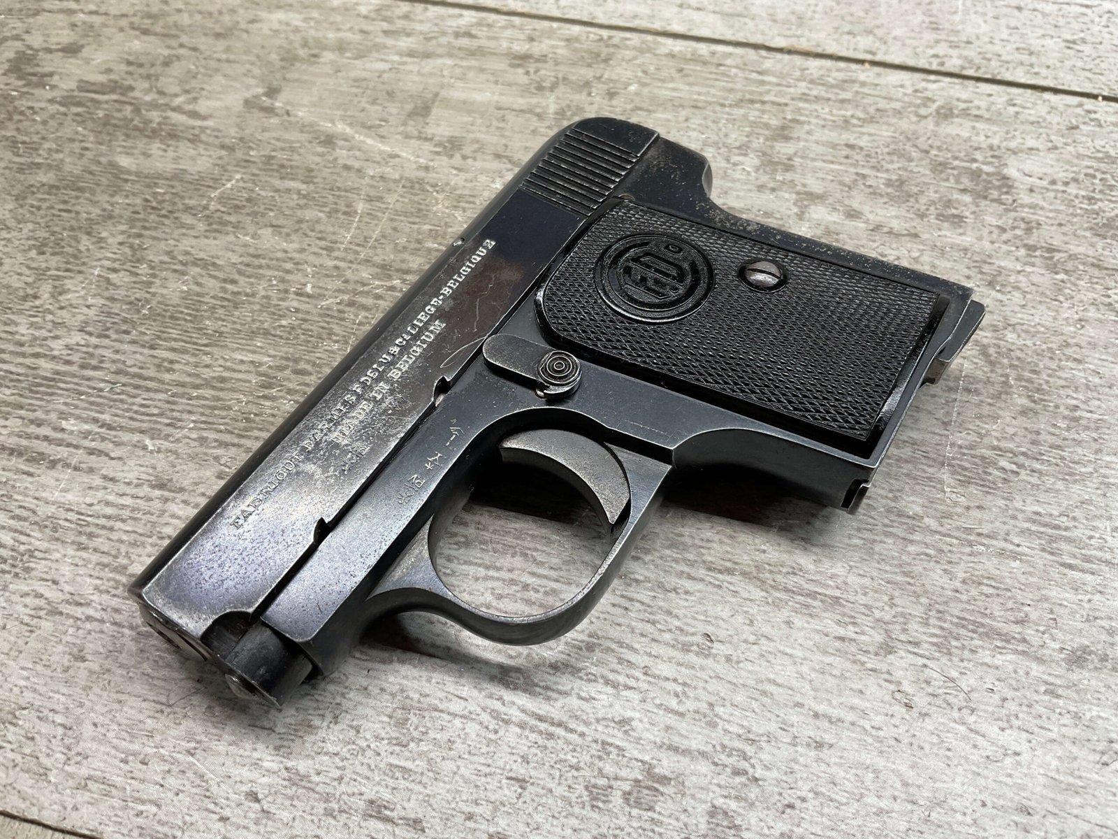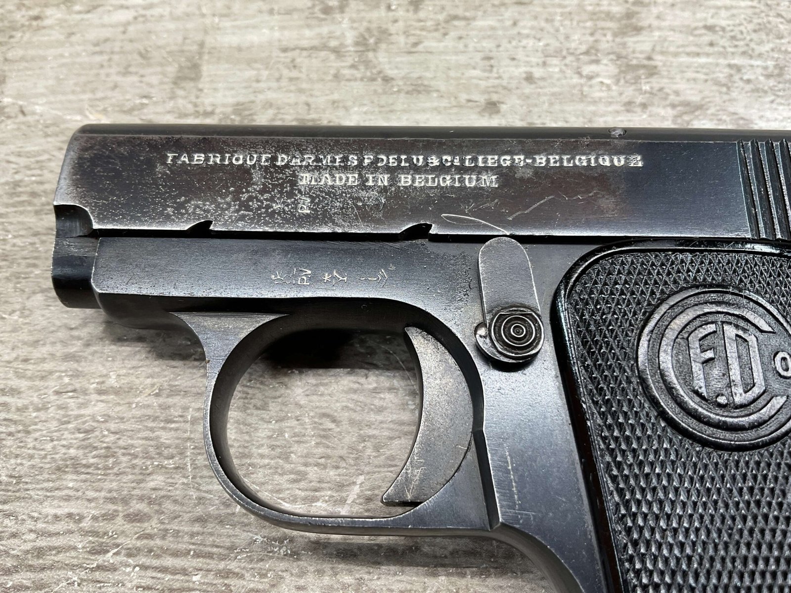 FABRIQUE D’ARMES F.DELU 6.35MM / 25ACP POCKET SEMI AUTO PISTOL #538, 6.35MM, 2″ BBL, 80%+ BLUE FINISH, BELGIAN PROOFS ON SLIDE & BBL, ALL MATCHING, BORE HAS FROSTING IN GROOVES BUT NICE RIFLING, EXC CHECKERED BLACK PLASTIC GRIPS, 1-6RND ORIGINAL MAGAZINE, GOOD CONDITION OVERALL
