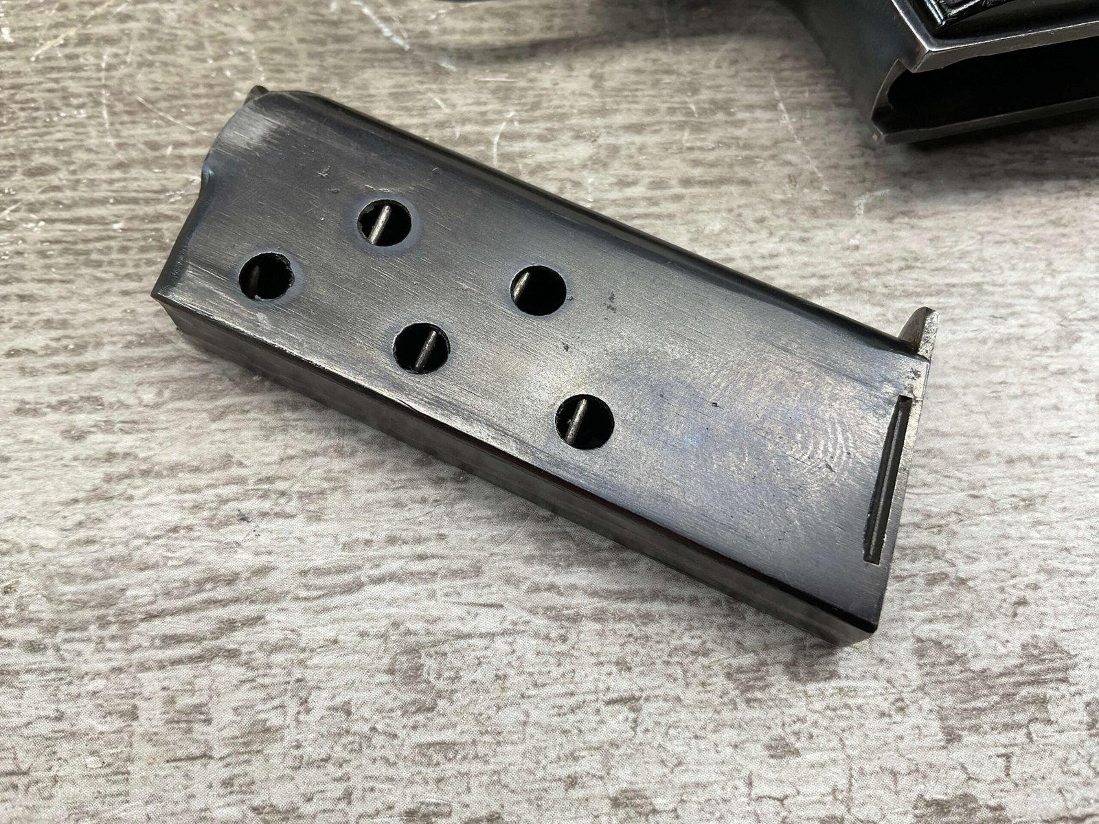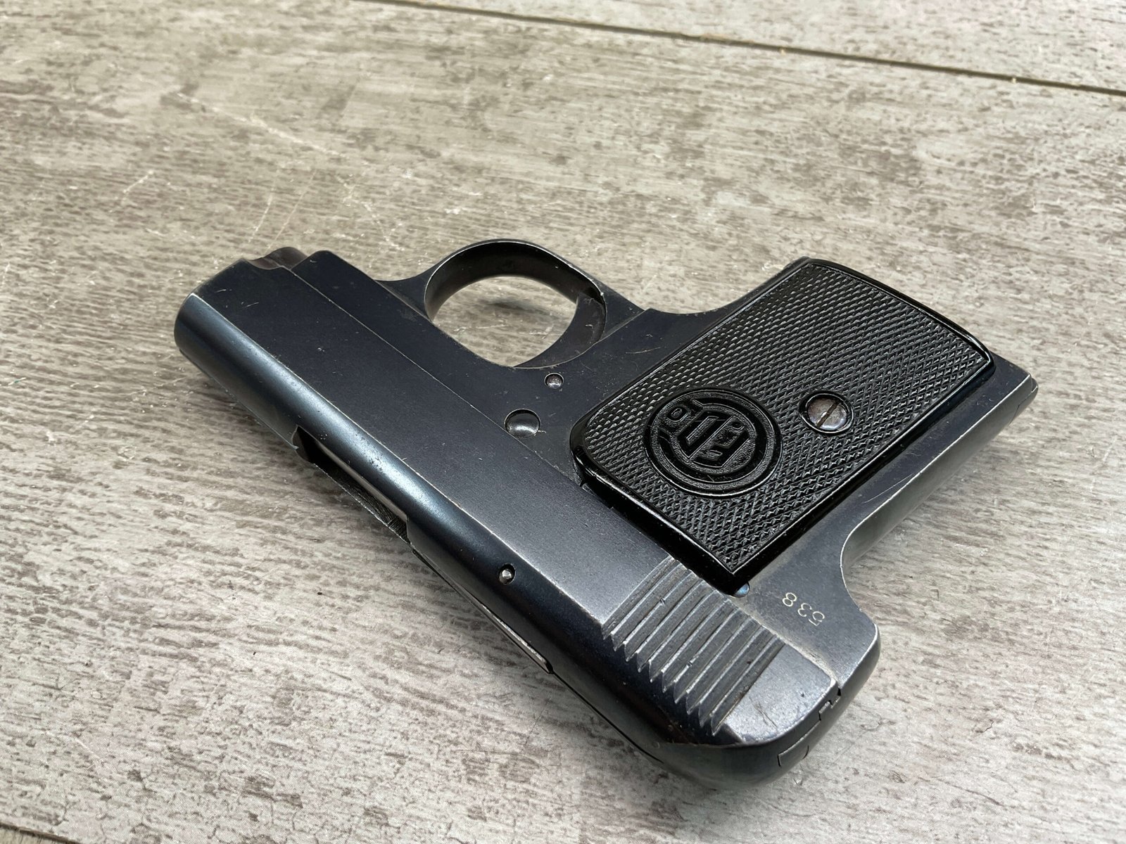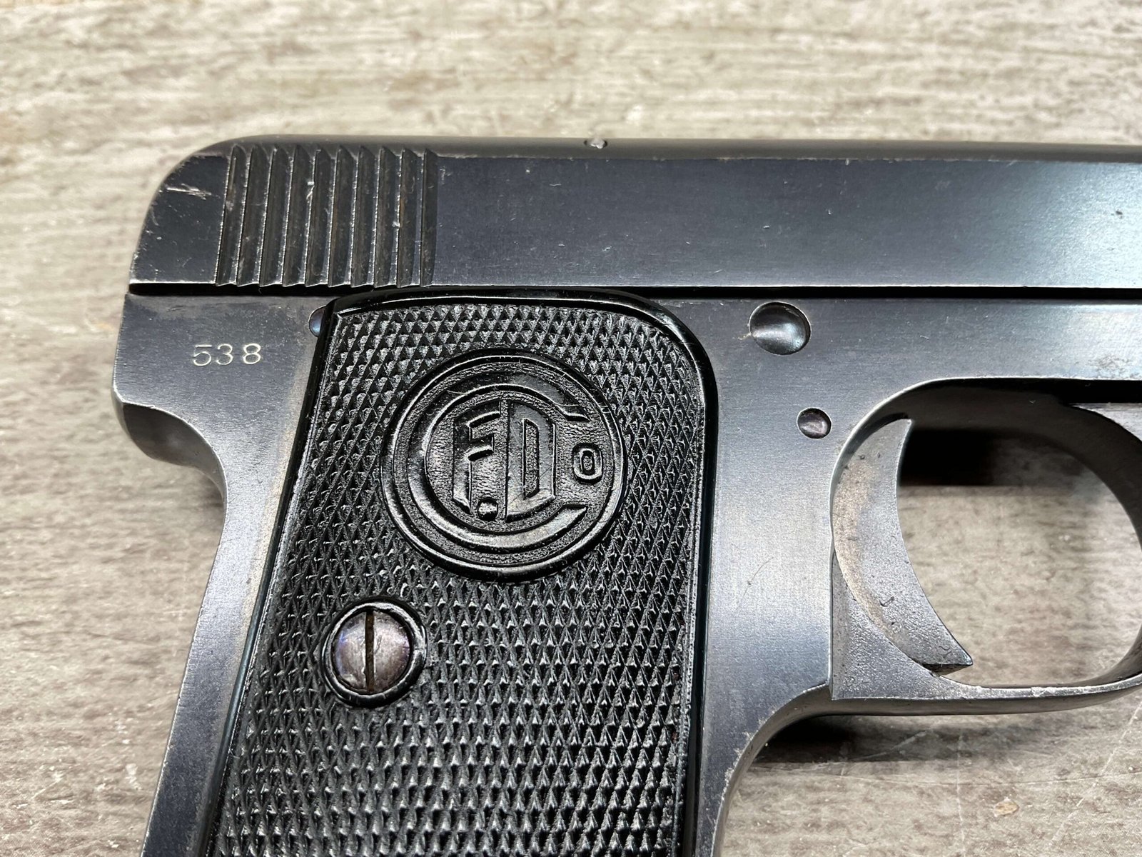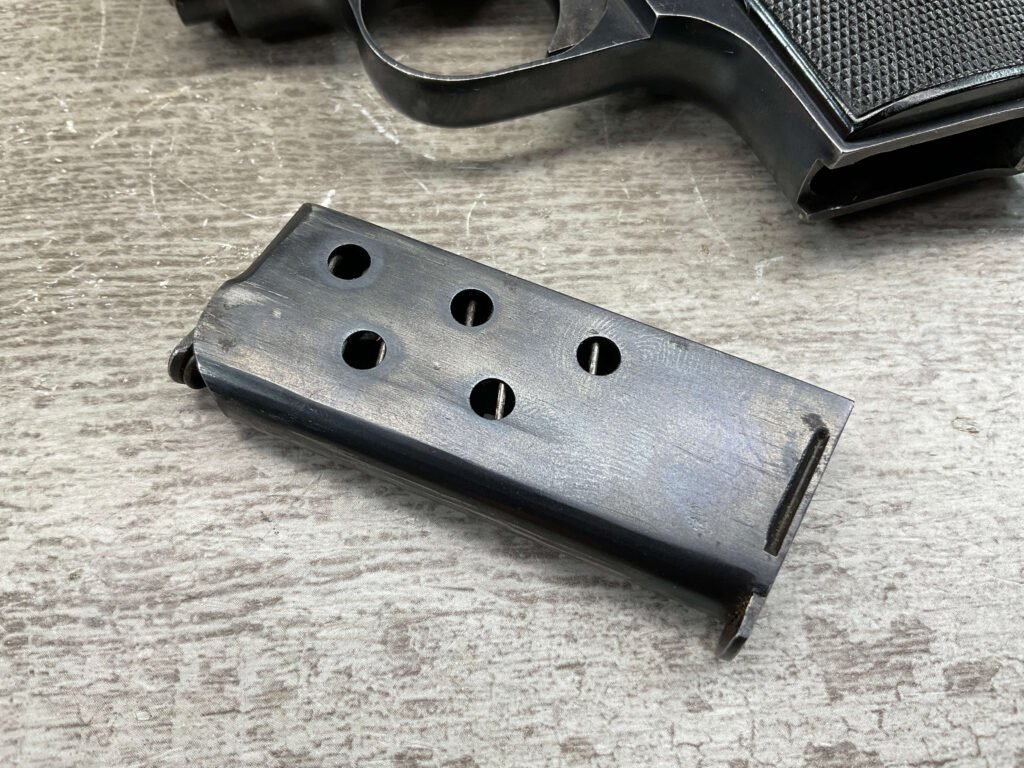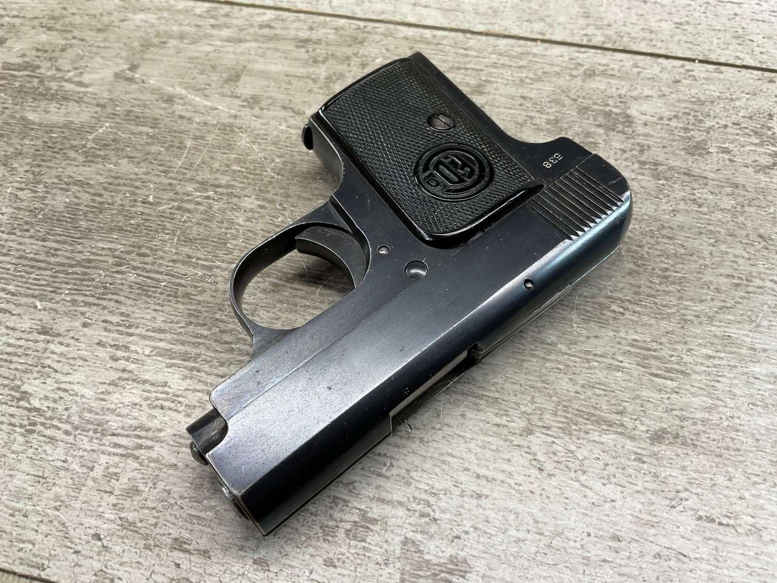FABRIQUE D’ARMES F.DELU 6.35MM / 25ACP POCKET SEMI AUTO PISTOL #538, 6.35MM, 2″ BBL, 80%+ BLUE FINISH, BELGIAN PROOFS ON SLIDE & BBL, ALL MATCHING, BORE HAS FROSTING IN GROOVES BUT NICE RIFLING, EXC CHECKERED BLACK PLASTIC GRIPS, 1-6RND ORIGINAL MAGAZINE, GOOD CONDITION OVERALL