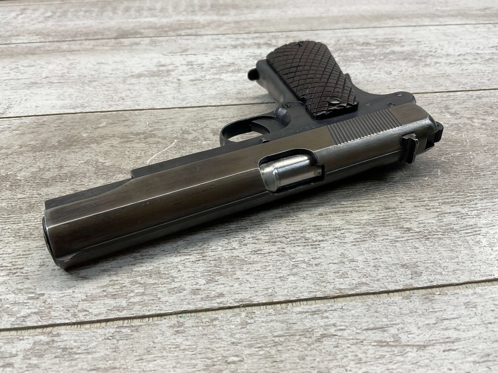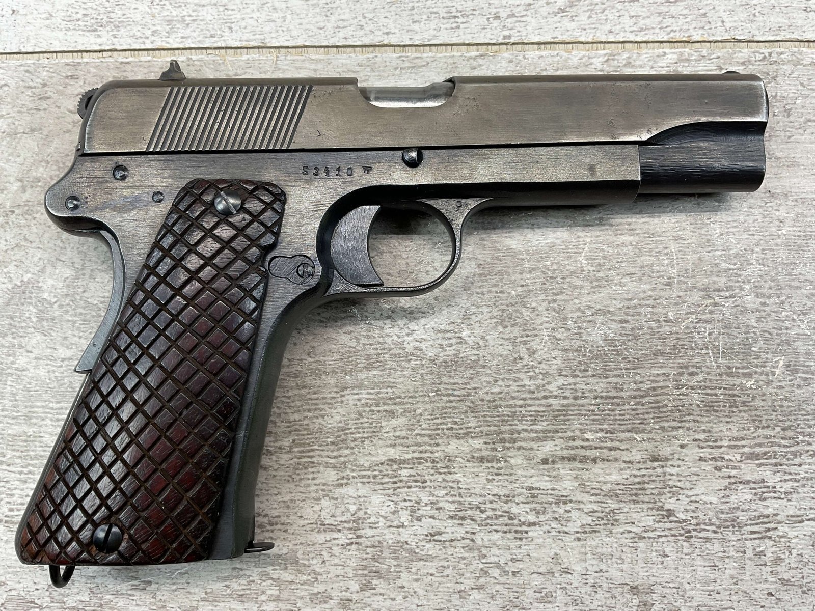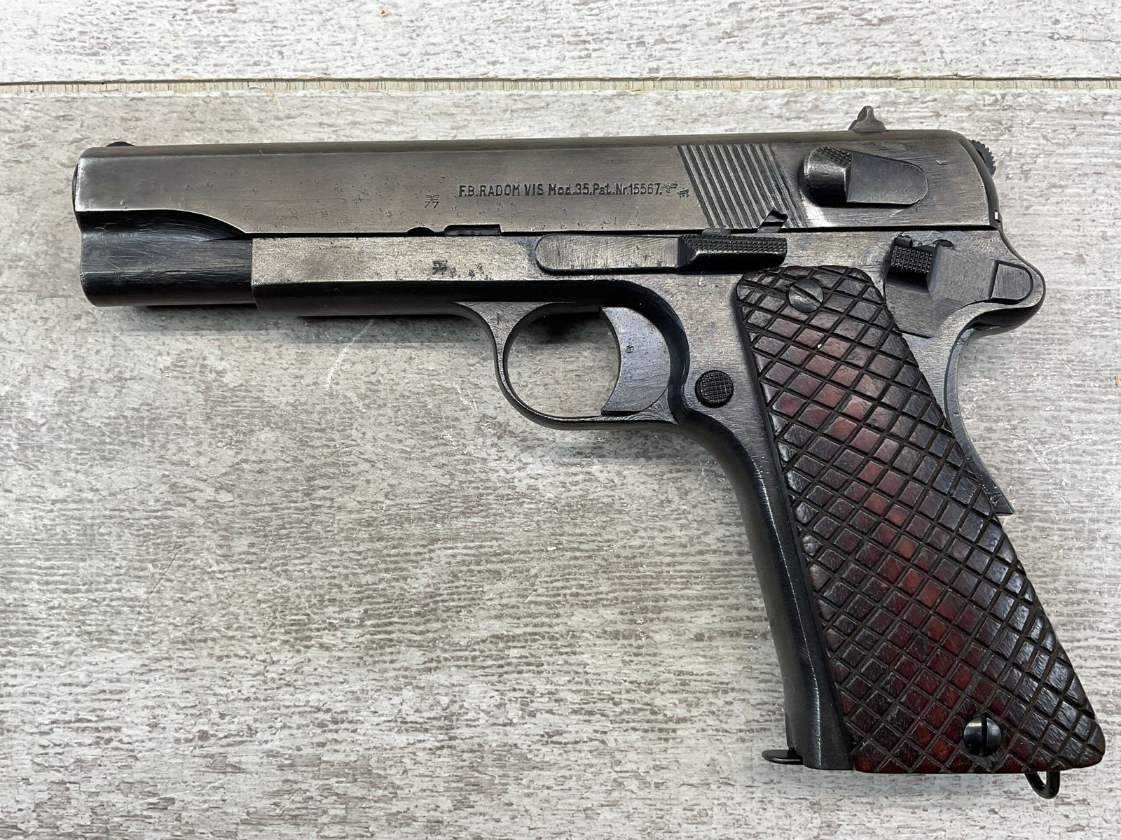 FB RADOM VIS 35 9MM 3 LEVER PISTOL, NAZI MARKED #S3410, 9MM, 90%+ BLUE THINNING & HIGH EDGE WEAR ON FRAME, SLIDE SHOWING BROWN/GREY PATINA, VG BRIGHT BORE & RIFLING, EVERYTHING IS CORRECT & MATCHES , WALNUT GRIPS, “F.B. RADOM VIS MOD. 35. PAT.NR.15567” ON LEFT SIDE OF SLIDE, E/WaA77 PROOF ON SLIDE & LEFT SIDE OF FRAME, E/623 & E/SWAZ ACCEPTANCE STAMPS ON LEFT SIDE OF SLIDE AS WELL, REPRODUCTION MAGAZINE, NO IMPORT MARKS, 80%+ OVERALL
