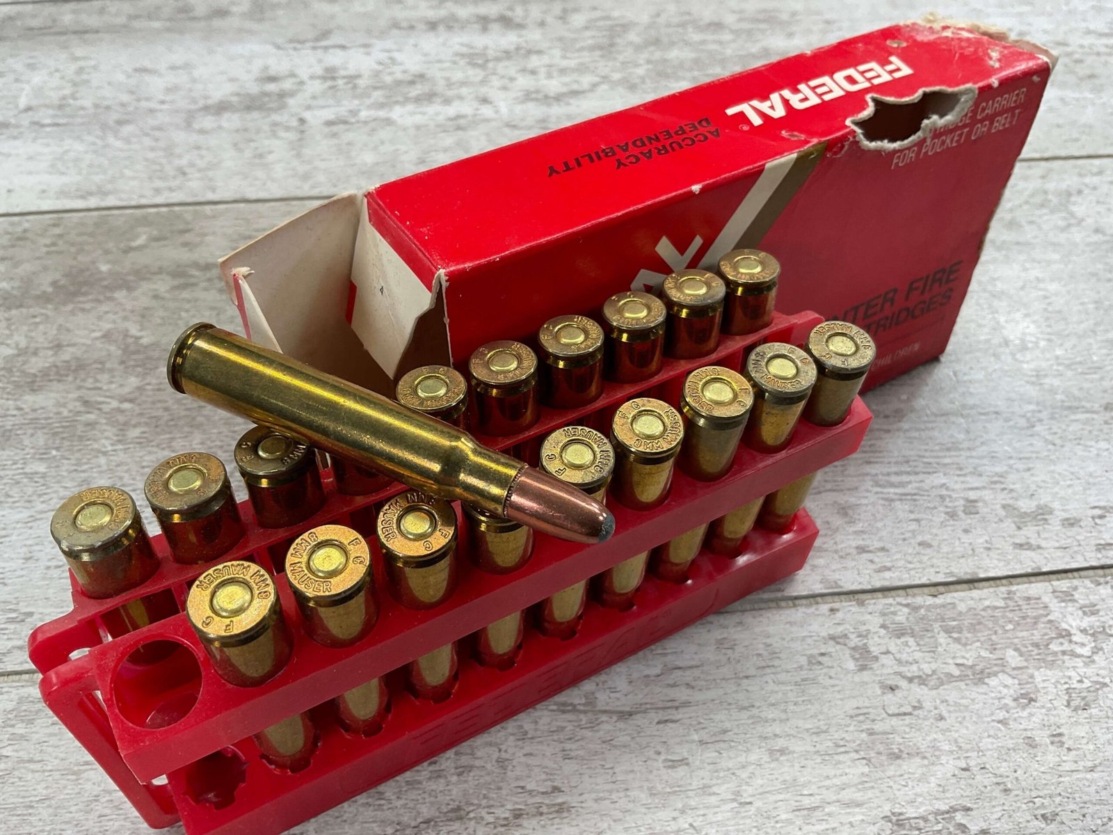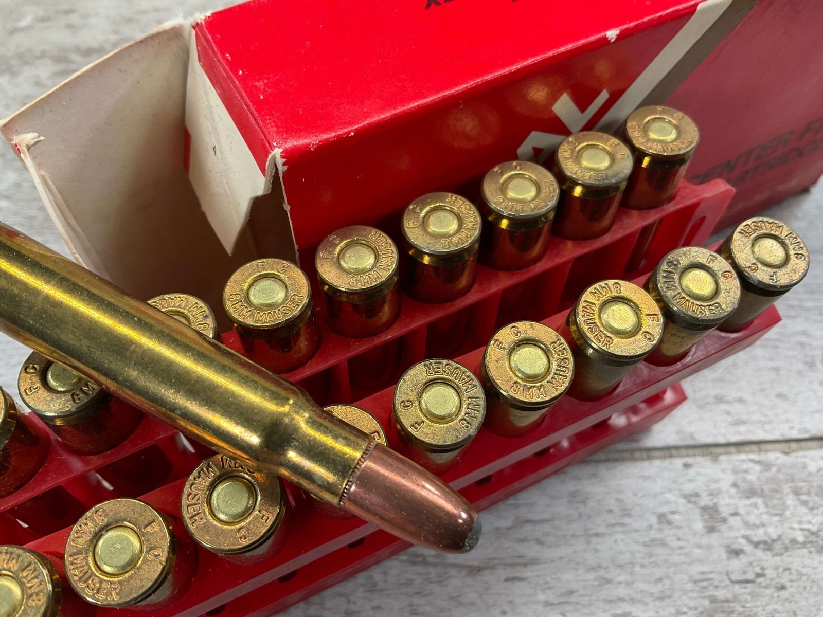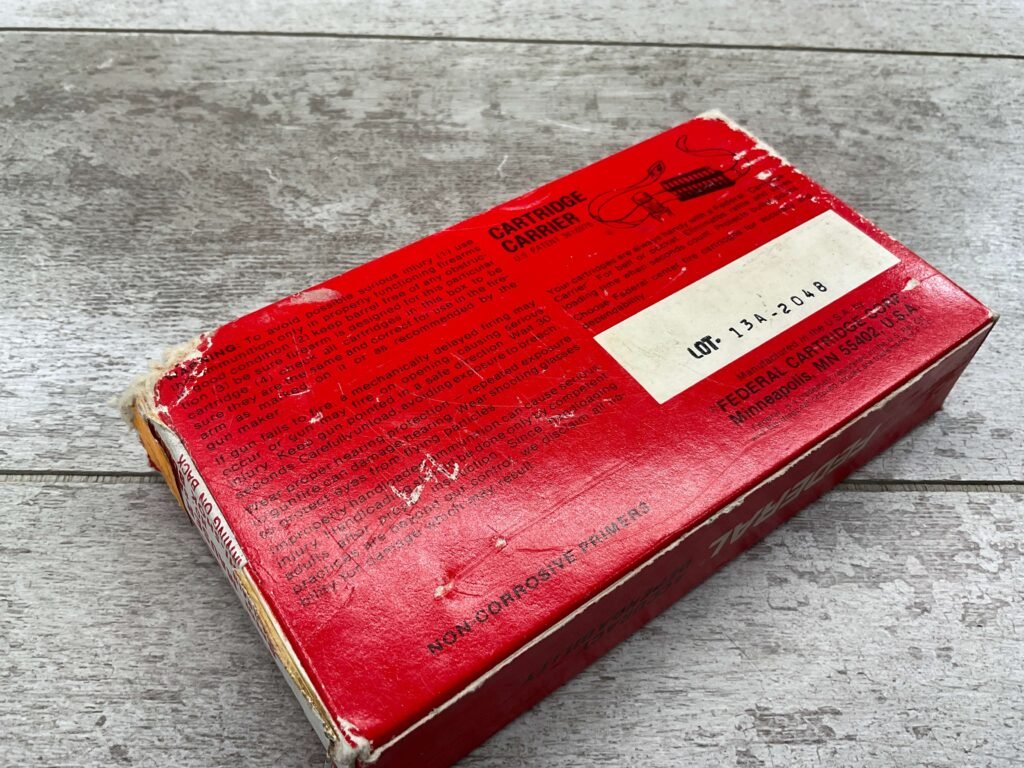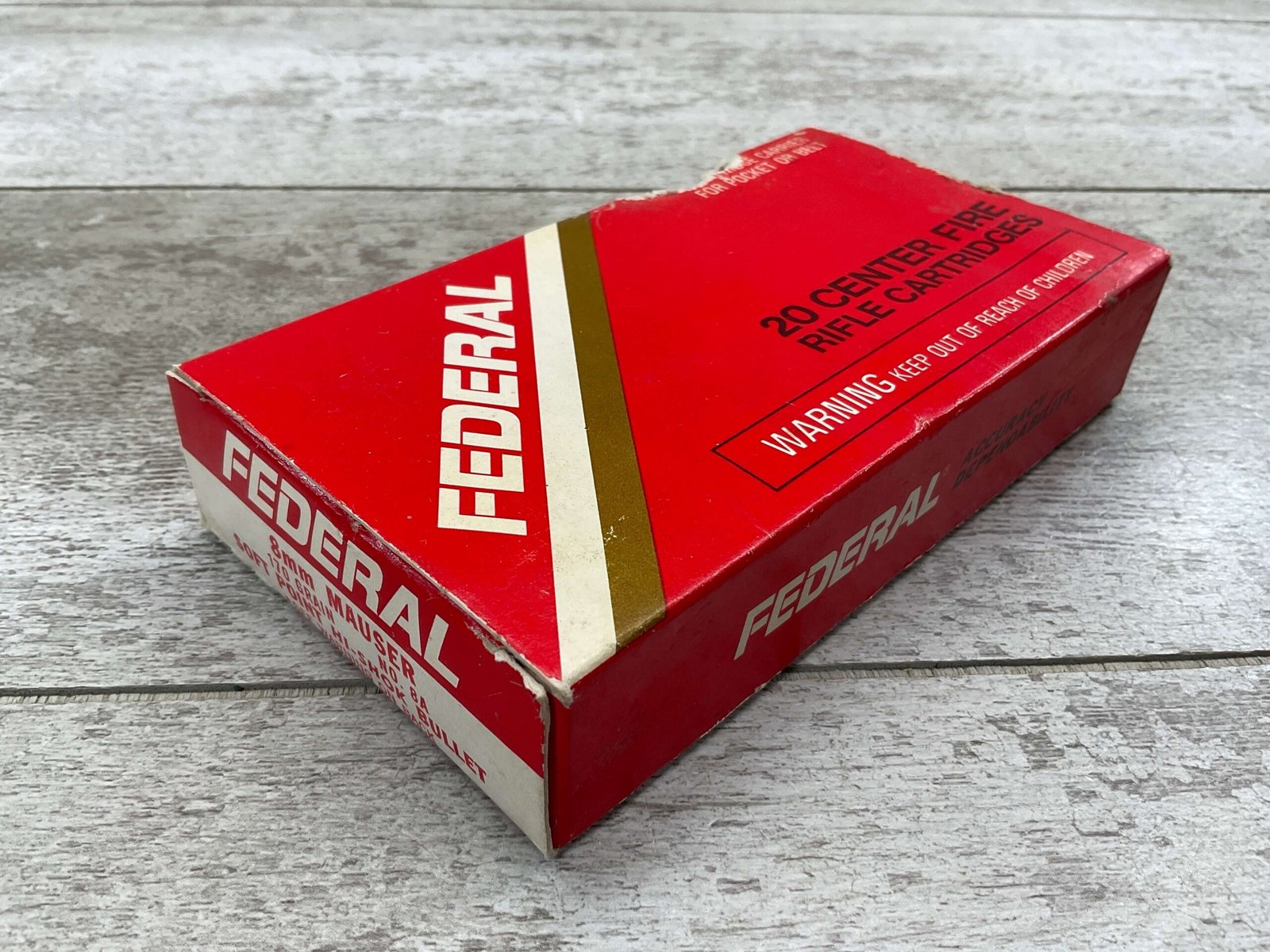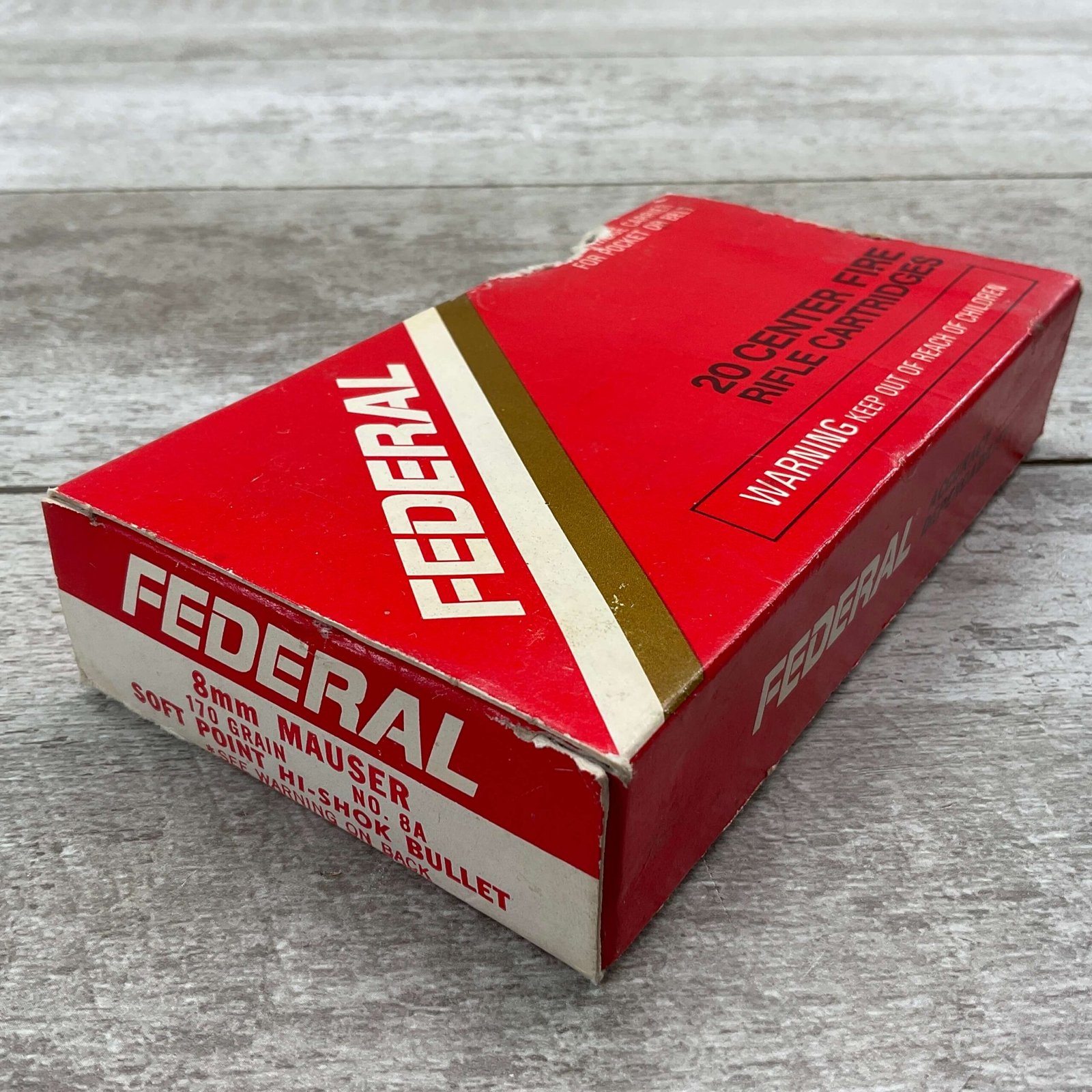 FEDERAL 8MM MAUSER 117 GRN SOFT POINT HI-SHOK BULLET, FULL BOX, THE RED/GOLD & WHITE BOX HAS SOME WEAR MARKS & A TEAR ON THE FACE.