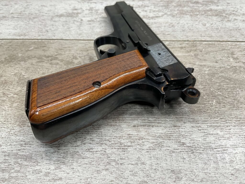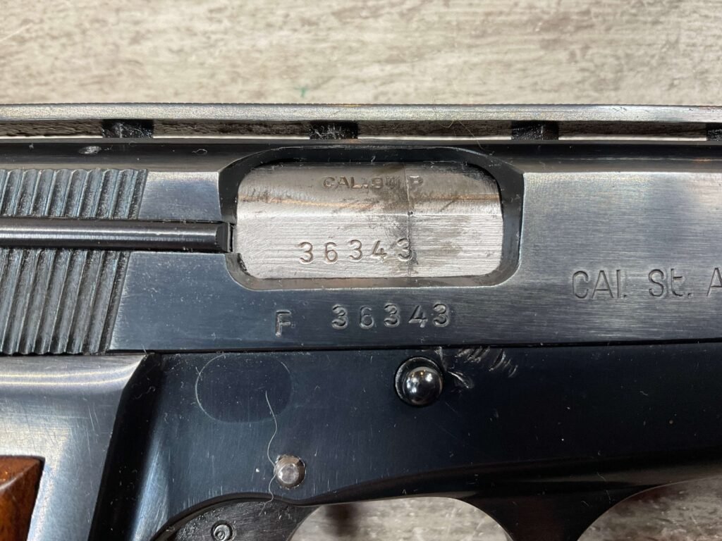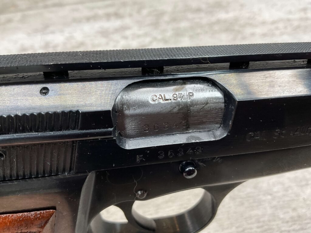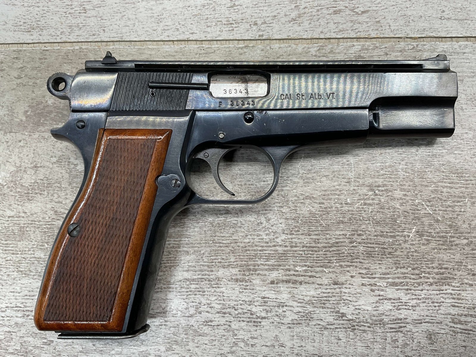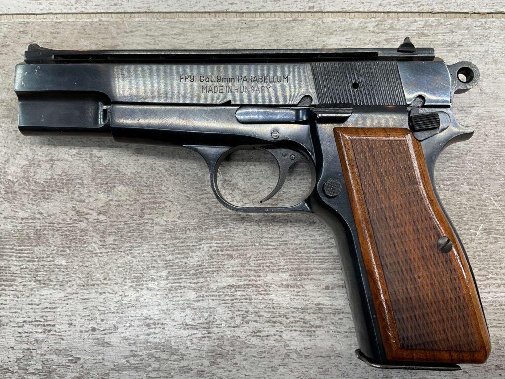 FEG HUNGARIAN MODEL FP9 9MM SEMI AUTO PISTOL #F36343, VER 3, 4.75″ BARREL, BLUED FINISH, FIXED SIGHTS, THUMB SAFETY, EXCELLENT CHECKERED WALNUT GRIPS, 1-13 ROUND MAGAZINE, EXCELLENT BRIGHT BORE & RIFLING, CAI ST. ALB. VT IMPORT ON RIGHT SIDE OF SLIDE, SOME LIGHT HANDLING MARKS FROM USE, 90+% OVERALL