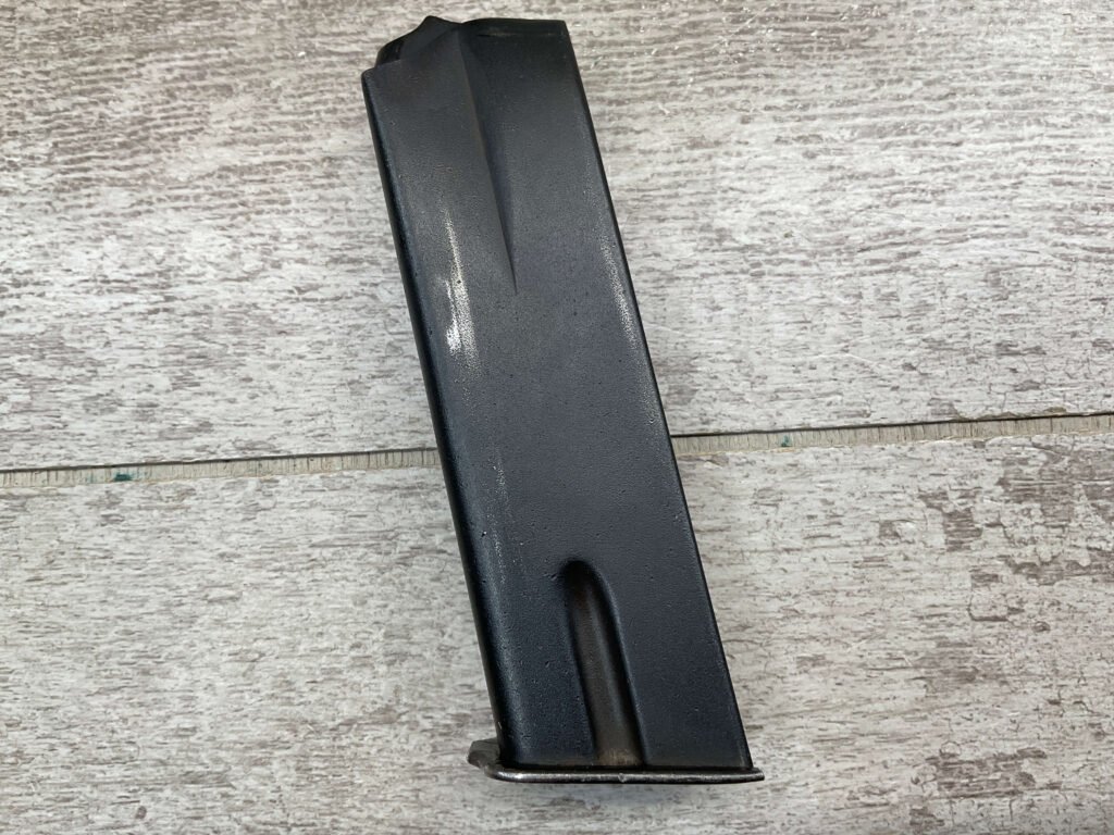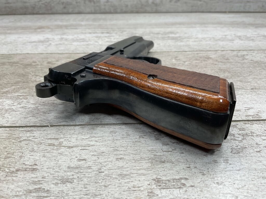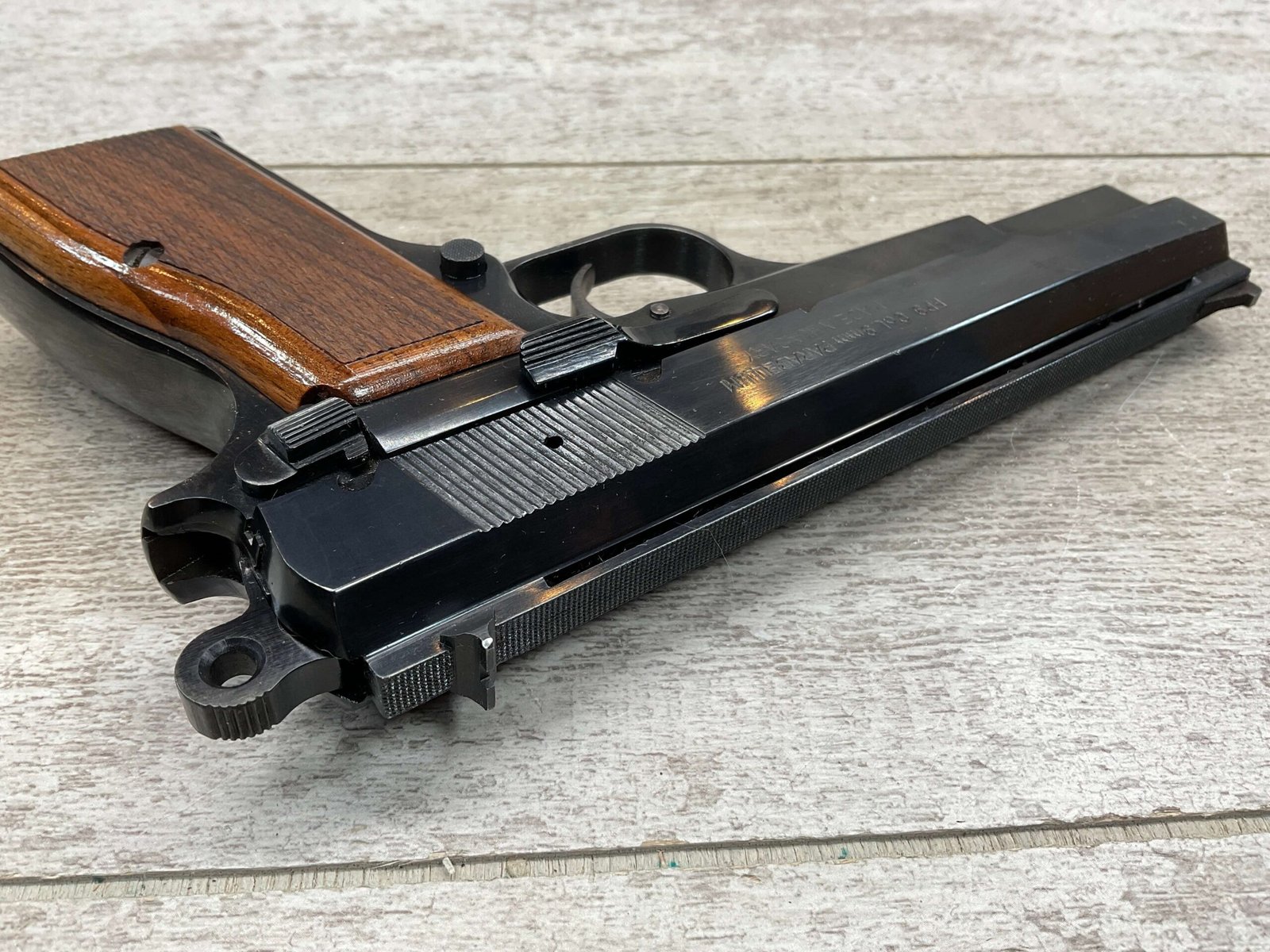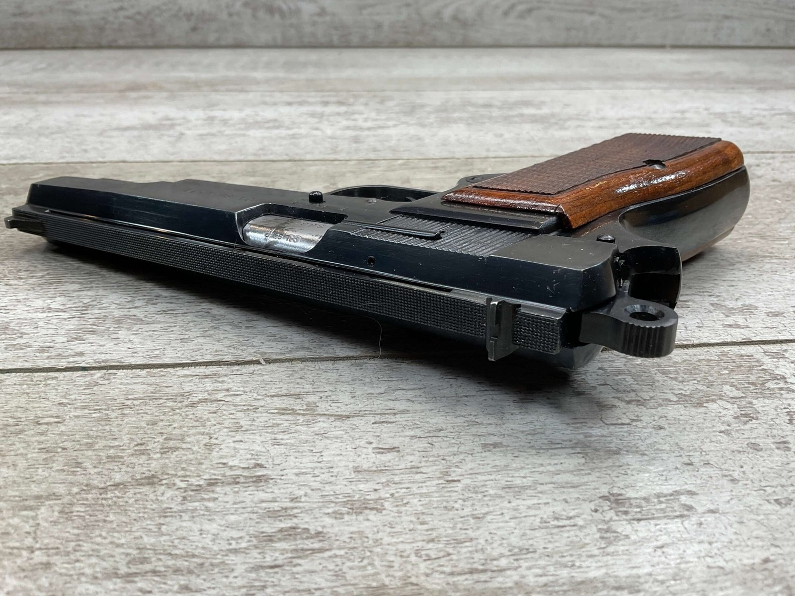 FEG HUNGARIAN MODEL FP9 9MM SEMI AUTO PISTOL #F36343, VER 3, 4.75″ BARREL, BLUED FINISH, FIXED SIGHTS, THUMB SAFETY, EXCELLENT CHECKERED WALNUT GRIPS, 1-13 ROUND MAGAZINE, EXCELLENT BRIGHT BORE & RIFLING, CAI ST. ALB. VT IMPORT ON RIGHT SIDE OF SLIDE, SOME LIGHT HANDLING MARKS FROM USE, 90+% OVERALL