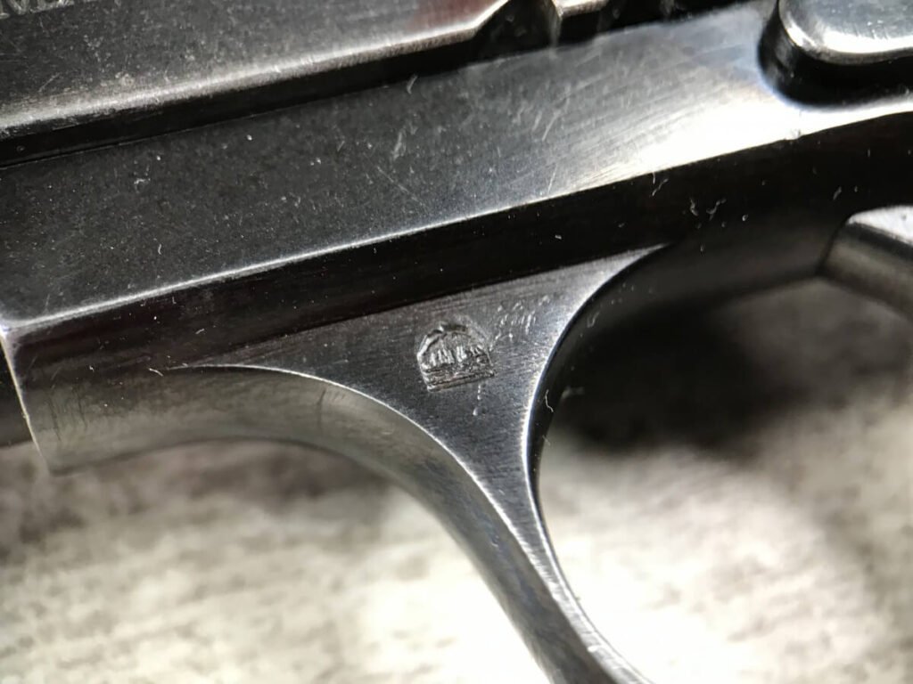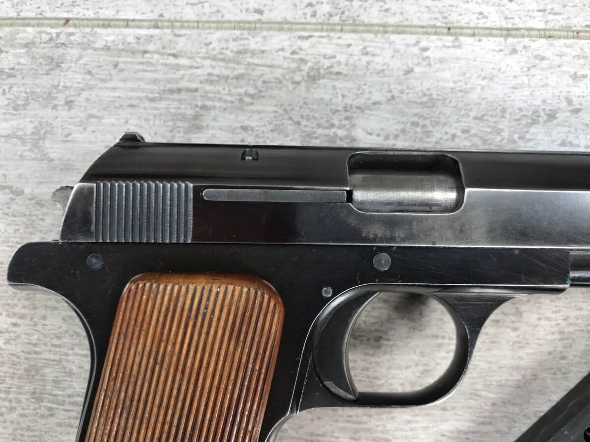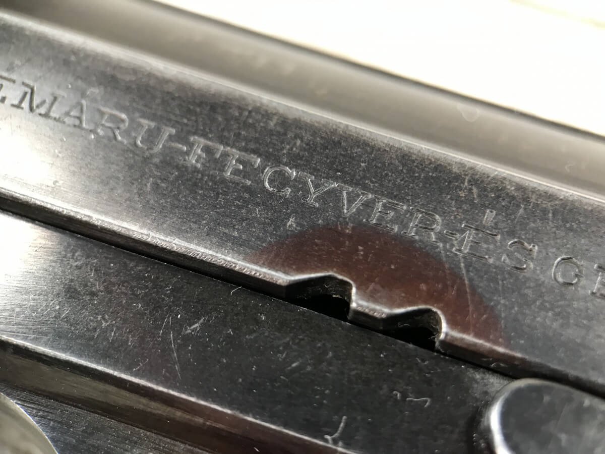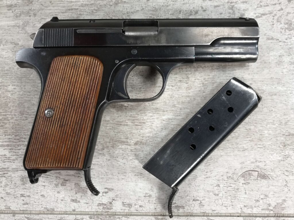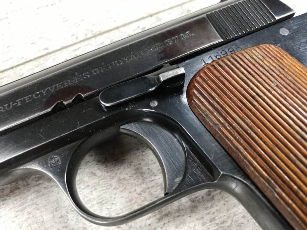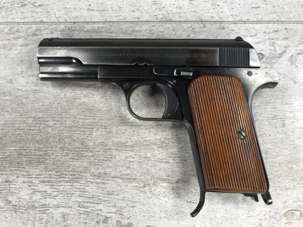 FEMARU 37M 380ACP PISTOL RIG #116995, HUNGARIAN PISTOL, “FEMARU-FECYVER-ES GEPGYAR R.T. 37M” ON LEFT SIDE OF SLIDE, “116995” ABOVE GRIP & HUNGARIAN PROOF ON THE TRIGGER, ORIGINAL 90+% BLUE, EXC GRIPS, 2 ORIGINAL MAGS, CORRECT WARTIME FLAP HOLSTER W/NO MARKINGS & TWO MAG POUCHES, MECHANICALLY EXCELLENT, EXC BRIGHT BORE, 90+% OVERALL