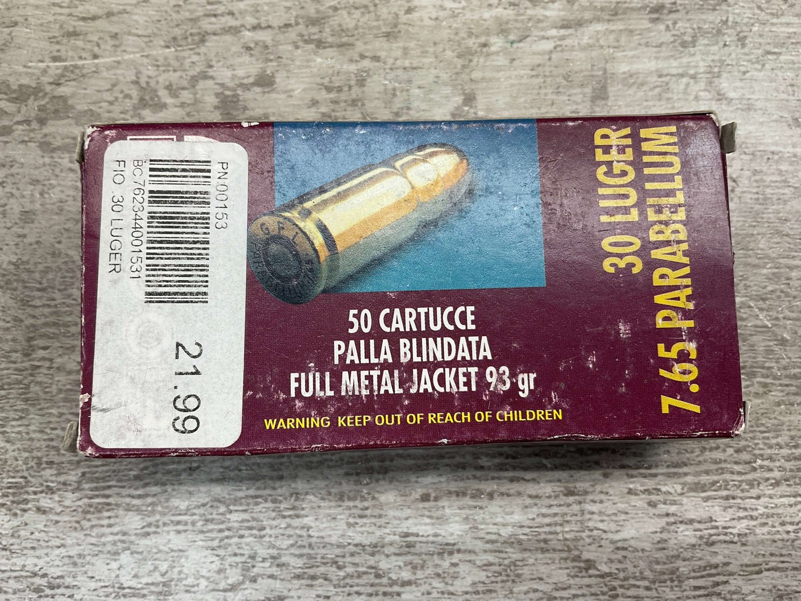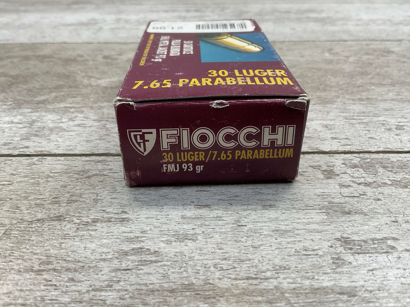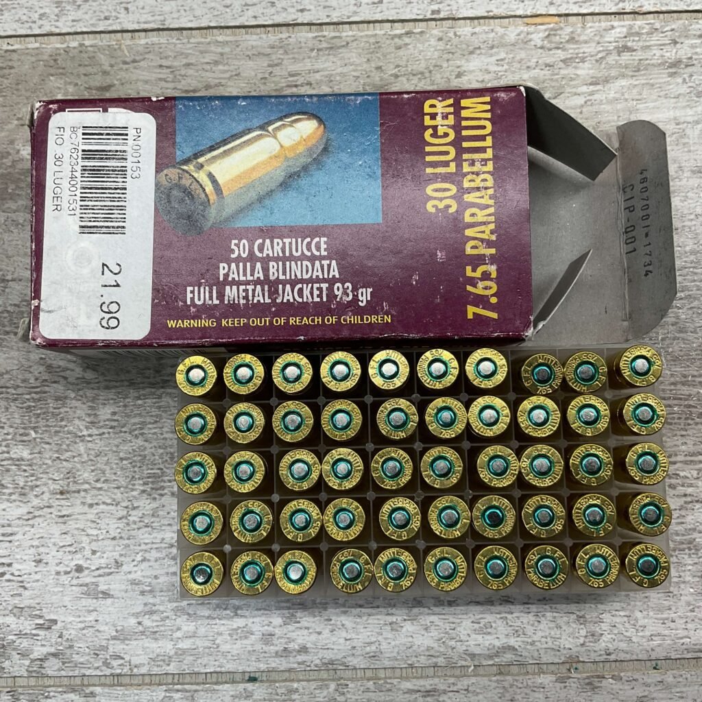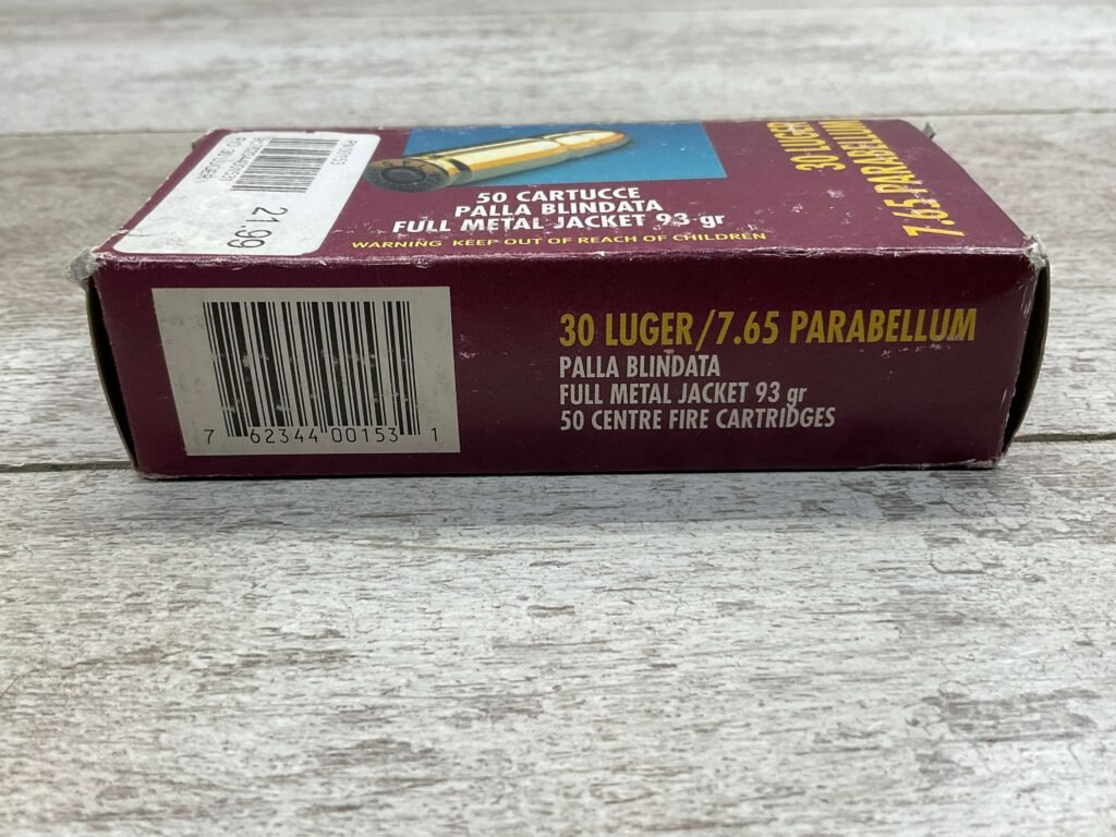 FIOCCHI 30 LUGER/7.65 PARABELLUM AMMO, VINTAGE, FULL BOX, QTY 50, BOX IS IN GOOD SHAPE FOR AGE!