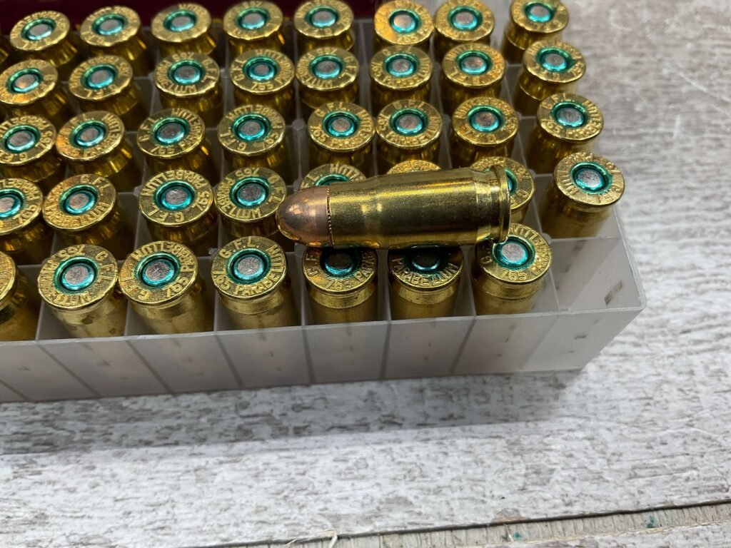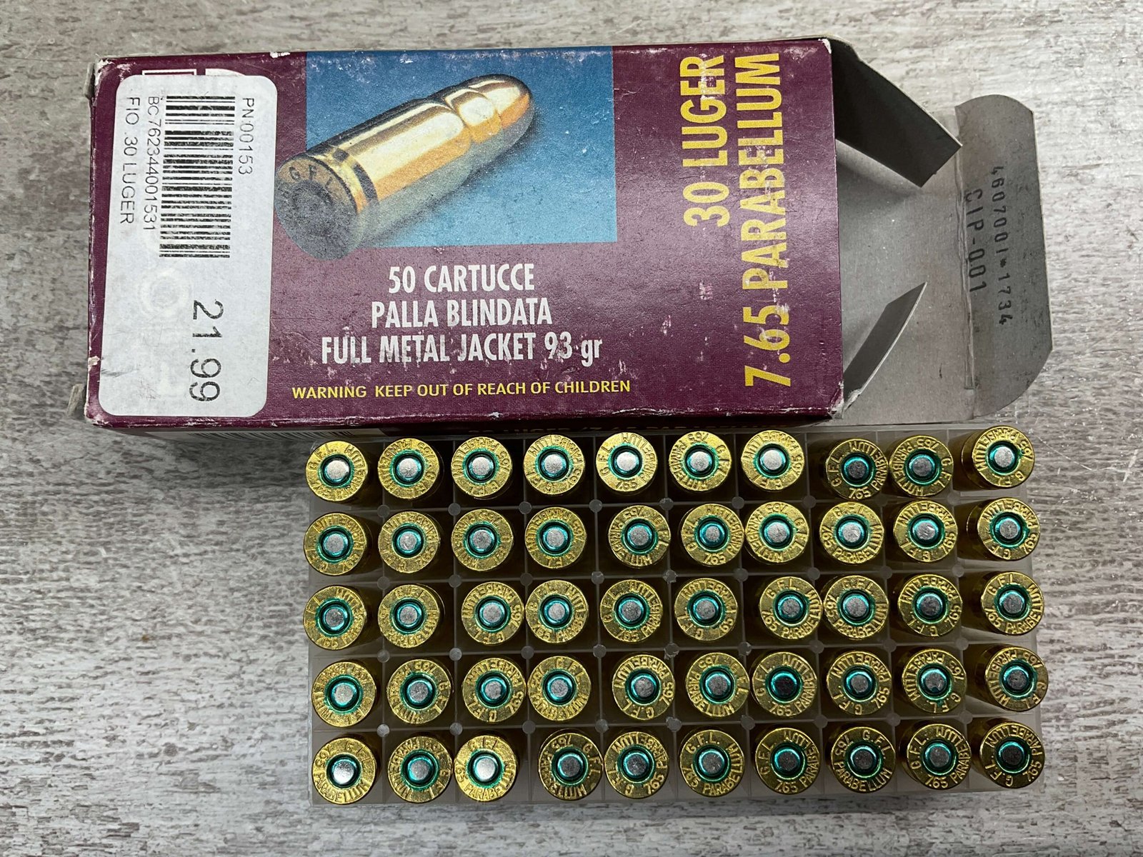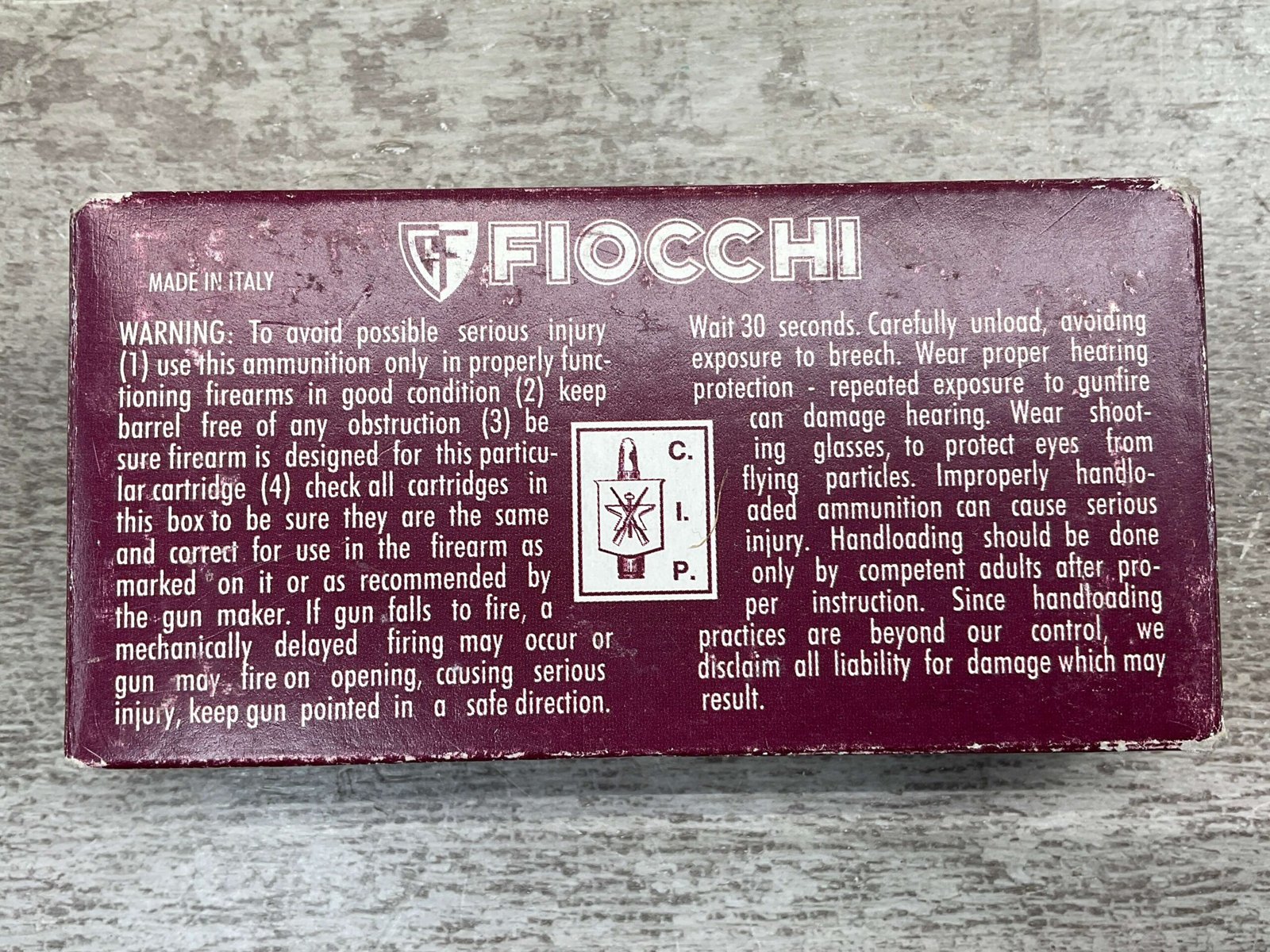 FIOCCHI 30 LUGER/7.65 PARABELLUM AMMO, VINTAGE, FULL BOX, QTY 50, BOX IS IN GOOD SHAPE FOR AGE!