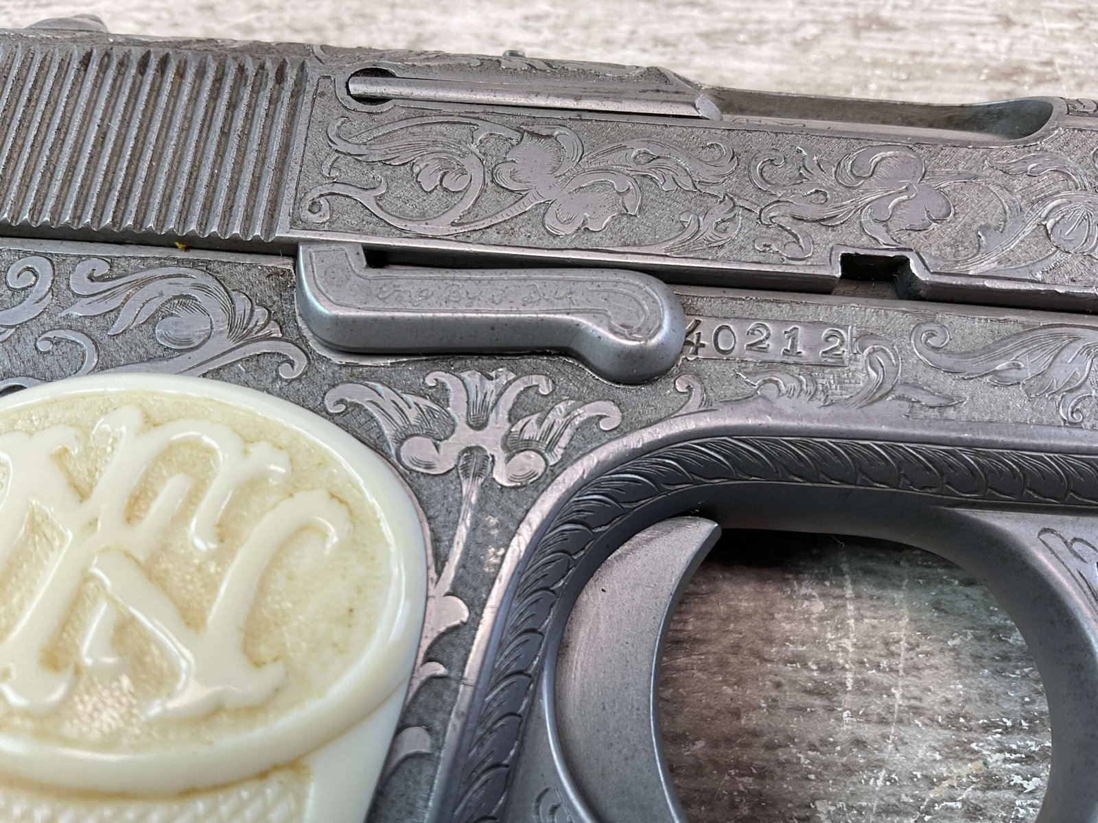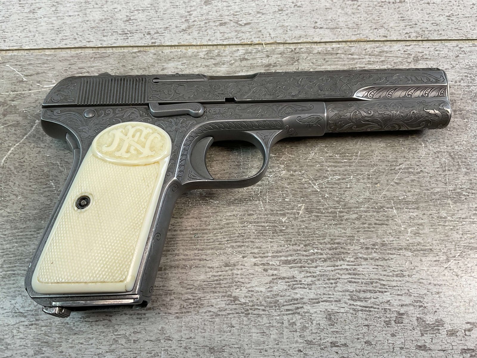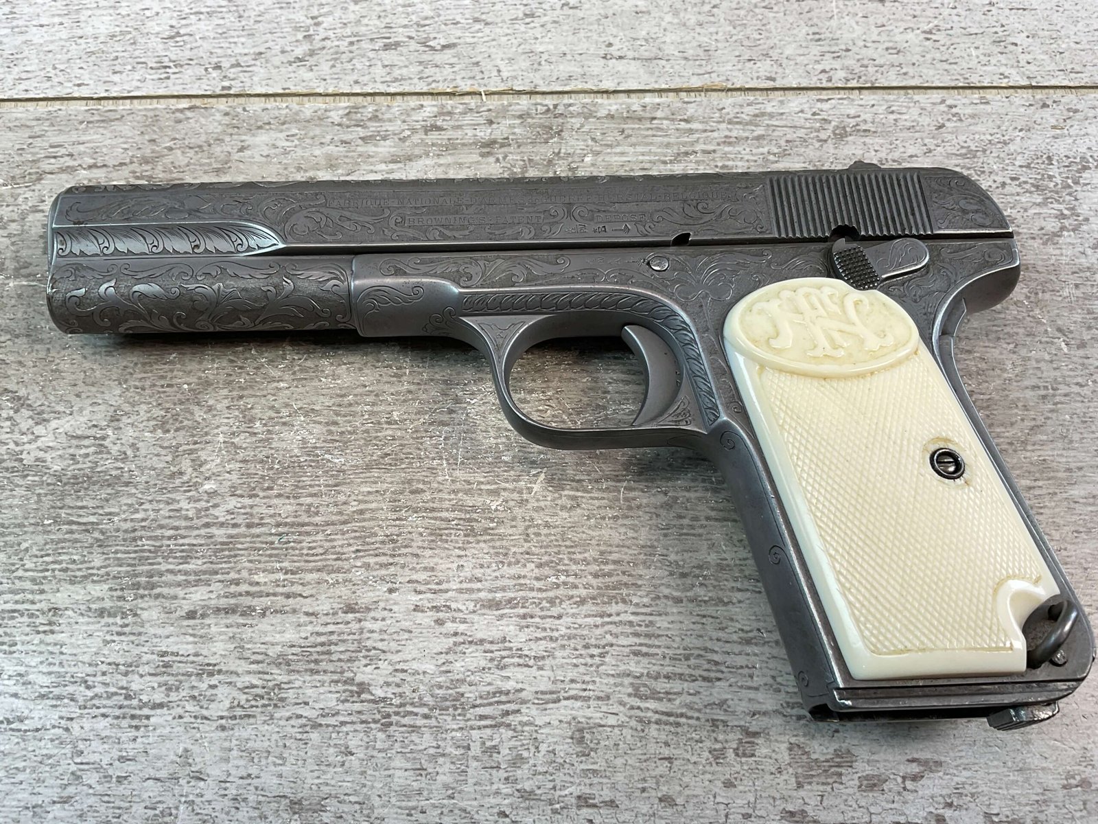FN 1903 ENGRAVED SEMI AUTO PISTOL W/ SHOULDER STOCK, JAMES EARL JONES COLLECTION #40212, 5″ BARREL, 9MM LONG, BEAUTIFULLY ENGRAVED PISTOL & STOCK / HOLSTER, EXTENDED MAGAZINE & CLEANING ROD INCLUDED, STOCK DOES NOT MATCH # (23502), STOCK SLIDES ONTO THE BOTTOM OF THE PISTOL, YOU THEN USE THE LONGER MAGAZINE, BELGIUM PROOFS & BROWNING PATENT, VG IVORY LOOK PLASTIC GRIPS, VG BORE & RIFLING, CONDITION AS SHOWN IN PICTURES, FROM THE JAMES EARL JONES “FAVORITES” COLLECTION W/ CERTIFICATE OF AUTHENTICITY.