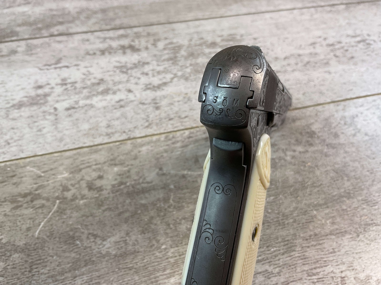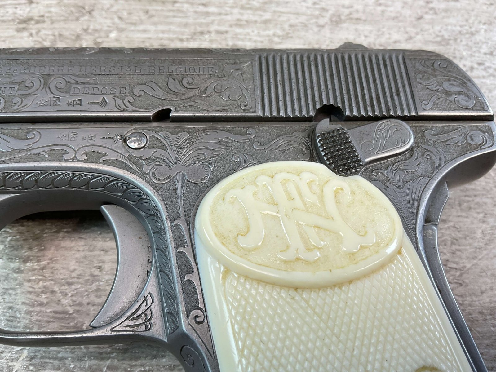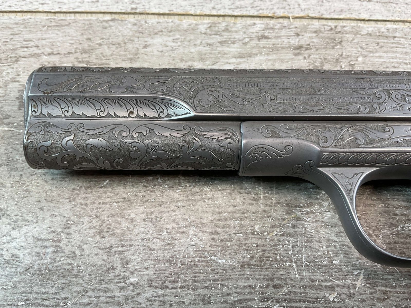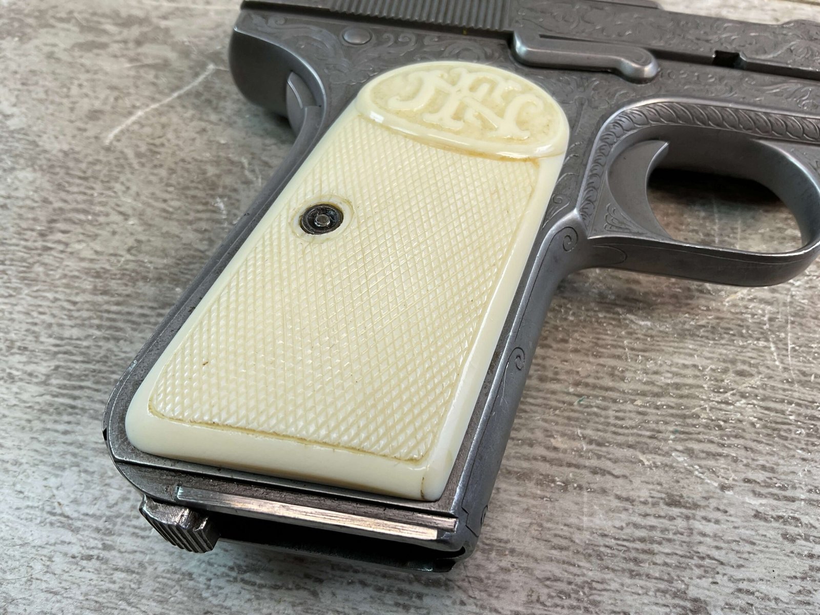FN 1903 ENGRAVED SEMI AUTO PISTOL W/ SHOULDER STOCK, JAMES EARL JONES COLLECTION #40212, 5″ BARREL, 9MM LONG, BEAUTIFULLY ENGRAVED PISTOL & STOCK / HOLSTER, EXTENDED MAGAZINE & CLEANING ROD INCLUDED, STOCK DOES NOT MATCH # (23502), STOCK SLIDES ONTO THE BOTTOM OF THE PISTOL, YOU THEN USE THE LONGER MAGAZINE, BELGIUM PROOFS & BROWNING PATENT, VG IVORY LOOK PLASTIC GRIPS, VG BORE & RIFLING, CONDITION AS SHOWN IN PICTURES, FROM THE JAMES EARL JONES “FAVORITES” COLLECTION W/ CERTIFICATE OF AUTHENTICITY.