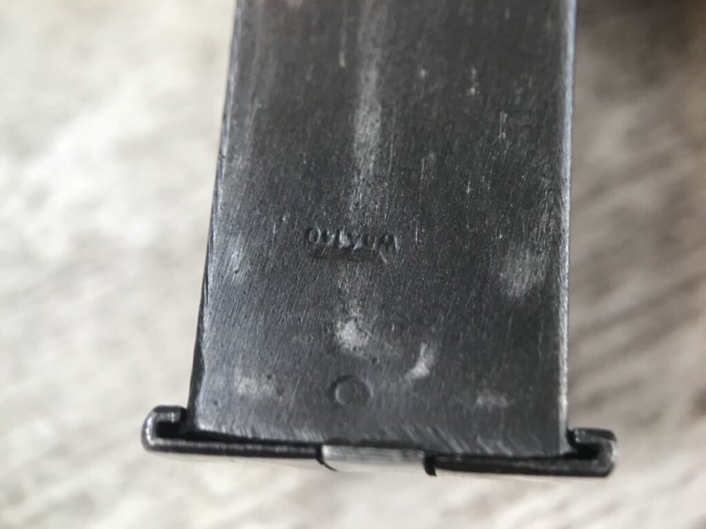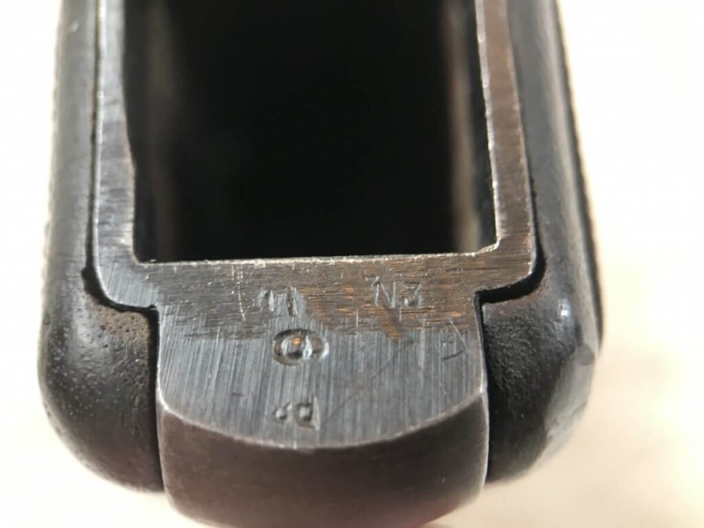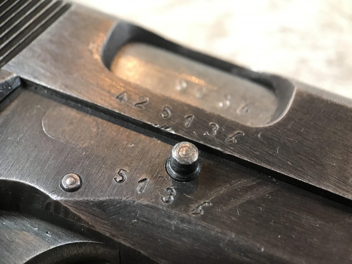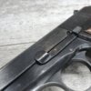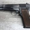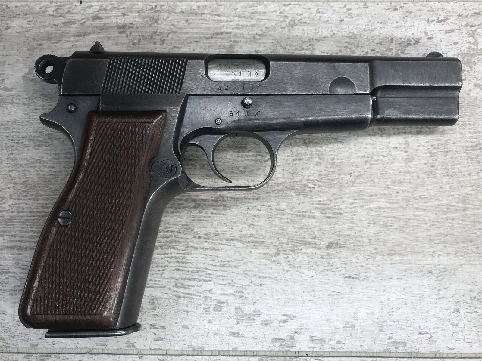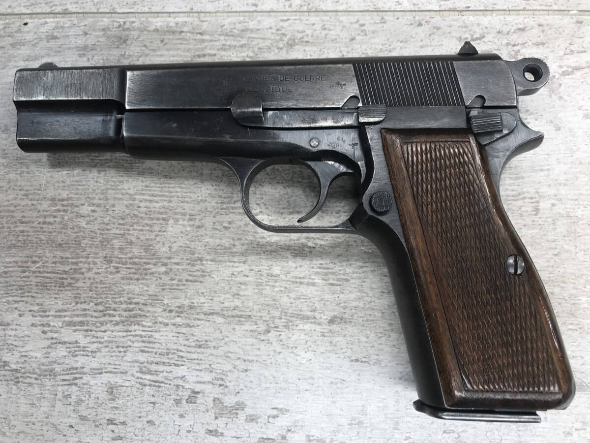FN BROWNING HI-POWER P35 NAZI MARKED 9MM PISTOL #42513b, “b” BLOCK SERIAL NUMBER, WWII, WaA140 & NAZI/EAGLE PROOFS ON FRAME & SLIDE, MAGAZINE IS WaA140 MARKED, BRIGHT BUT FROSTED BORE W/VG RIFLING, ALL MATCHING, EXC MECHANICALLY, EXC ORIGINAL GRIPS, HIGH EDGE WEAR ON SLIDE, FINISH IS 90% TURNING PATINA, SHOULD BE A GREAT SHOOTER! NO IMPORT MARKS, 90+% OVERALL