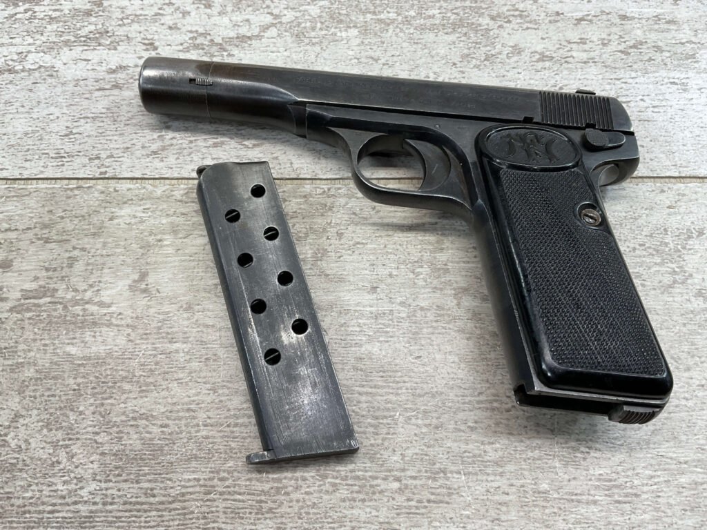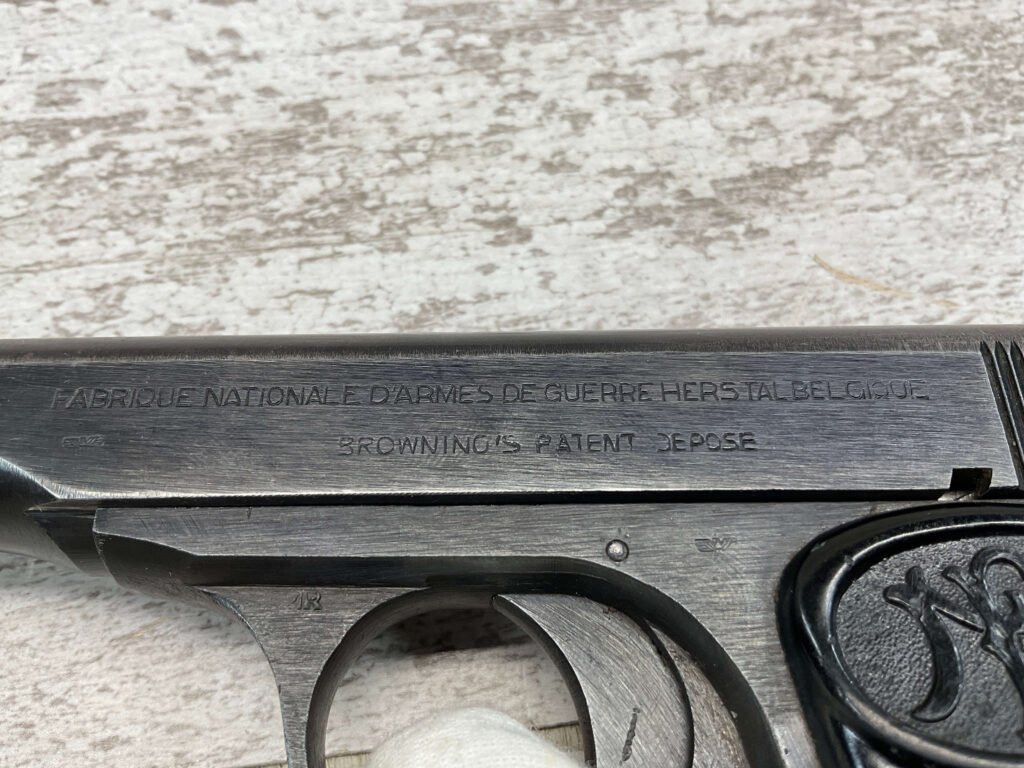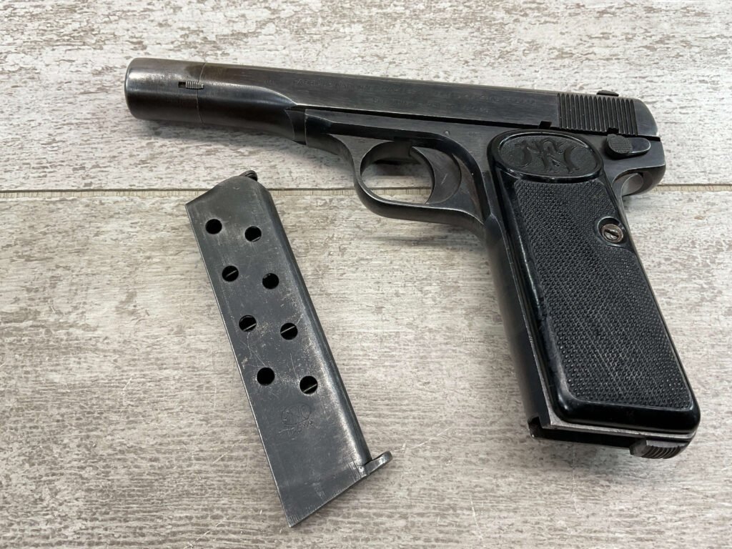 FN BROWNING MODEL 1922 7.65MM PISTOL #88179, EXC MINTY BORE & RIFLING (10/10), VG GRIPS, LEFT SIDE READS “FABRIQUE NATIONALE D’ARMES DE GUERRE HERSTAL BELGIQUE BROWNING’S PATENT DEPOSE”, “MR” STAMPED ON THE TRIGGER, RIGHT SIDE HAS THE “KIND LOGO” FEATURING SHOOTING POLICEMAN (VERY RARE & DOUBLE STAMPED), LIGHT HIGH EDGE WEAR, (2) ORIGINAL FN PHOSPHATE MAGAZINE, ALL MATCHING, GRIP SAFETY, NO IMPORT MARKS, LEATHER HOLSTER IN VG CONDITION 95+% OVERALL RIG