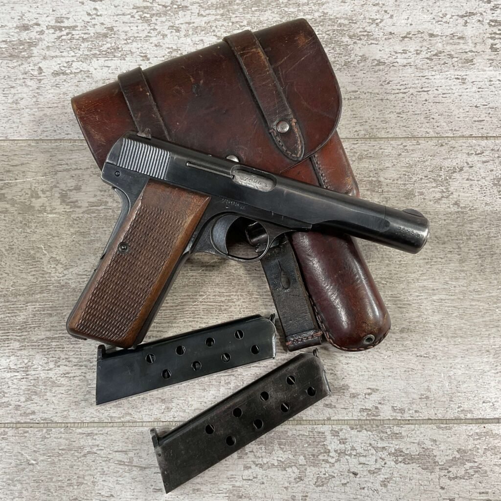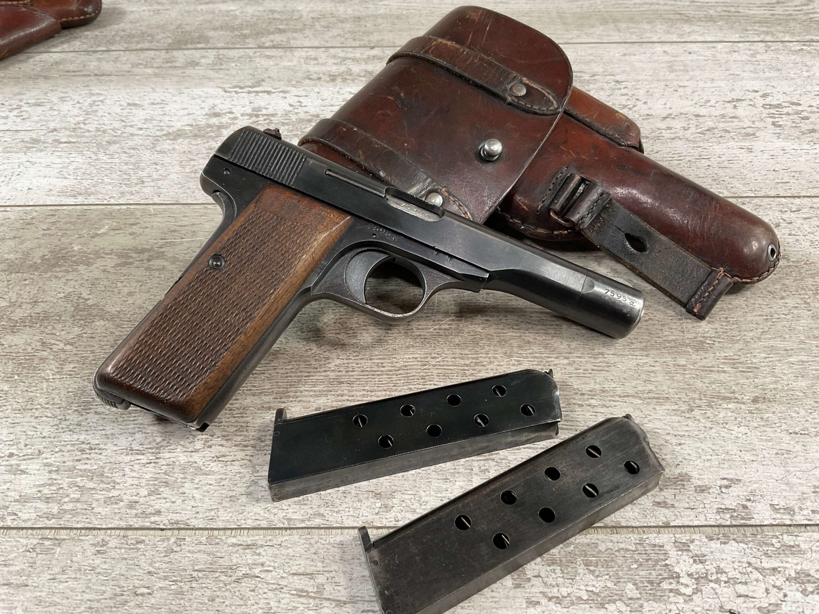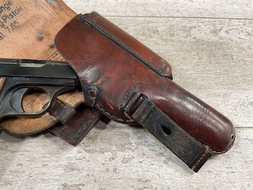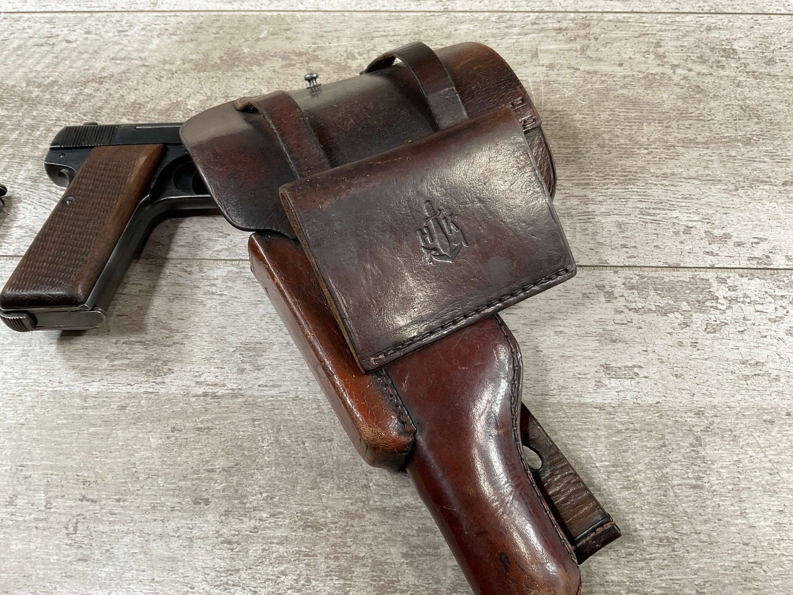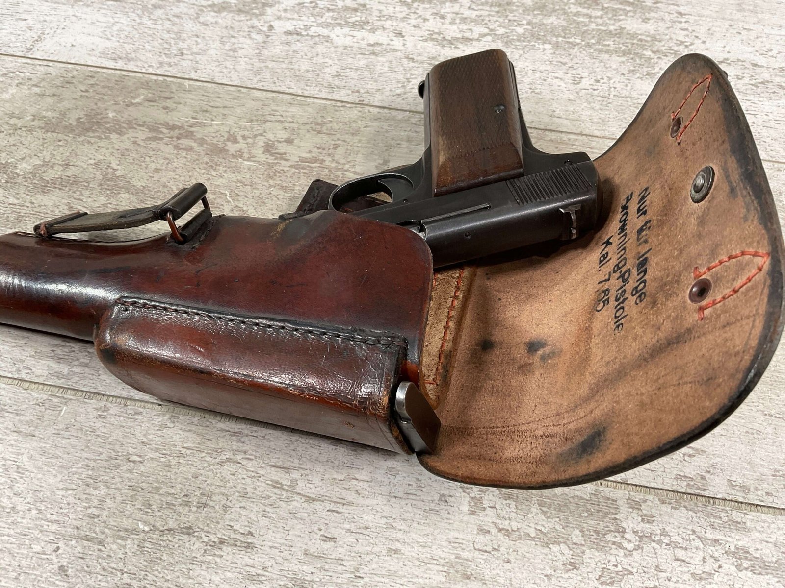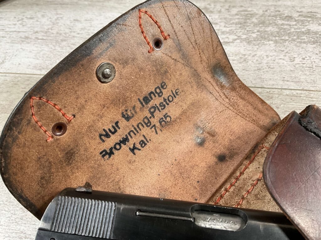 FN BROWNING MODEL 1922 NAZI MARKED .32ACP PISTOL RIG #7595a, 4.5″ BBL, EXC BORE & RIFFLING, GOOD GRIPS W/LIGHT WEAR & HANDLING MARKS, LEFT SIDE READS “FABRIQUE NATIONALE D’ARMES DE GUERRE HERSTAL BELGIQUE/BROWNING’S PATENT DEPOSE”, “MR” STAMPED ON THE TRIGGER, SOME LIGHT HIGH EDGE & HOLSTER WEAR, WaA140 MARKED SLIDE/FRAME/1 MAGAZINE, FN ORIGINAL MAGAZINE, ALL MATCHING, NO IMPORT MARKS, TWO MAGS/ONE WaA140 MARKED THE OTHER NO MARKINGS, BEAUTIFUL HEINRICH KRIEGHOFF DROP BROWN ALL LEATHER HOLSTER WITH EAGLE/2 PROF ON FRONT & “HK ANCHOR” LOGO ON THE BELT LOOP, “NUR FUR LANGE/BROWNING PISTOLE/KAL 7.65” STAMP ON INSIDE FLAP, “95+% OVERALL