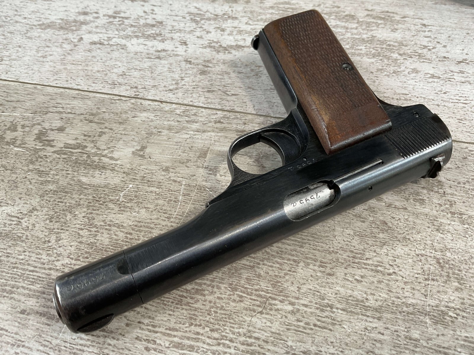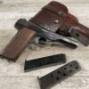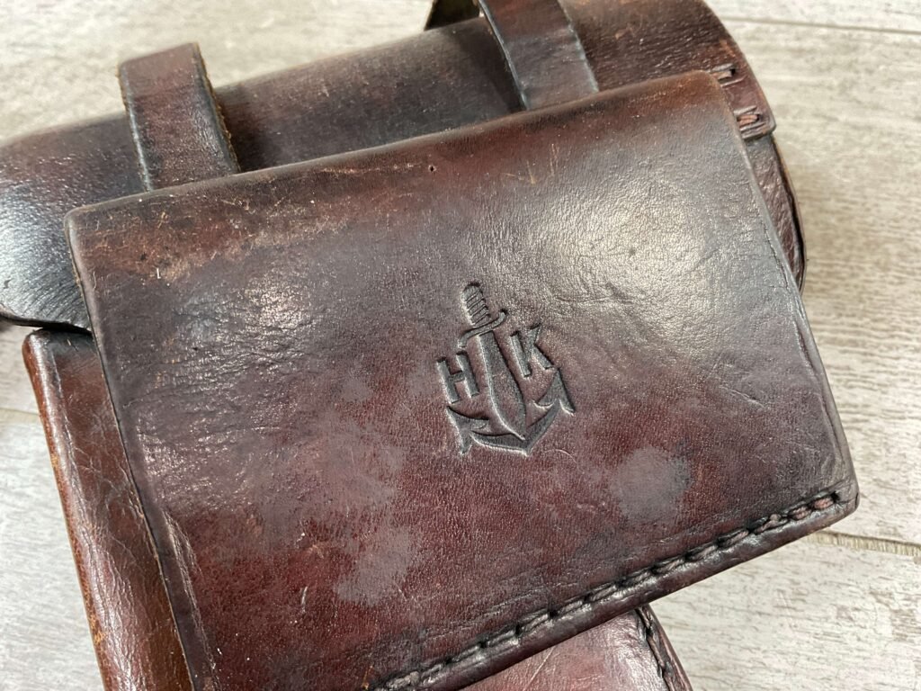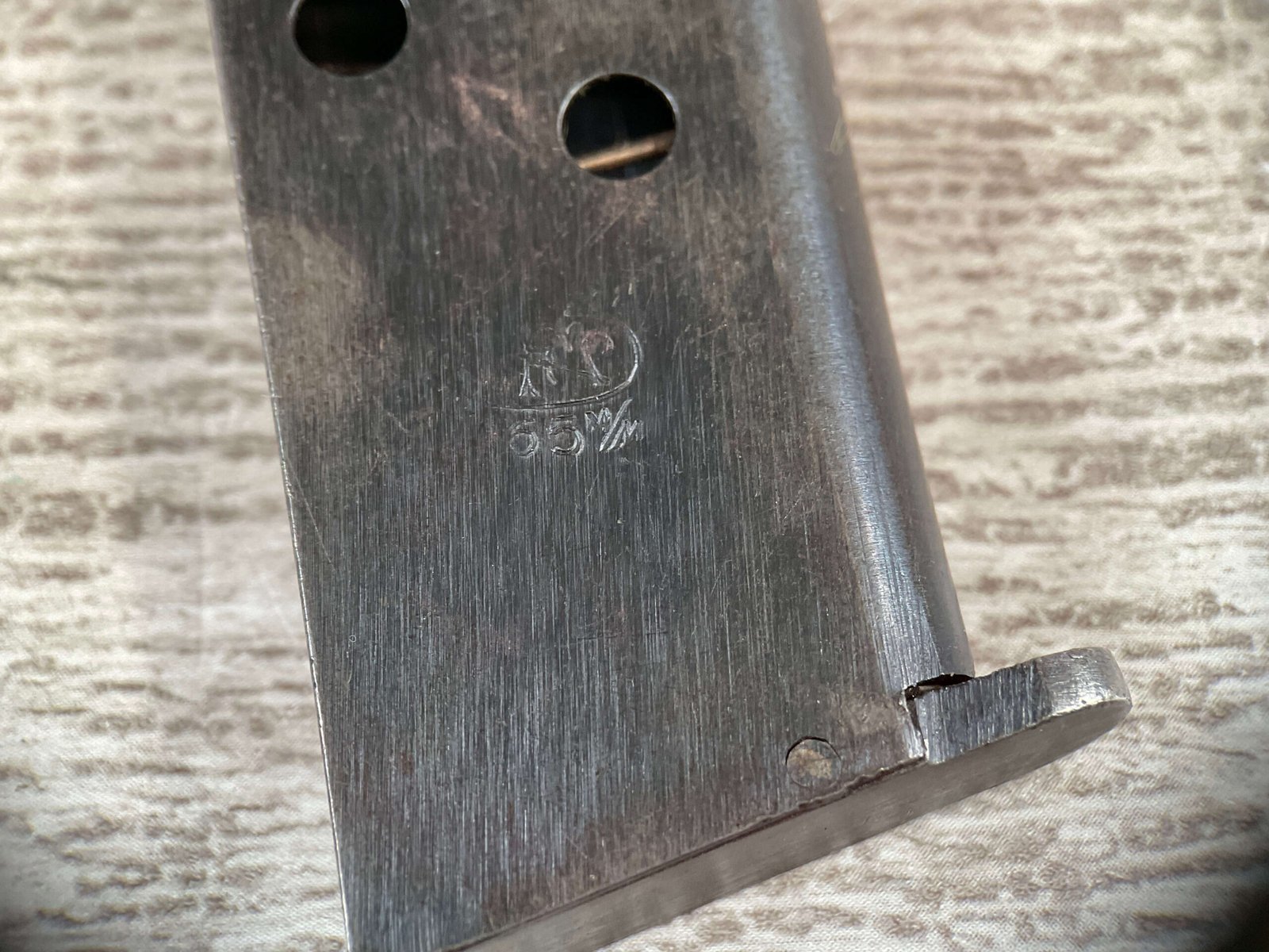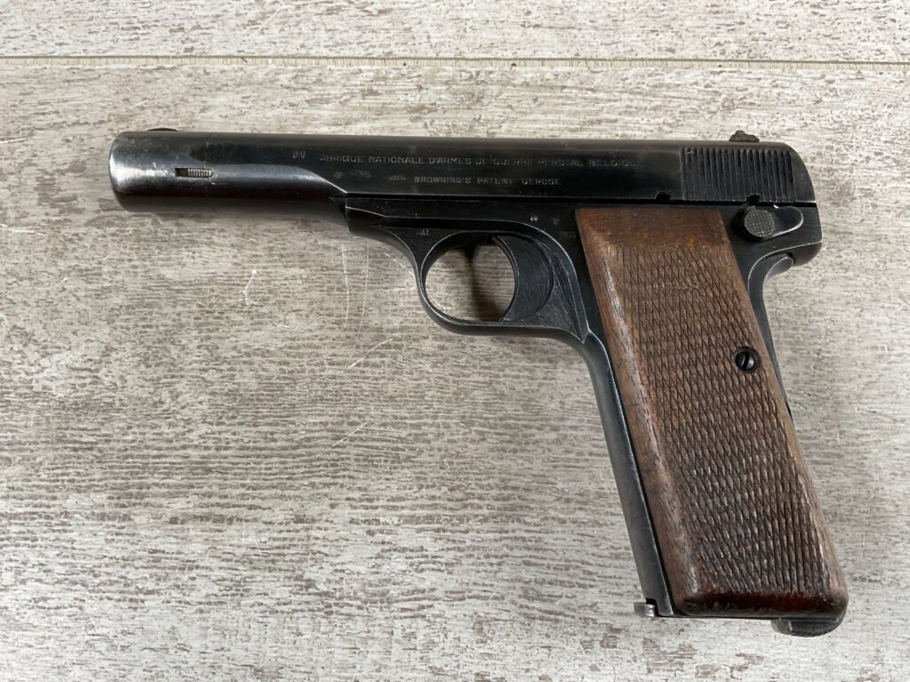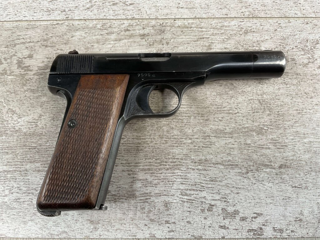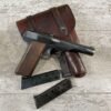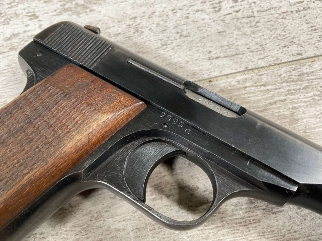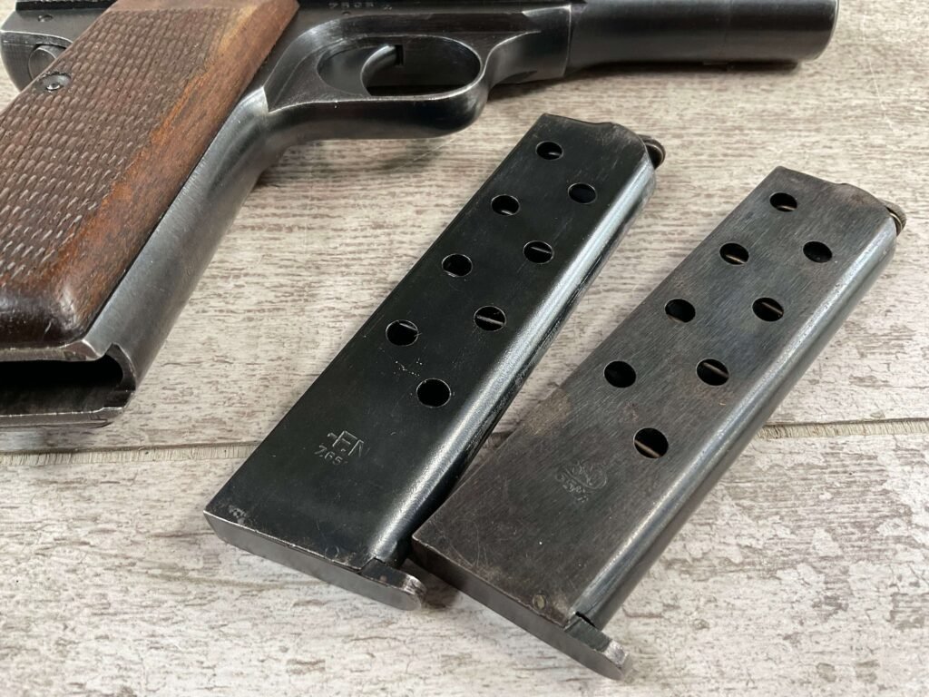 FN BROWNING MODEL 1922 NAZI MARKED .32ACP PISTOL RIG #7595a, 4.5″ BBL, EXC BORE & RIFFLING, GOOD GRIPS W/LIGHT WEAR & HANDLING MARKS, LEFT SIDE READS “FABRIQUE NATIONALE D’ARMES DE GUERRE HERSTAL BELGIQUE/BROWNING’S PATENT DEPOSE”, “MR” STAMPED ON THE TRIGGER, SOME LIGHT HIGH EDGE & HOLSTER WEAR, WaA140 MARKED SLIDE/FRAME/1 MAGAZINE, FN ORIGINAL MAGAZINE, ALL MATCHING, NO IMPORT MARKS, TWO MAGS/ONE WaA140 MARKED THE OTHER NO MARKINGS, BEAUTIFUL HEINRICH KRIEGHOFF DROP BROWN ALL LEATHER HOLSTER WITH EAGLE/2 PROF ON FRONT & “HK ANCHOR” LOGO ON THE BELT LOOP, “NUR FUR LANGE/BROWNING PISTOLE/KAL 7.65” STAMP ON INSIDE FLAP, “95+% OVERALL