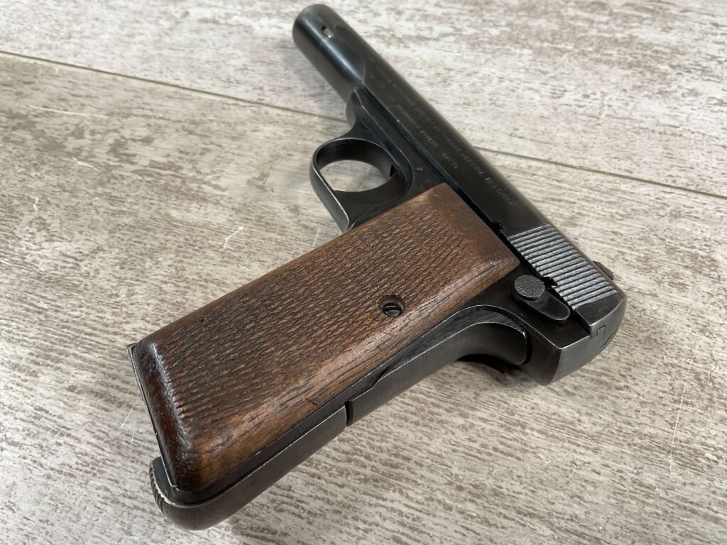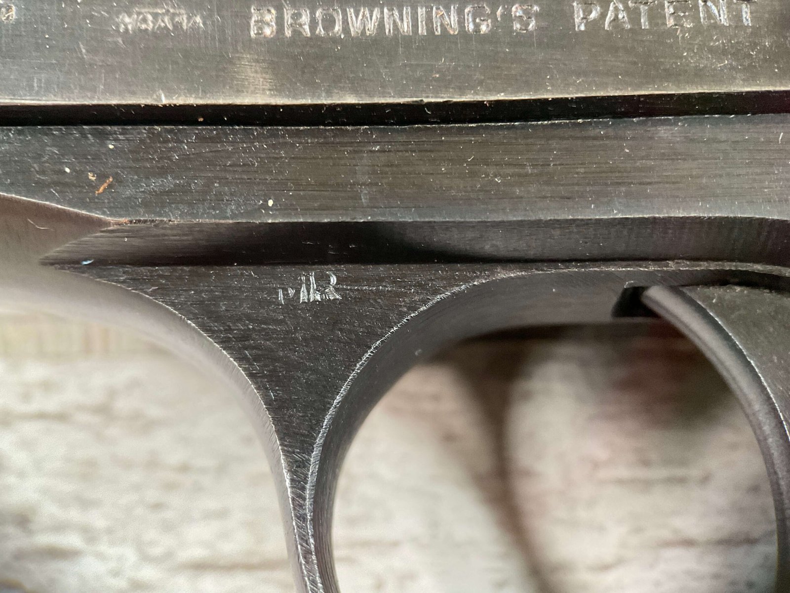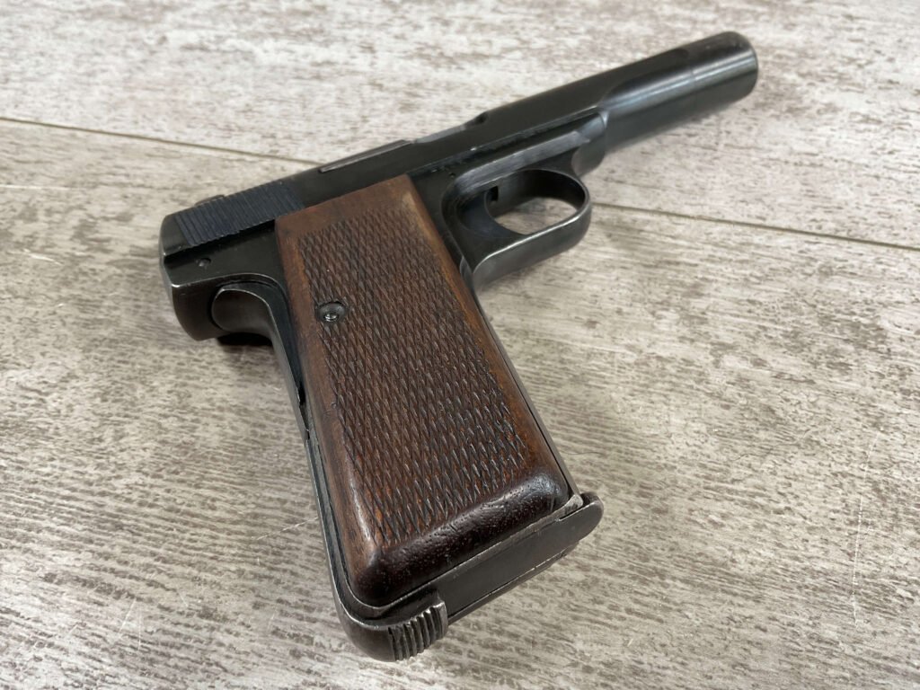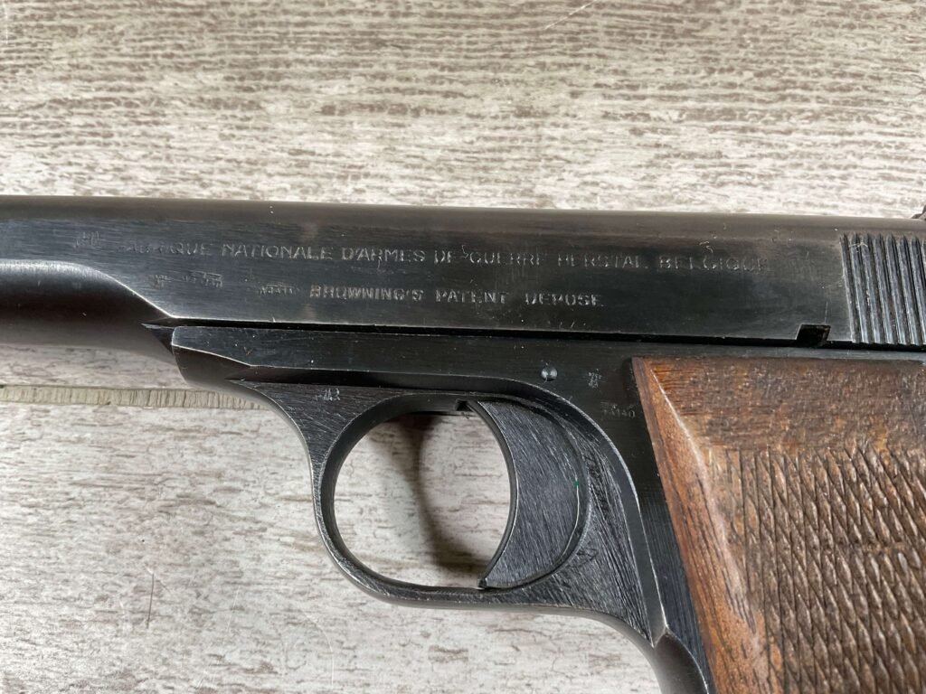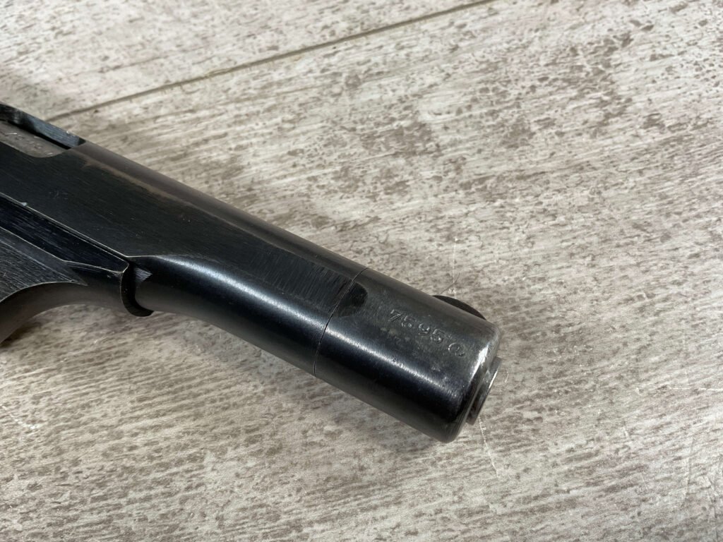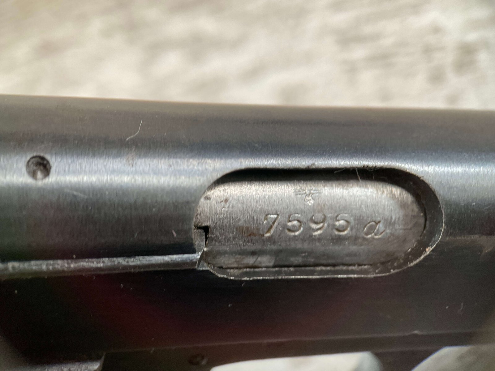 FN BROWNING MODEL 1922 NAZI MARKED .32ACP PISTOL RIG #7595a, 4.5″ BBL, EXC BORE & RIFFLING, GOOD GRIPS W/LIGHT WEAR & HANDLING MARKS, LEFT SIDE READS “FABRIQUE NATIONALE D’ARMES DE GUERRE HERSTAL BELGIQUE/BROWNING’S PATENT DEPOSE”, “MR” STAMPED ON THE TRIGGER, SOME LIGHT HIGH EDGE & HOLSTER WEAR, WaA140 MARKED SLIDE/FRAME/1 MAGAZINE, FN ORIGINAL MAGAZINE, ALL MATCHING, NO IMPORT MARKS, TWO MAGS/ONE WaA140 MARKED THE OTHER NO MARKINGS, BEAUTIFUL HEINRICH KRIEGHOFF DROP BROWN ALL LEATHER HOLSTER WITH EAGLE/2 PROF ON FRONT & “HK ANCHOR” LOGO ON THE BELT LOOP, “NUR FUR LANGE/BROWNING PISTOLE/KAL 7.65” STAMP ON INSIDE FLAP, “95+% OVERALL