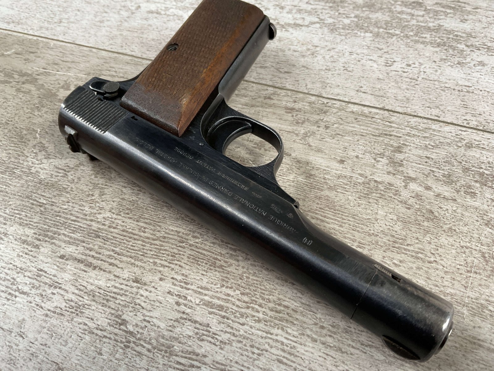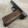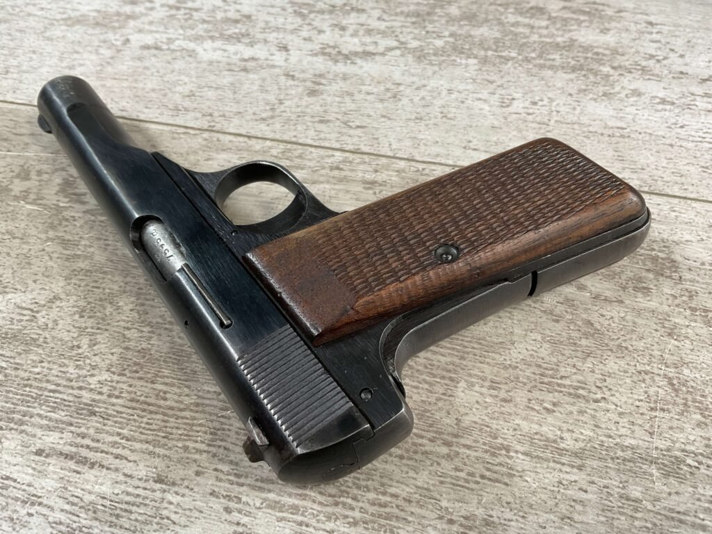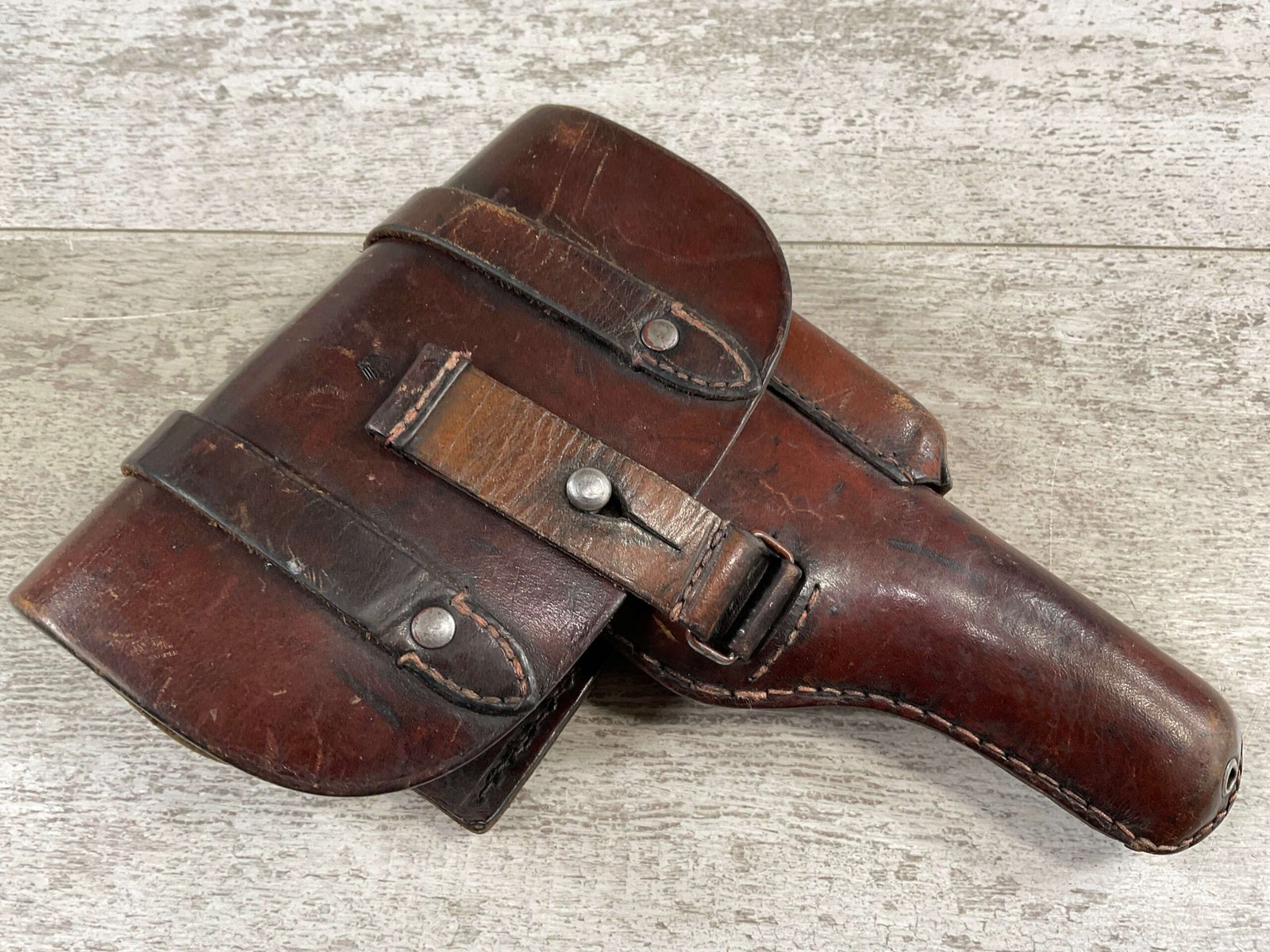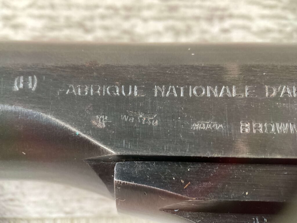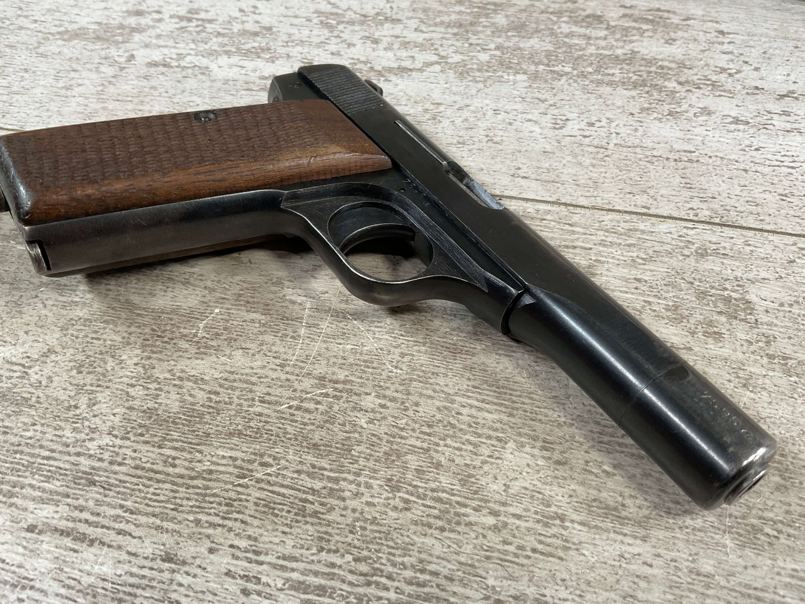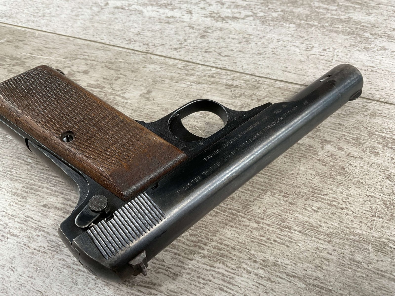 FN BROWNING MODEL 1922 NAZI MARKED .32ACP PISTOL RIG #7595a, 4.5″ BBL, EXC BORE & RIFFLING, GOOD GRIPS W/LIGHT WEAR & HANDLING MARKS, LEFT SIDE READS “FABRIQUE NATIONALE D’ARMES DE GUERRE HERSTAL BELGIQUE/BROWNING’S PATENT DEPOSE”, “MR” STAMPED ON THE TRIGGER, SOME LIGHT HIGH EDGE & HOLSTER WEAR, WaA140 MARKED SLIDE/FRAME/1 MAGAZINE, FN ORIGINAL MAGAZINE, ALL MATCHING, NO IMPORT MARKS, TWO MAGS/ONE WaA140 MARKED THE OTHER NO MARKINGS, BEAUTIFUL HEINRICH KRIEGHOFF DROP BROWN ALL LEATHER HOLSTER WITH EAGLE/2 PROF ON FRONT & “HK ANCHOR” LOGO ON THE BELT LOOP, “NUR FUR LANGE/BROWNING PISTOLE/KAL 7.65” STAMP ON INSIDE FLAP, “95+% OVERALL