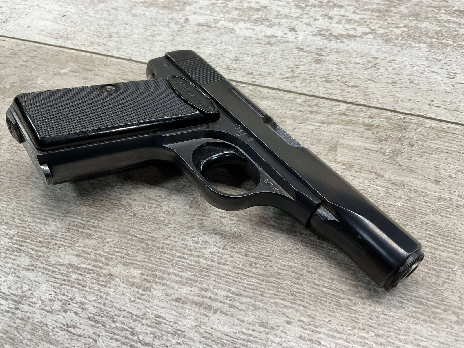 The walnut or plastic grips, depending on the model, contribute to the pistol’s comfortable handling and add a touch of classic elegance. The attention to detail extends to the markings, engravings, and roll stamps, which are often sharp and well-preserved on a minty example, further enhancing the pistol’s overall visual appeal.