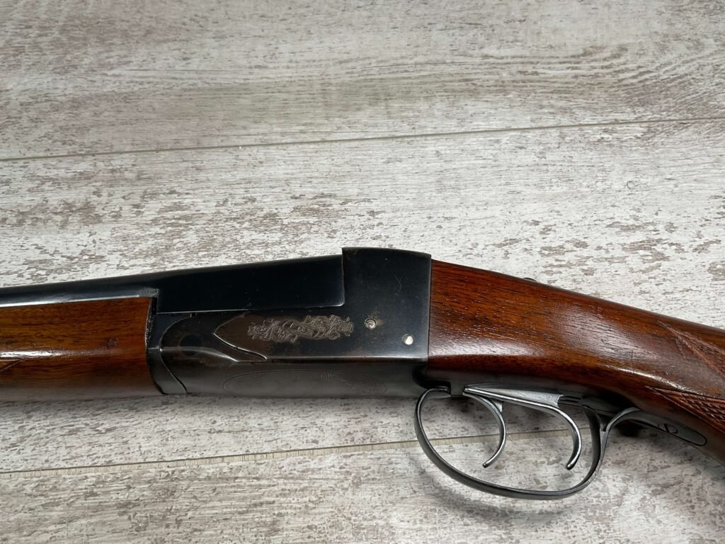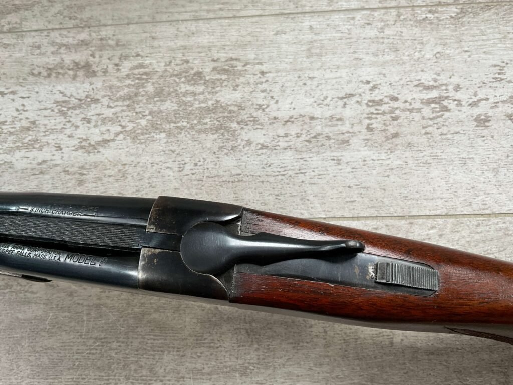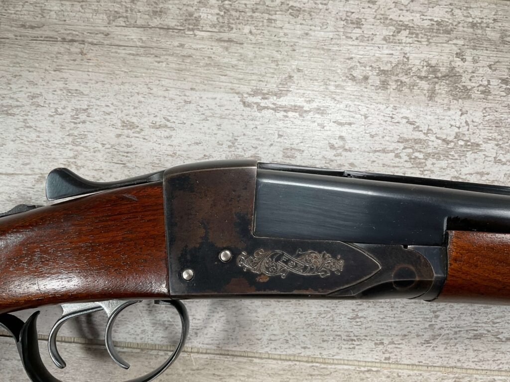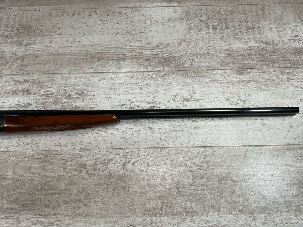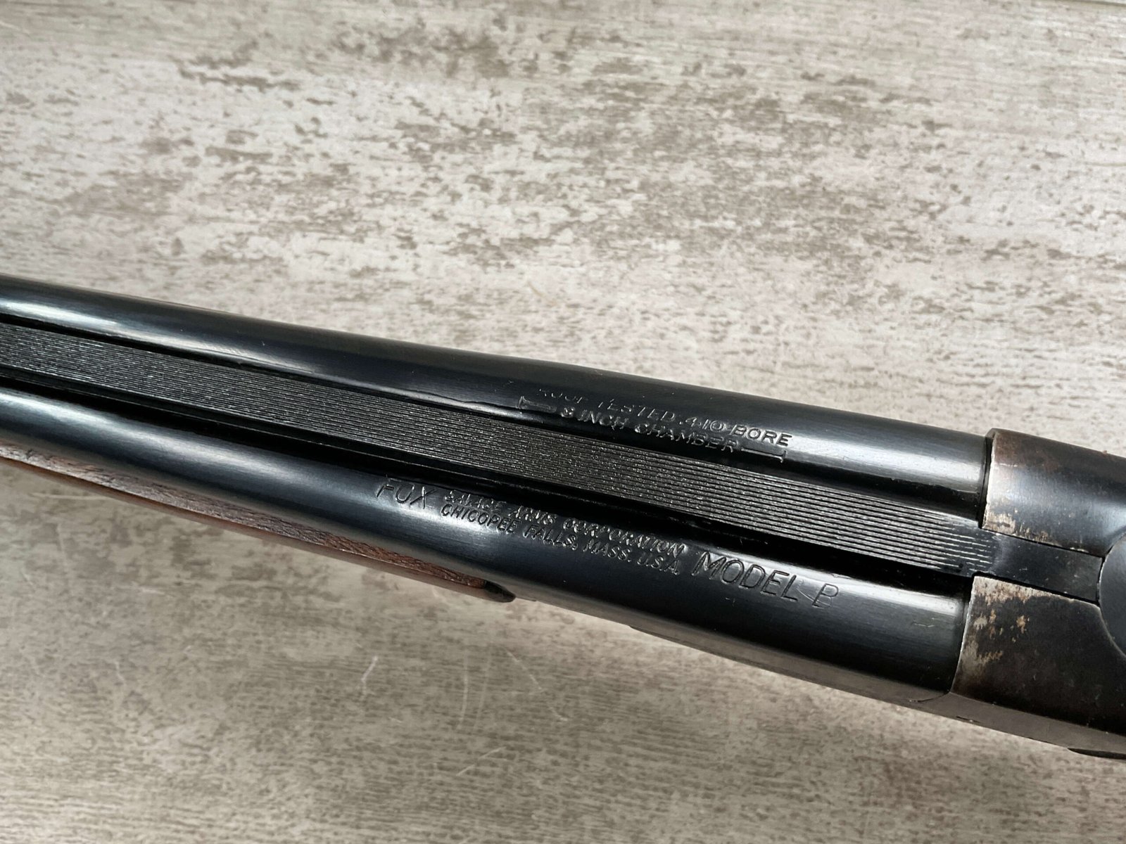 FOX (SAVAGE ARMS) MODEL B .410 SXS SHOTGUNÂ #NSN, 3″ SHELLS, 26″ BBL, EXC HAND CUT CHECKERED PISTOL GRIP WALNUT STOCK W/VIRTUALY NO HANDLING MARKS, VG BLUEING TURNING PATINA THROUGHOUT ON RECEIVER, BLUE ON BARREL IS MINTY AND APPEARS REBLUED, EXC BRIGHT/MINTY BORE, BEAD FRONT SIGHT, 14″ LOP, DOUBLE TRIGGER, EXTRACTORS, ORIGINAL BLACK PLASTIC BUTT PAD, RARE .410GA SXS WILL MAKE A GREAT SHOOTER!! 90+%