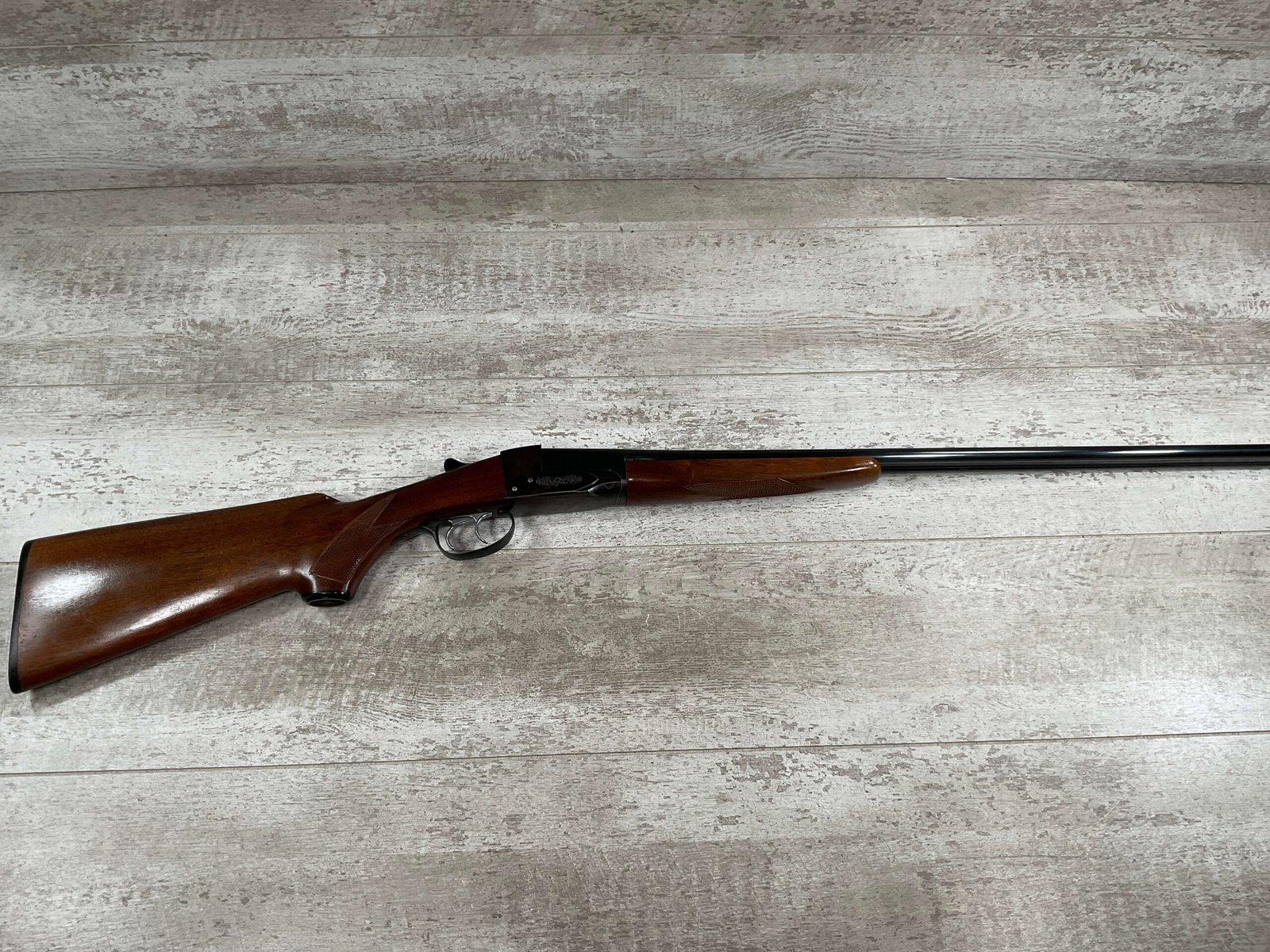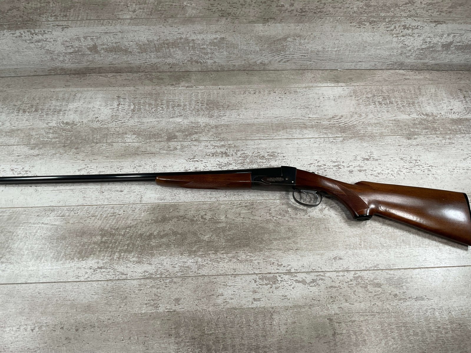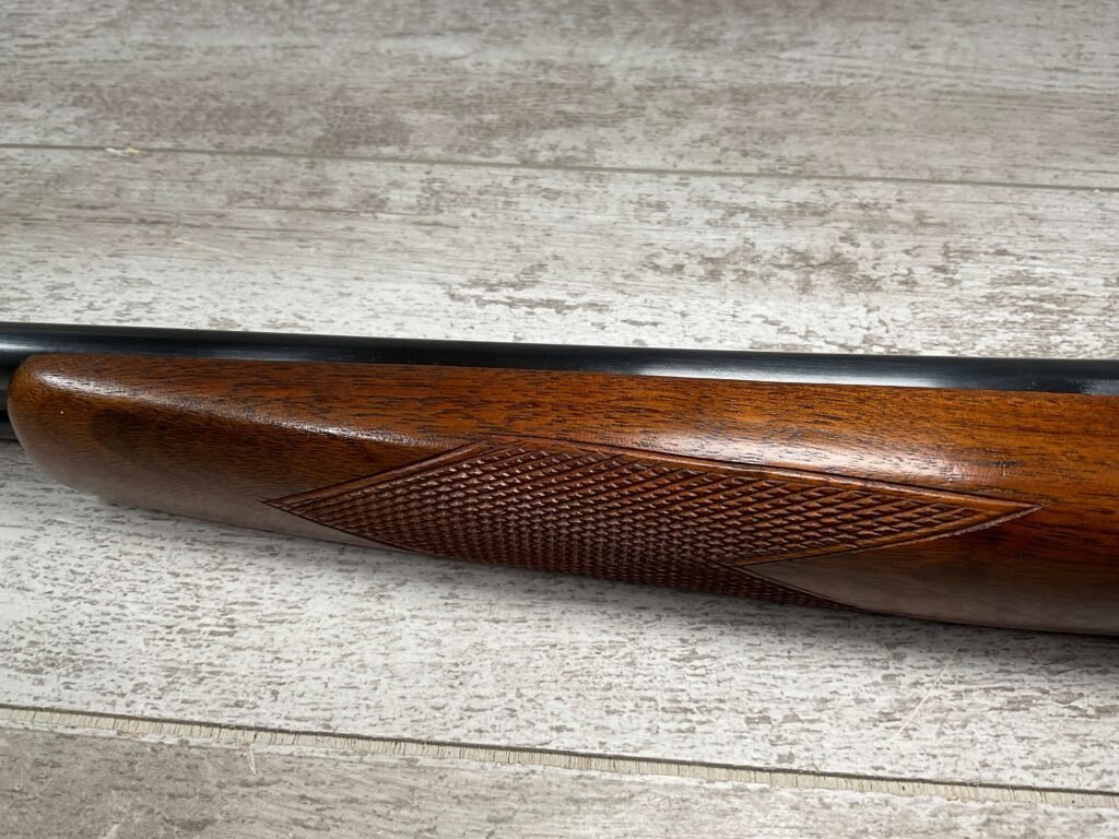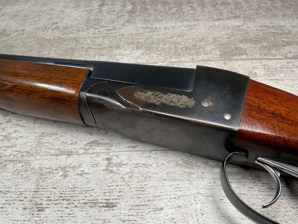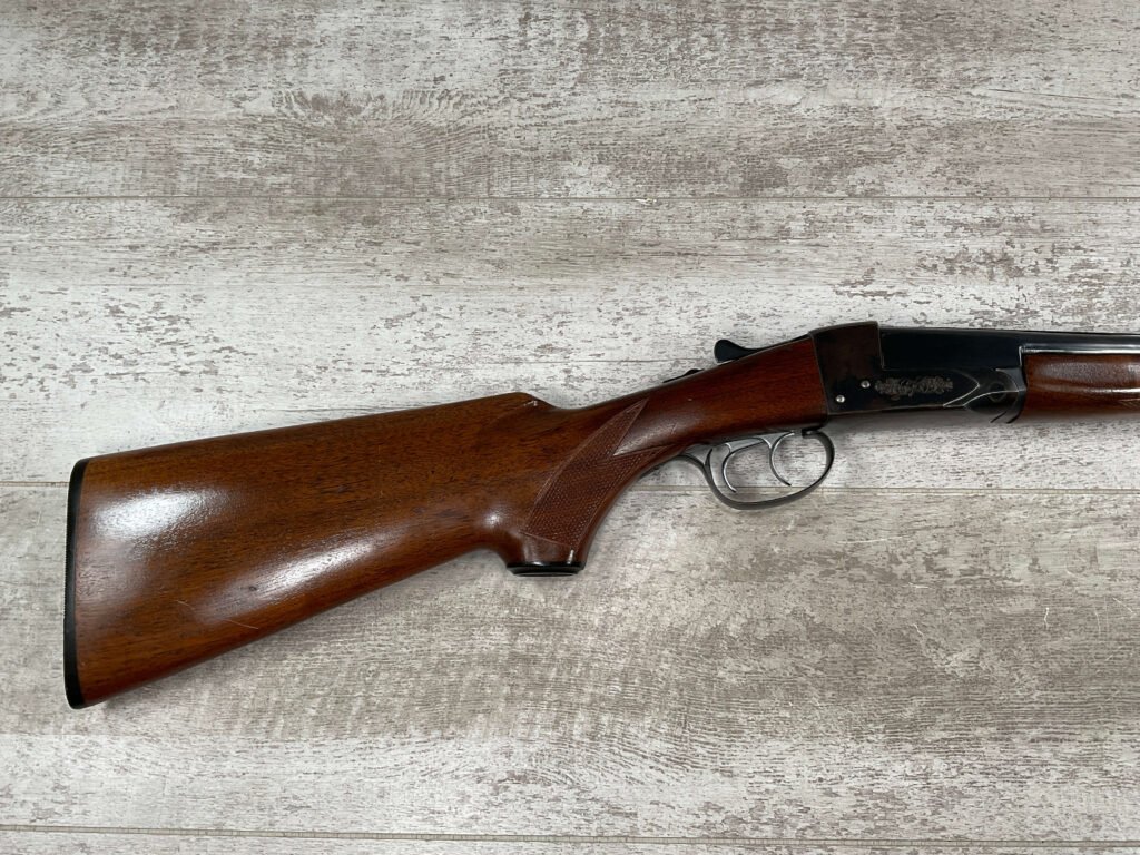FOX (SAVAGE ARMS) MODEL B .410 SXS SHOTGUNÂ #NSN, 3″ SHELLS, 26″ BBL, EXC HAND CUT CHECKERED PISTOL GRIP WALNUT STOCK W/VIRTUALY NO HANDLING MARKS, VG BLUEING TURNING PATINA THROUGHOUT ON RECEIVER, BLUE ON BARREL IS MINTY AND APPEARS REBLUED, EXC BRIGHT/MINTY BORE, BEAD FRONT SIGHT, 14″ LOP, DOUBLE TRIGGER, EXTRACTORS, ORIGINAL BLACK PLASTIC BUTT PAD, RARE .410GA SXS WILL MAKE A GREAT SHOOTER!! 90+%