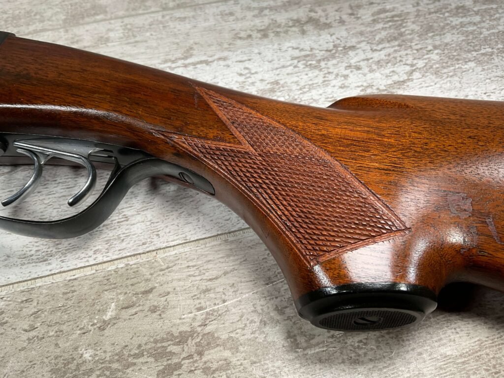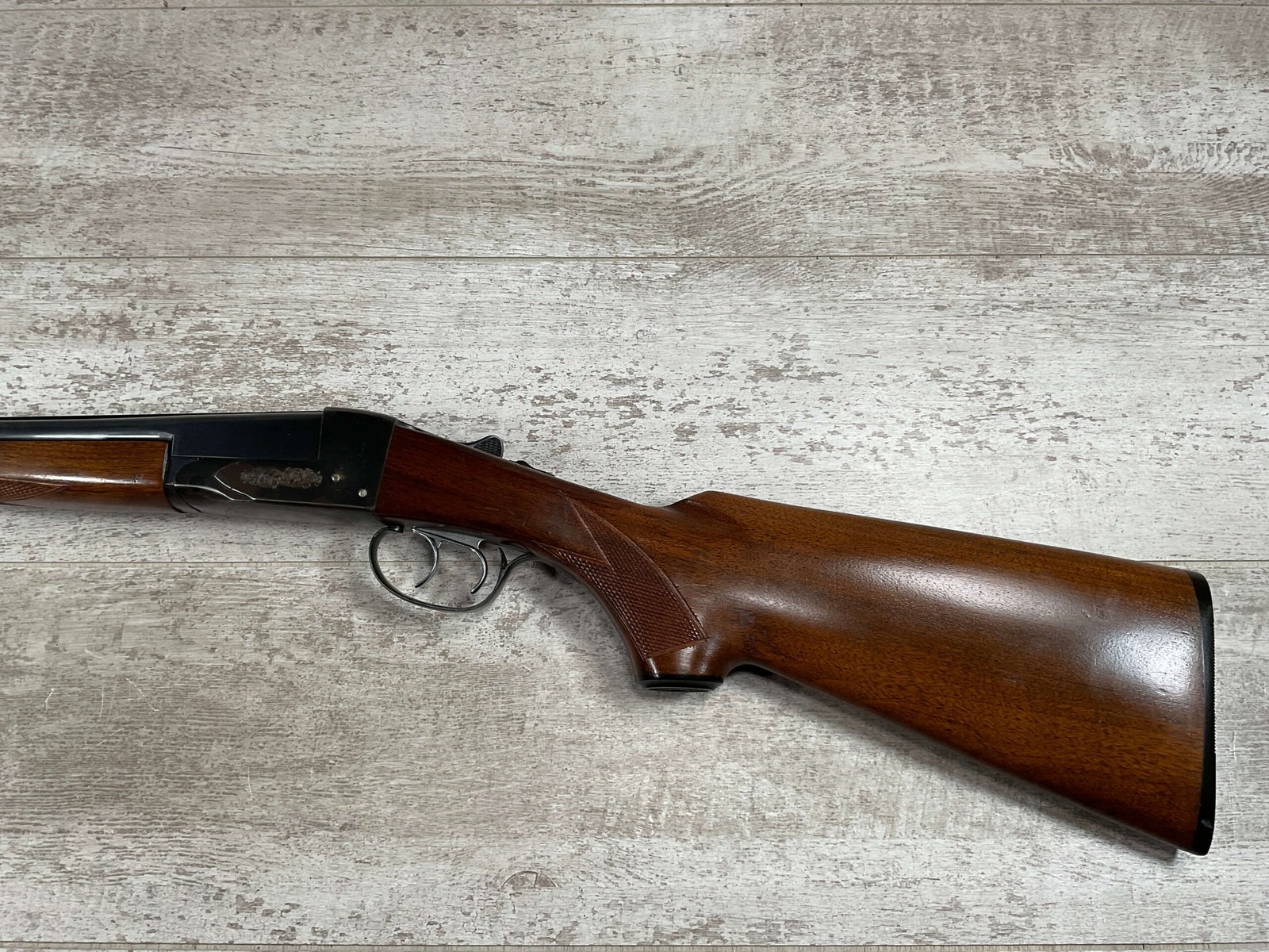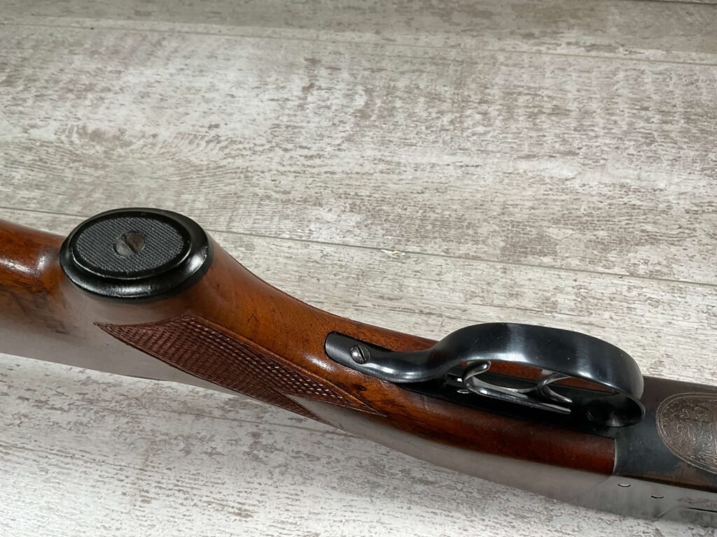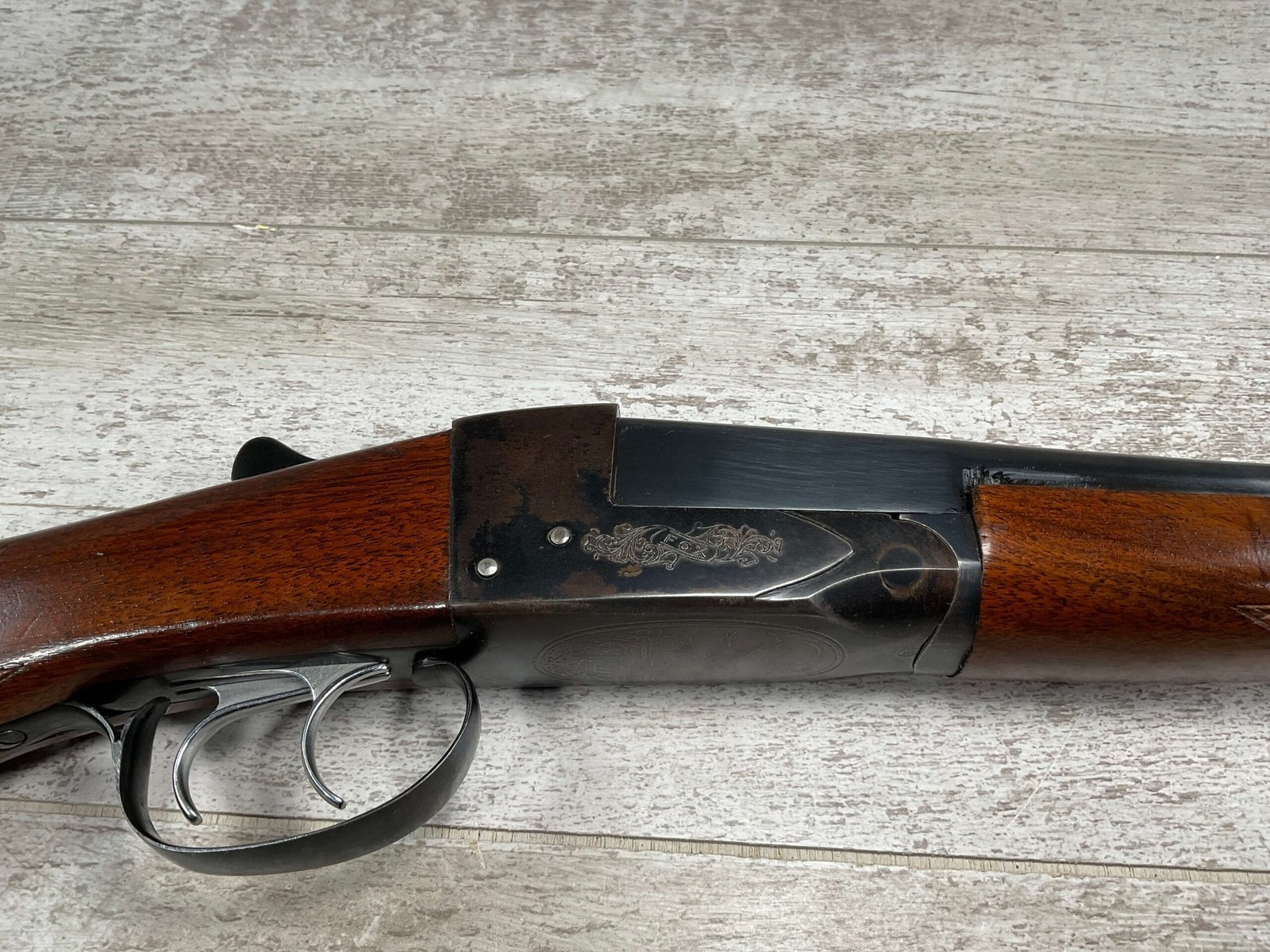 FOX (SAVAGE ARMS) MODEL B .410 SXS SHOTGUNÂ #NSN, 3″ SHELLS, 26″ BBL, EXC HAND CUT CHECKERED PISTOL GRIP WALNUT STOCK W/VIRTUALY NO HANDLING MARKS, VG BLUEING TURNING PATINA THROUGHOUT ON RECEIVER, BLUE ON BARREL IS MINTY AND APPEARS REBLUED, EXC BRIGHT/MINTY BORE, BEAD FRONT SIGHT, 14″ LOP, DOUBLE TRIGGER, EXTRACTORS, ORIGINAL BLACK PLASTIC BUTT PAD, RARE .410GA SXS WILL MAKE A GREAT SHOOTER!! 90+%