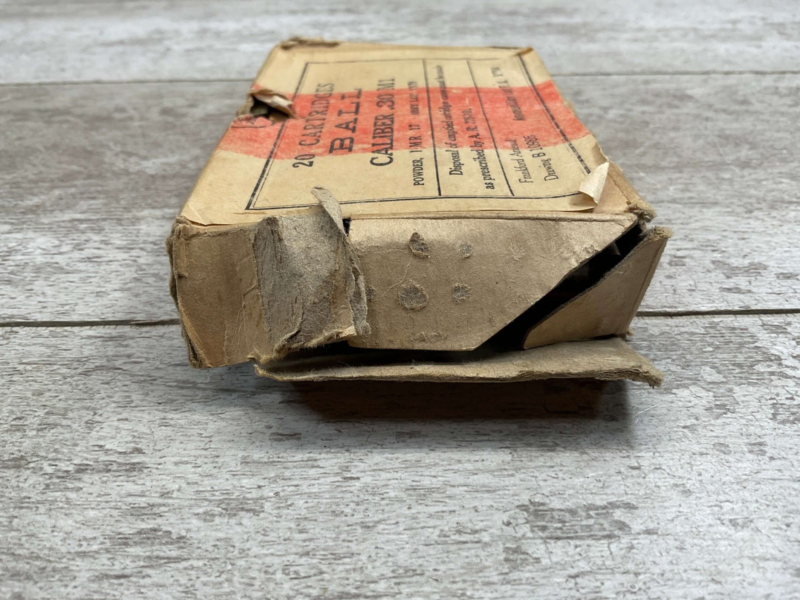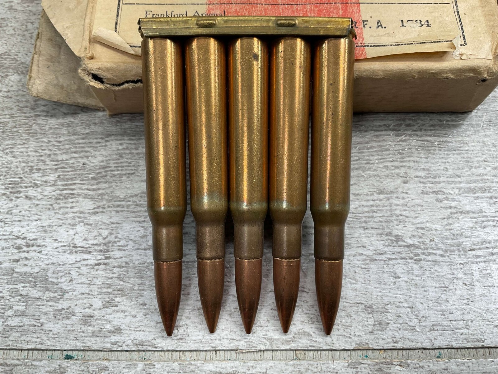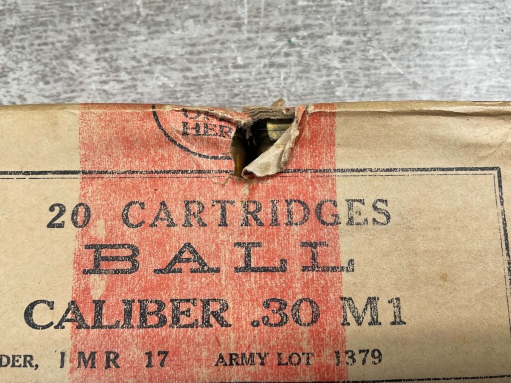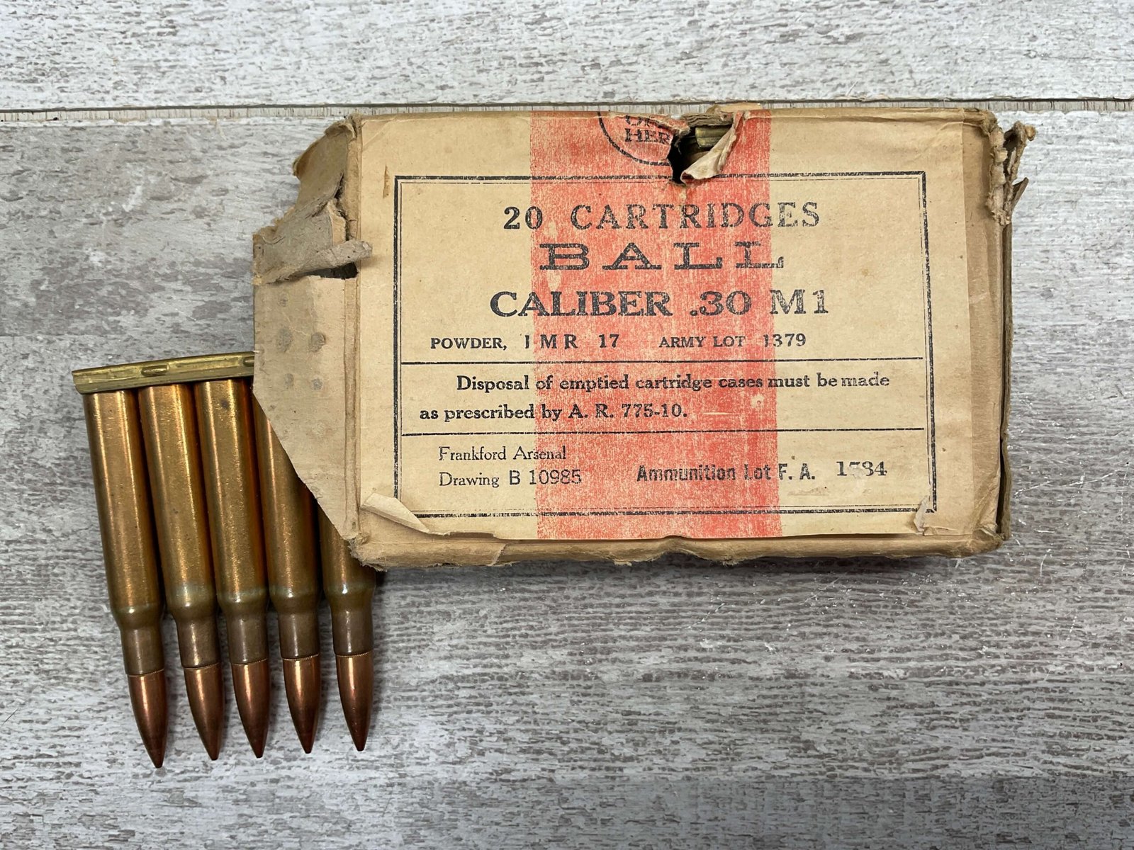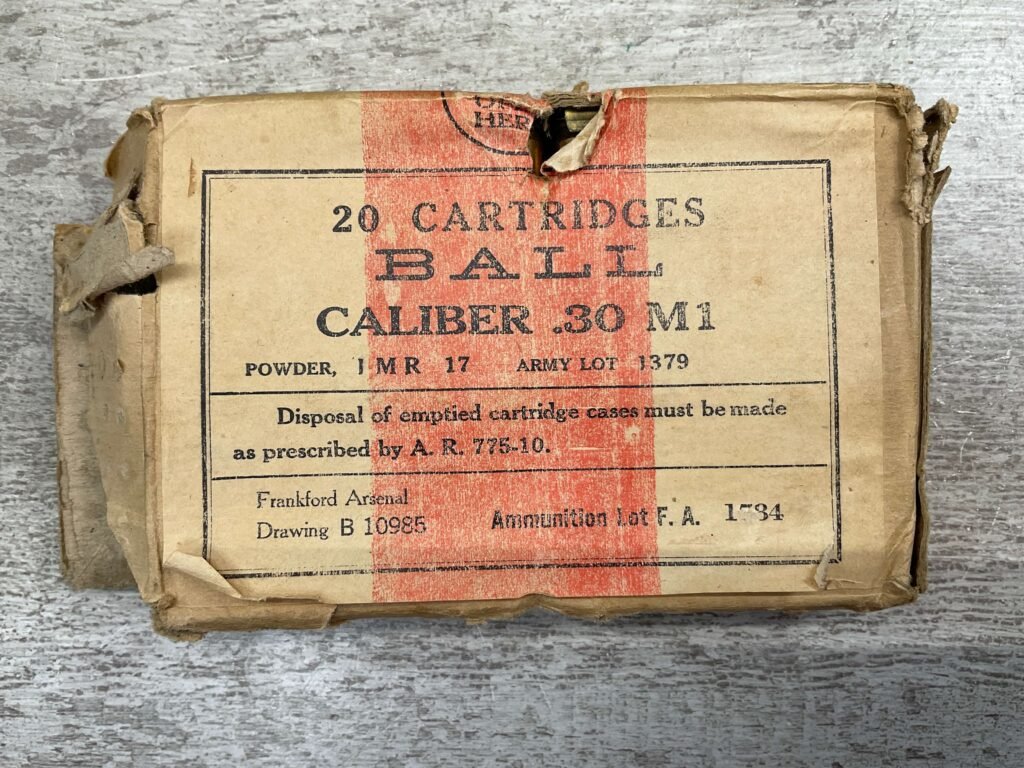 FRANKFORD ARSENAL .30 CAL M1 AMMO, FULL BOX, VINTAGE, BOX IS SLIGHTLY DAMAGED WITH ONE SIDE NOT CLOSING AND THE TOP HAVING A FEW RIPS